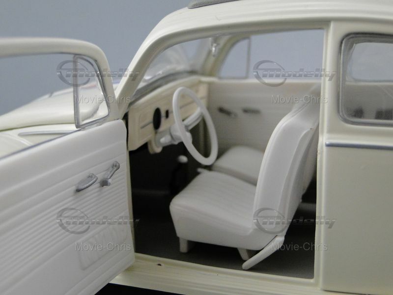 Hier sehen wir ein Miniaturmodell des Volkswagen Käfer im Maßstab 1:18, hergestellt von Johnny Lightning. Dieses Modellauto gehört zur Sammlung von Movie-Chris und ist detailreich nachgebaut. Besonderes Augenmerk liegt auf den historischen Rennlackierungen und der Startnummer 53, die dem Modell ein sportliches Erscheinungsbild verleihen. Der Miniatur-Käfer hat die typische cremefarbene Lackierung mit den blauen und roten Rennstreifen, die durch ihre Originalgetreue ins Auge stechen. Die Darstellung des Modells zeigt auch, dass keine speziellen Tuning-Teile von anderen Herstellern verwendet wurden, um den historischen Wert zu unterstreichen. Die originalen runden Scheinwerfer und die Chromstoßstangen spiegeln den Charme des Fahrzeugs wider.