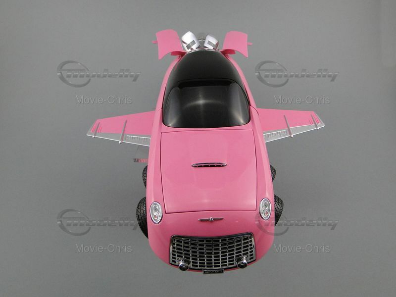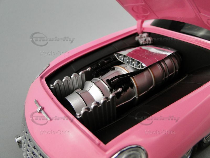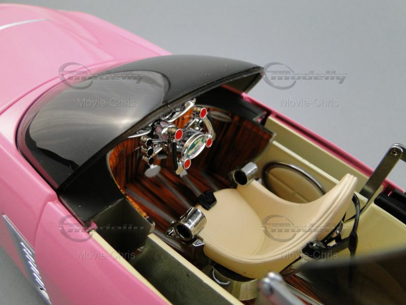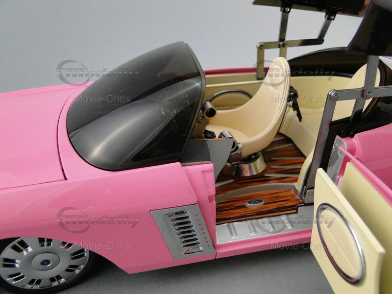 Das Modellauto von Sunstar im Maßstab 1:18 bildet die Optik des Filmfahrzeugs originalgetreu nach. Es überzeugt mit einer detaillierten Darstellung der Sechsradkonstruktion, bei der die Felgen in Chromoptik und mit einer aerodynamischen Karosserie ergänzt wurden. Die rosa Lackierung des Fahrzeugs fällt sofort ins Auge und erinnert an die Eleganz und Extravaganz des Originals. Die schwarze Targahaube, die geöffnet werden kann, enthüllt den Innenraum mit seinen edlen Details. Die cremefarbenen Sitze und die Holzelemente im Armaturenbrett verleihen dem Innenraum einen luxuriösen Touch. Eine Besonderheit ist das lenkbare Vorderrad, das die Funktionalität und den Sammlerwert des Modells erhöht.