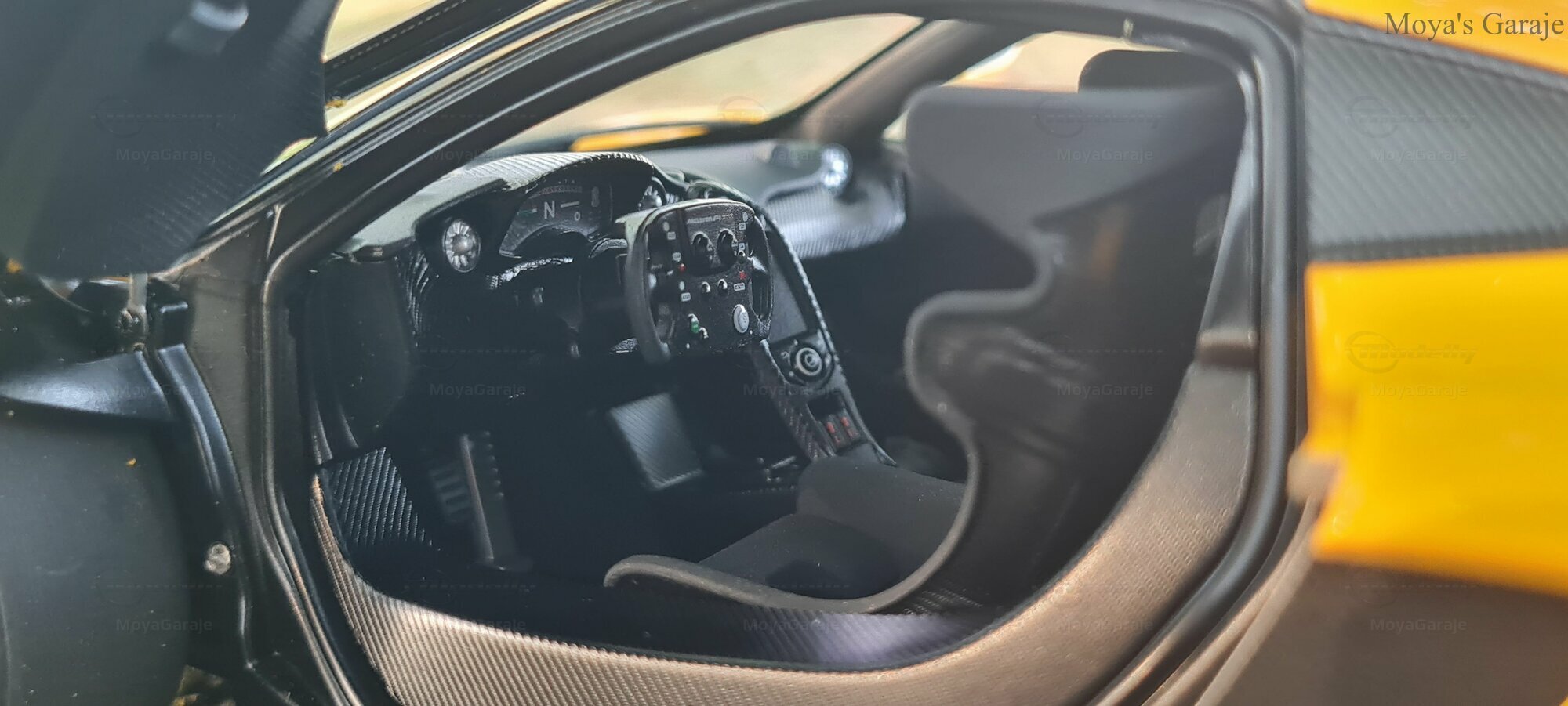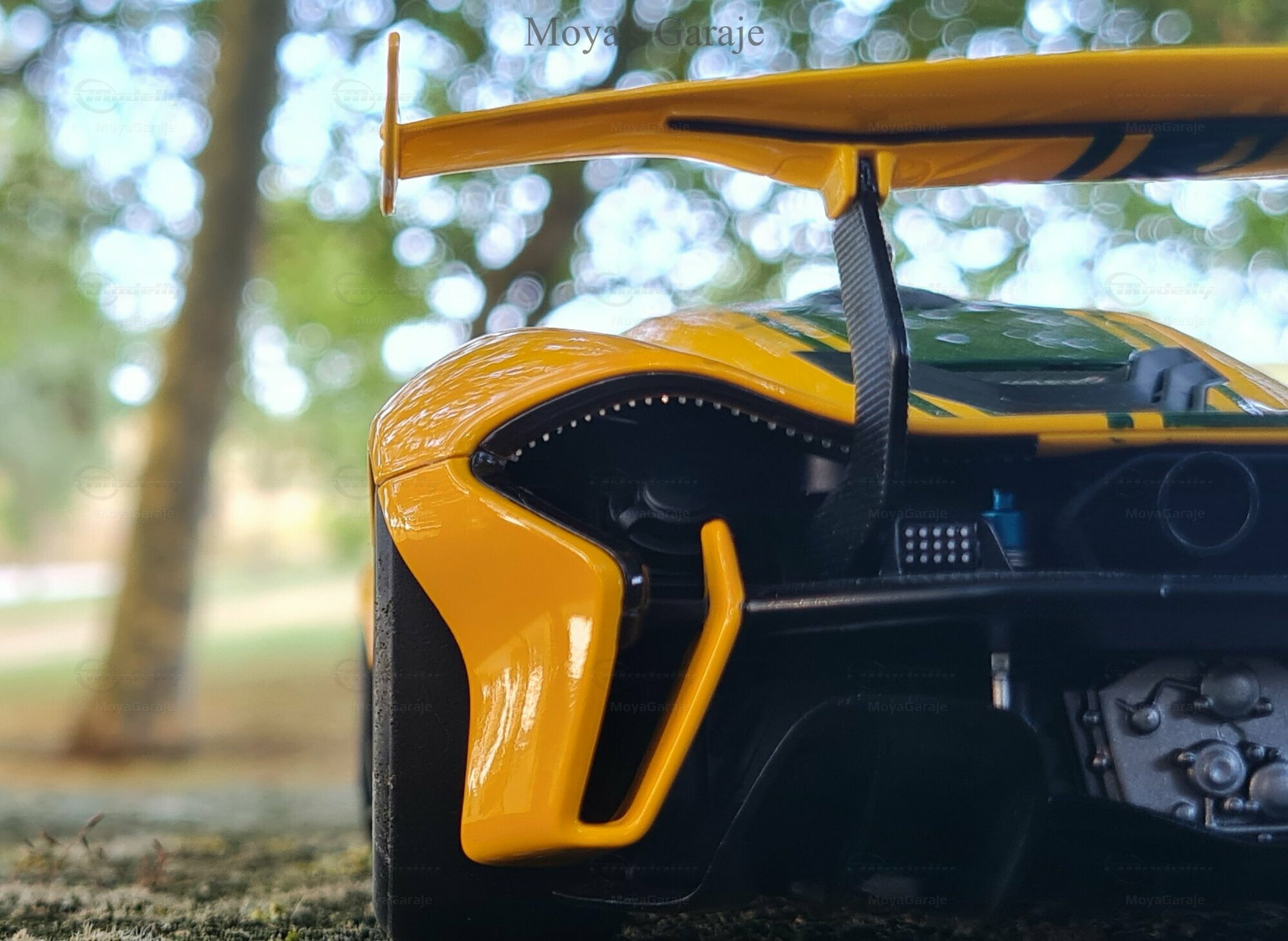 Die hier gezeigte Miniatur in 1:18 Maßstab, hergestellt von AUTOart, ist aus Resin gefertigt und Teil der Sammlung des Modelly-Mitglieds "MoyaGaraje". Die Fertigung aus Resin erlaubt eine hohe Detailgenauigkeit und Schärfe, insbesondere in komplexen Bereichen wie den Kühllufteinlässen am Heck. Das Modell glänzt durch eine präzise Nachbildung der charakteristischen Komponenten des Originals. Auffällig am Modell sind die aerodynamischen Details wie der große Heckflügel sowie die klar erkennbaren Lüftungsschlitze. Die leuchtend gelbe Lackierung des Modells wird durch grüne Streifen auf der Karosserie ergänzt, die das aggressive, rennorientierte Design des Originals aufgreifen.