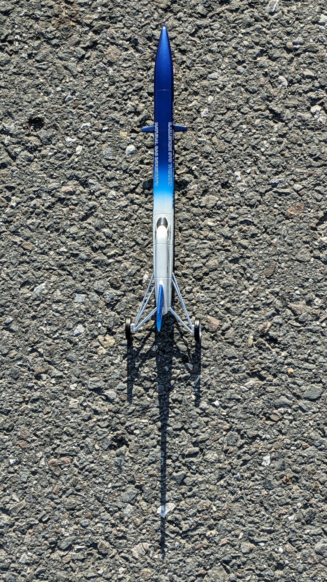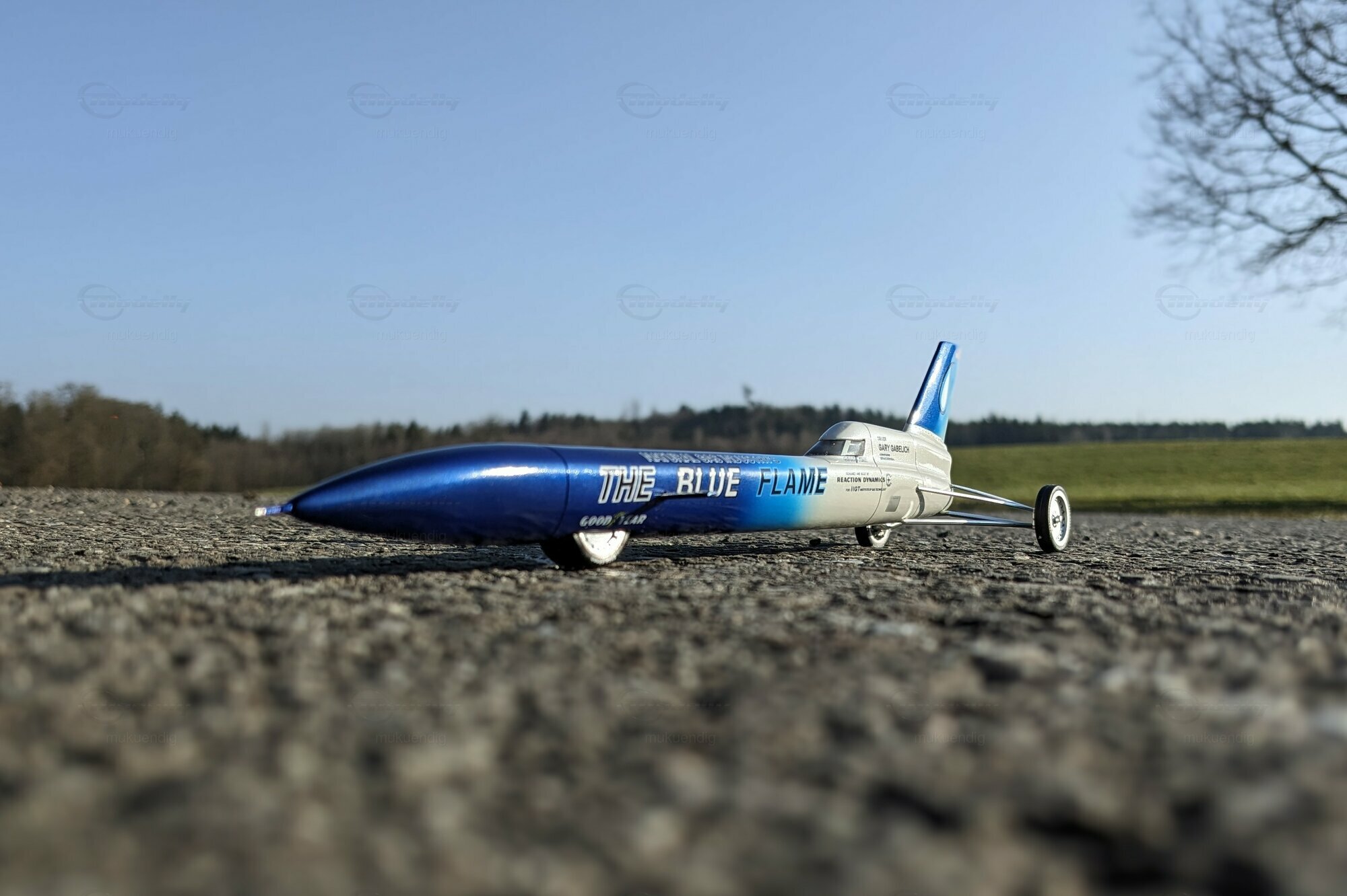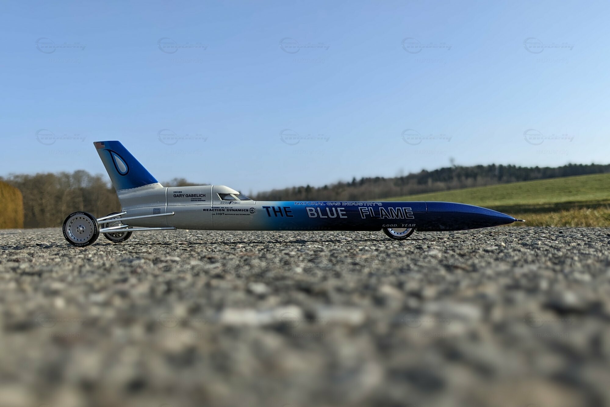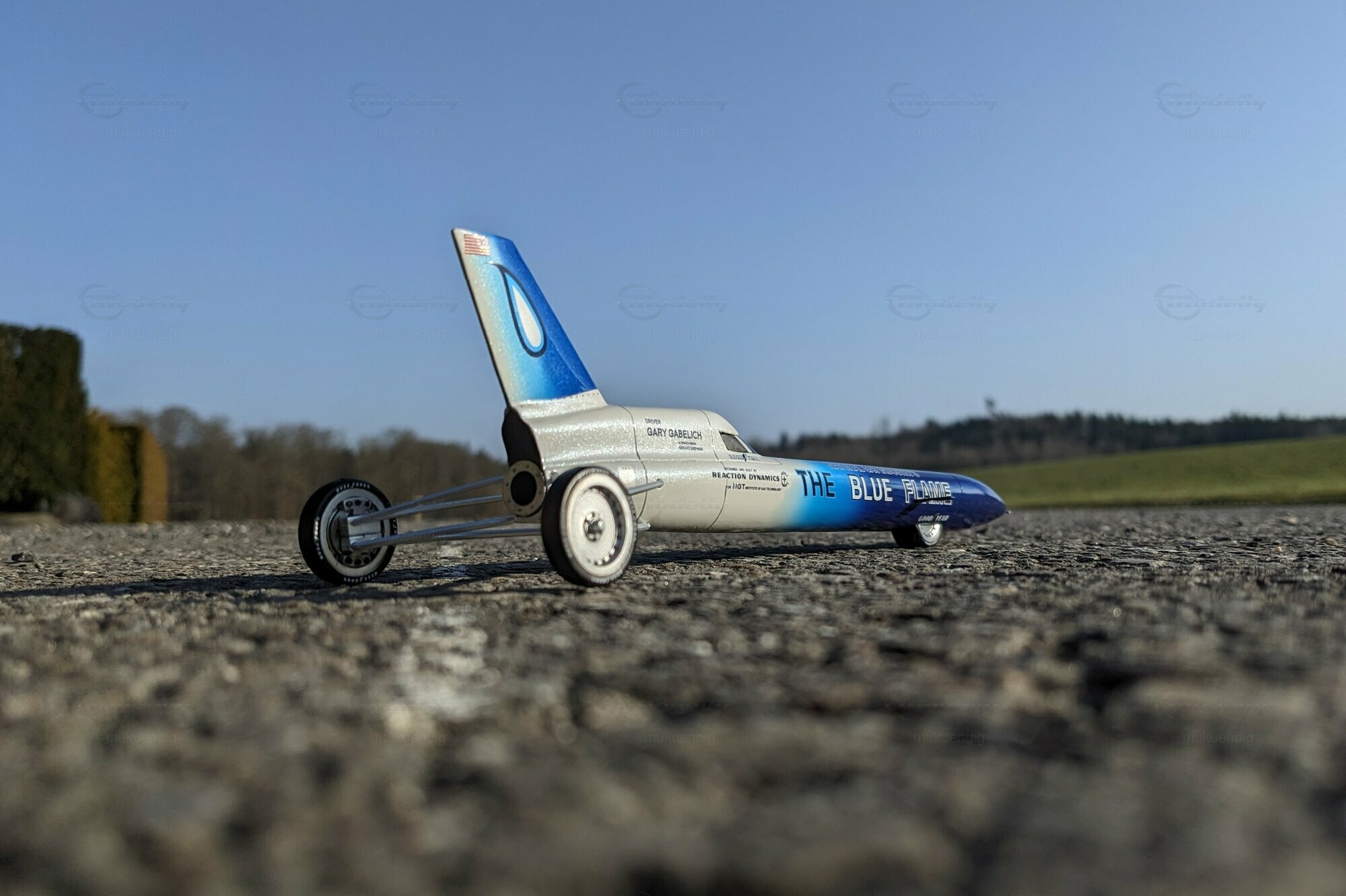 Die hier gezeigte Miniatur stammt aus der Sammlung des Modelly-Mitglieds „mukuendig“ und bildet The Blue Flame im Maßstab 1:43 nach. Es handelt sich um ein Modellauto im Maßstab 1:43 des Herstellers Bizarre. Gefertigt wurde die Miniatur aus Resin, was die saubere Umsetzung der besonders schlanken Rumpfform ermöglicht. Auf den Fotos sind der spitz zulaufende Bug, das minimalistische Cockpit und die einzeln angesetzten Ausleger der Hinterräder klar zu erkennen. Der kleine, halbverkleidete Vorderrad-Einsatz sitzt korrekt weit vorne unter dem Rumpf, was die Tricycle-Konfiguration des Vorbilds nachvollziehbar macht. Die Lackierung ist zweifarbig ausgeführt: vorn ein dunkles Metallic-Blau, das über einen Verlauf in ein helles Silber übergeht. Seitlich prangt der große Schriftzug „THE BLUE FLAME“, ergänzt durch die Natural-Gas- und Reaction-Dynamics-Markierungen sowie die Fahrerbezeichnung „Gary Gabelich“. Auf der Finne finden sich die US-Flagge und ein Tropfen-Logo, das auf den Erdgasbezug verweist. Die Felgen tragen Goodyear-Schriftzüge; die Reifen wirken maßstäblich schmal und glatt, passend zu Hochgeschwindigkeitsanwendungen. Die Proportionen erscheinen stimmig, die Trennkanten sind scharf, und die Bedruckungen sind gleichmäßig positioniert – Eigenschaften, die bei Resin-Umsetzungen wie dieser häufig technisch überzeugend gelingen. Auch der zentrale Heckauslass und die schlanke Finne sind gut konturiert, wodurch der technische Charakter von The Blue Flame nachvollziehbar bleibt.