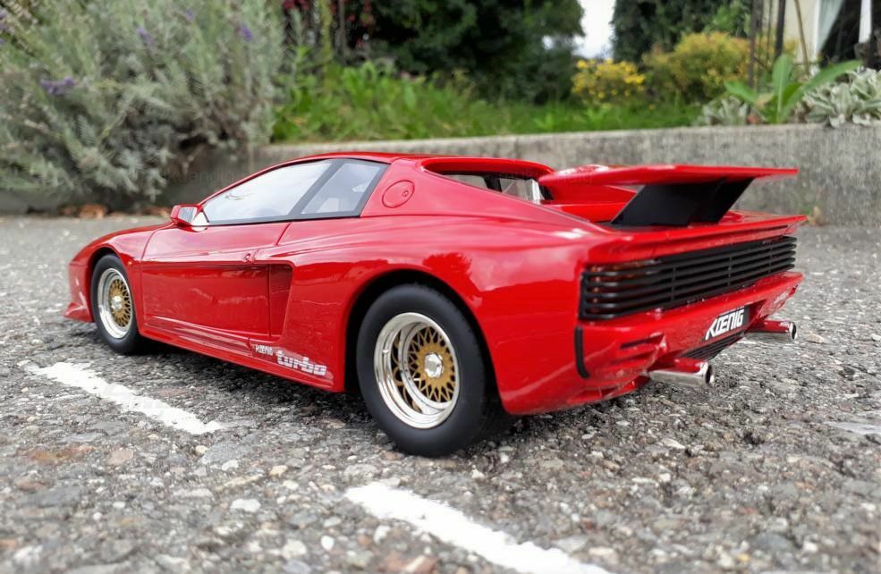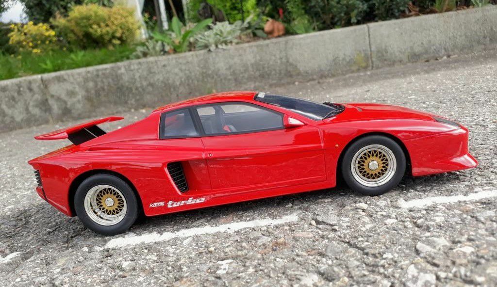 Der Testarossa wurde verbreitert und bekam Front- und Heckspoiler. Dank zweier Turbolader leistet der V12 statt 390PS nun 710PS. Damit ist der Koenig Testarossa 319 km/h schnell.