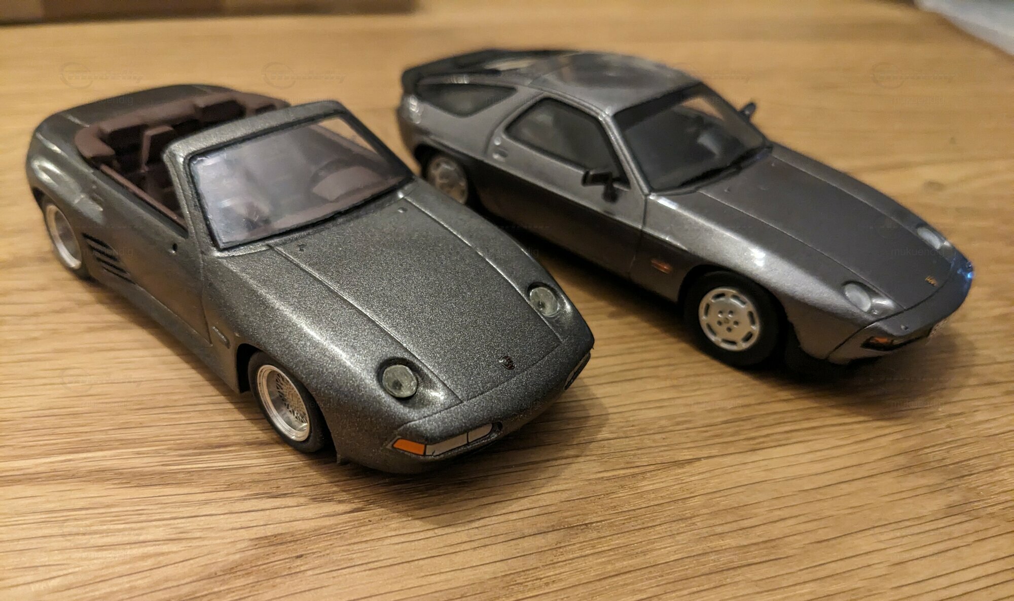 Das gezeigte Miniaturmodell orientiert sich an einem offenen Umbau des Porsche 928 S4, wie er Ende der 1980er und Anfang der 1990er Jahre von unabhängigen Karosseriebauern realisiert wurde. Porsche selbst bot den 928 nie als Cabriolet an; in der Szene sind Umbauten mit Komponenten von Strosek Auto Design verbreitet und werden teils als Jurinek/Strosek-Cabrio bezeichnet. Der Porsche 928 S4 gehört zur Baureihen-Weiterentwicklung S4, gebaut von 1987 bis 1991. Er basierte auf dem transaxle-Konzept mit vorn eingebautem V8 und an der Hinterachse sitzendem Getriebe, was eine annähernd ausgeglichene Gewichtsverteilung begünstigte. Der 5,0‑Liter‑Vierventil‑V8 leistete in Europa rund 320 PS (235 kW) und bot etwa 430 Nm Drehmoment. Wahlweise kamen ein manuelles Fünfganggetriebe oder eine Vierstufen-Automatik zum Einsatz. Technisch kennzeichnend waren die Weissach-Achse mit passiver Hinterachs-Eigenlenkung, ABS-Bremsen und eine im Vergleich zu den Vorgängern 928/928 S optimierte Aerodynamik. Die Gestaltung des Grundtyps entstand unter Anatole Lapine gemeinsam mit Wolfgang Möbius; die Gesamtentwicklung der Baureihe wurde im Porsche-Entwicklungszentrum unter Leitung von Helmuth Bott vorangetrieben. Zur zeitlichen Einordnung: 1987, dem Einführungsjahr der S4-Generation, ereigneten sich der Börsencrash „Black Monday“, die Unterzeichnung des INF-Vertrags zwischen Ronald Reagan und Michail Gorbatschow sowie die Veröffentlichung des Albums „The Joshua Tree“ von U2. Diese Beispiele dienen lediglich dazu, Alter und Kontext des Fahrzeugs besser einzuordnen.