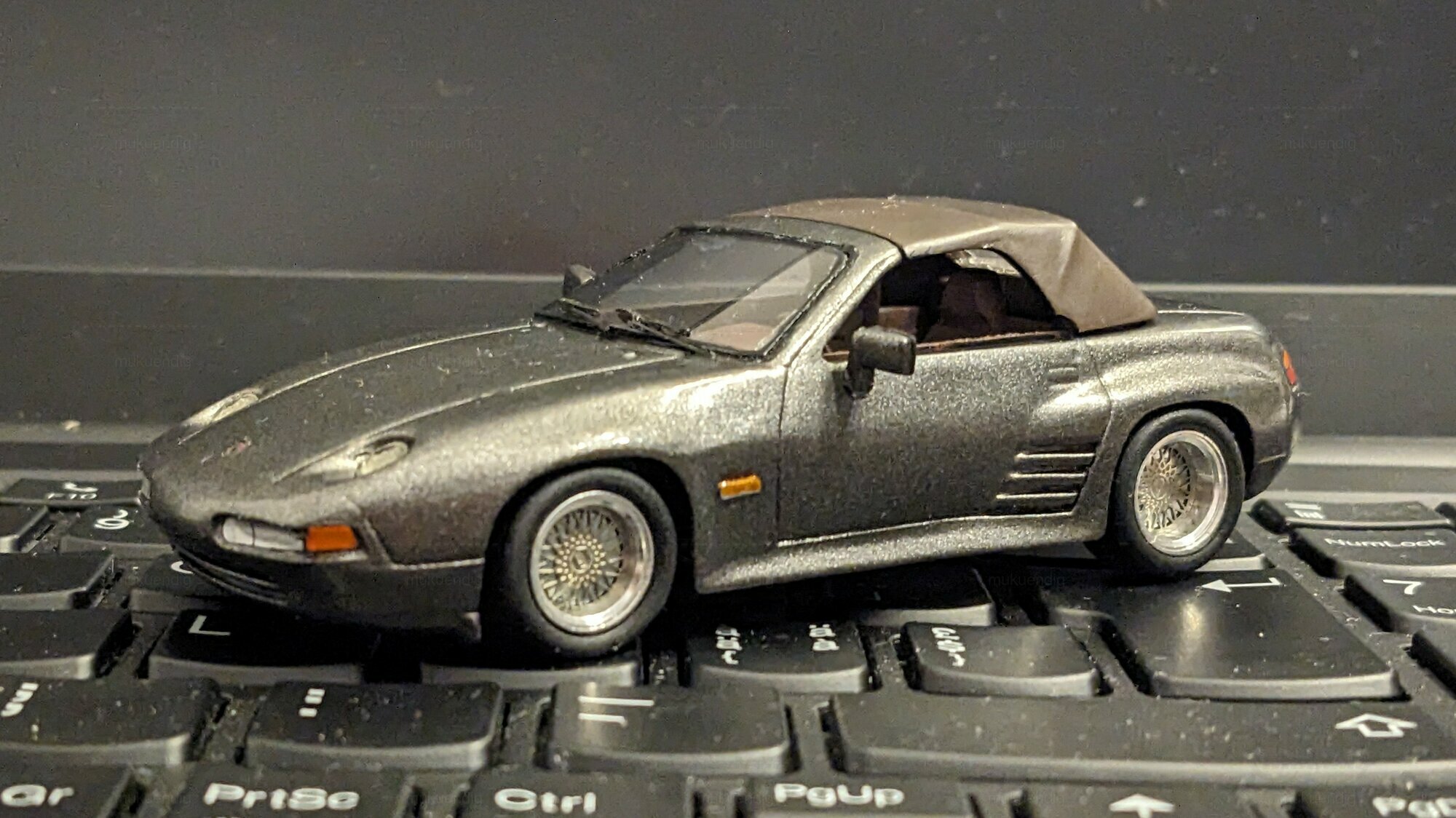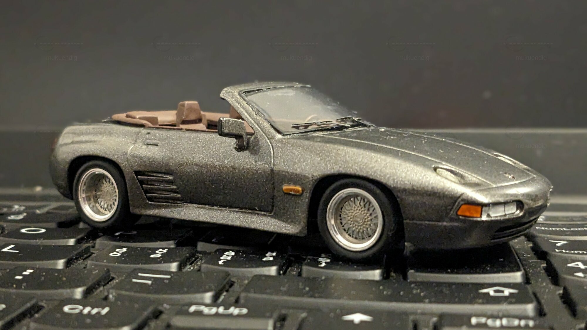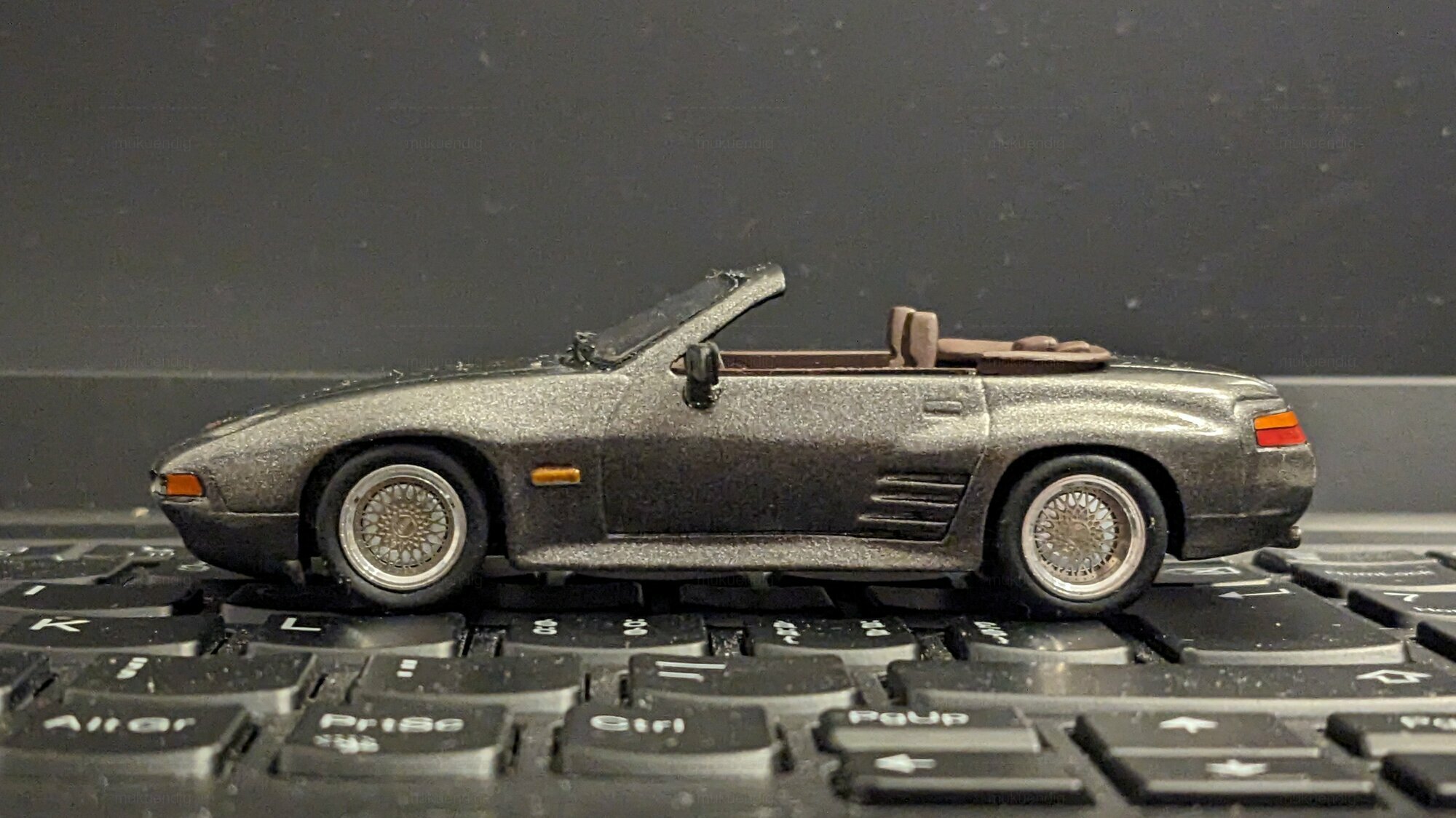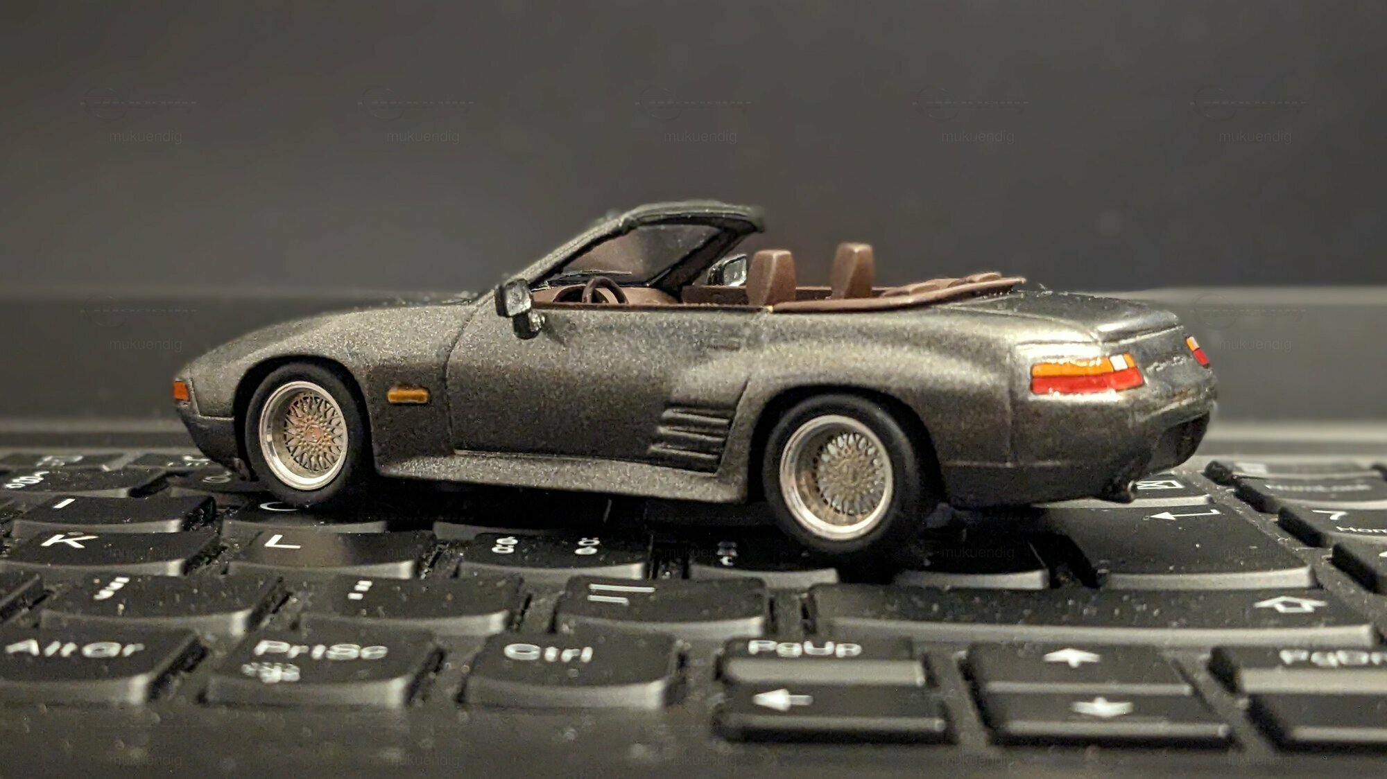 In den Fotos ist ein Modellauto im Maßstab 1:43 von MOG Modèles zu sehen, das sich an einem solchen 928 S4 Cabrio-Umbau orientiert. Das Exemplar gehört zur Sammlung des Modelly-Mitglieds „mukuendig“. Gefertigt ist die Miniatur aus Resin, also einem Guss-Harz, das präzise Oberflächenkonturen ermöglicht und in Kleinserien verwendet wird. Die Front des Modells greift die für Strosek-Umbauten typischen fließenden Stoßfänger-Linien mit breiter Lufteinlassöffnung auf; seitlich sind die markanten, horizontalen Schlitze vor der Hinterachse ausgeformt. Die Scheinwerfer des Porsche 928 S4 sind im Original versenkbar; das Modell zeigt die Abdeckungen in geschlossener Stellung. Orangefarbene Blinker und eine dezent gedruckte Porsche-Wappenapplikation auf der Haube geben Orientierungspunkte. Auffällig ist das Interieur in Braun mit gut erkennbaren Sitzen im 2+2‑Layout. Die Felgen erscheinen als feine Kreuzspeichen-Designs mit polierten Betten; eine eindeutige Zuordnung zu einem Hersteller ist anhand der Bilder nicht möglich. Das gezeigte Exemplar besitzt zwei Darstellungsvarianten: offen mit flacher Abdeckung hinter den Sitzen sowie mit separat aufgesetztem Softtop in einem braunen Farbton, das die Linienführung des Umbaus nachvollzieht. Die Lackierung wirkt als dunkles Metallic-Grau mit gleichmäßigem Glanz und sauber gesetzten Spaltkanten. Türen, Spiegel und Leuchten sind klar abgegrenzt; die seitlichen Markierungsleuchten sind farblich hinterlegt. Das Modellauto im Maßstab 1:43 von MOG Modèles bildet damit wesentliche Details des realen Umbaus erkennbar ab, ohne unnötige Effekte einzusetzen.