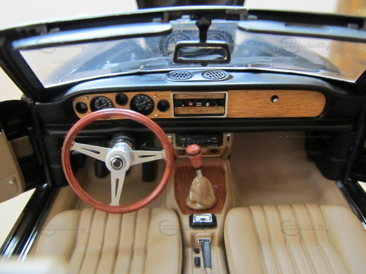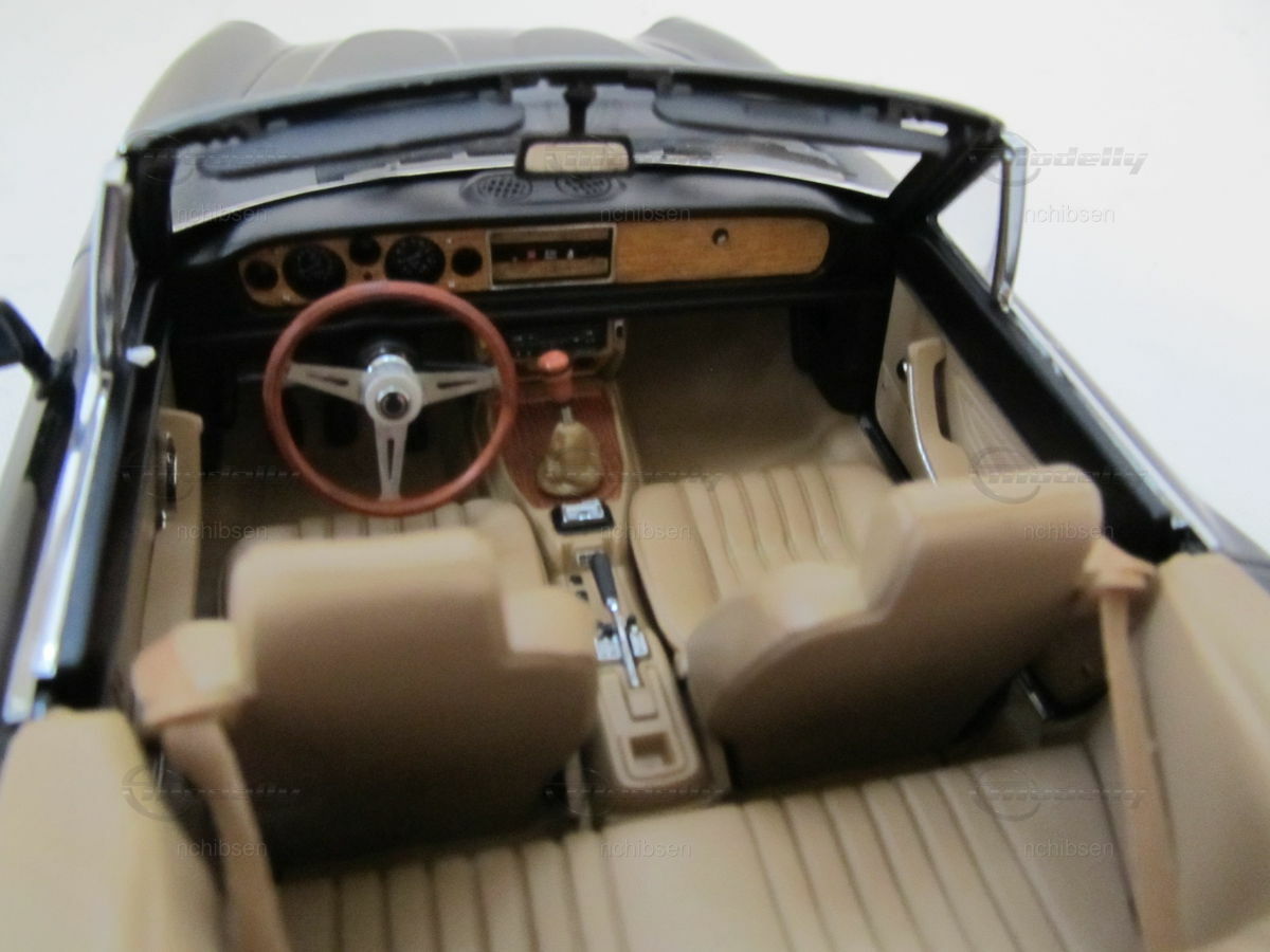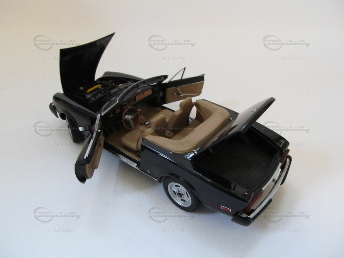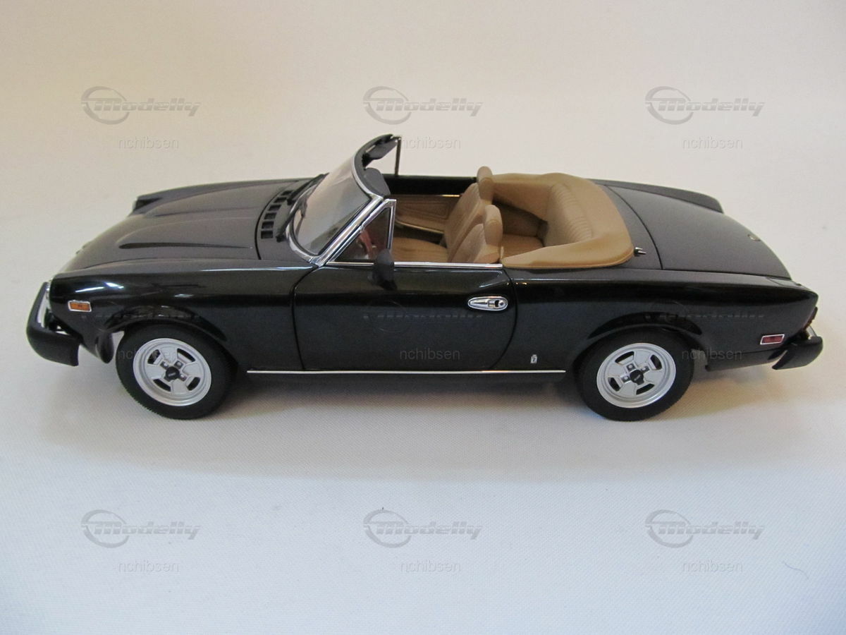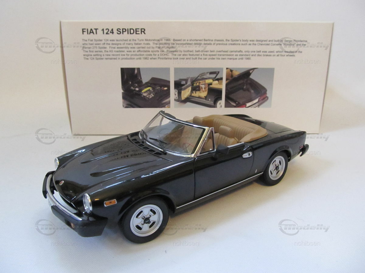 Das Modellauto des Fiat 124 Spider, das hier im Maßstab 1:18 von AUTOart Millennium präsentiert wird, ist ein wahres Meisterwerk der Modellbaukunst. Diese im Besitz von Modelly-Mitglied "nchibsen" befindliche Miniatur besticht durch präzise Detailverliebtheit und hochqualitative Verarbeitung. Der Hersteller setzt auf die Verwendung von Diecast-Material, um höchste Qualität und Realismus zu gewährleisten. Vom originalgetreuen Design des Kühlergrills bis hin zu den feinen Lederimitationen der Sitze ist jedes Detail sorgfältig nachgebildet. Die lackierte Oberfläche in Glanzschwarz hebt die Eleganz des Modells hervor und lässt es besonders authentisch wirken. Auf den Felgen, vermutlich aus der Produktion der originalgetreuen Nachbildung von Campagnolo, prangen die berühmten Markenlogos, die dem Modell ein zusätzliches Maß an Authentizität verleihen.