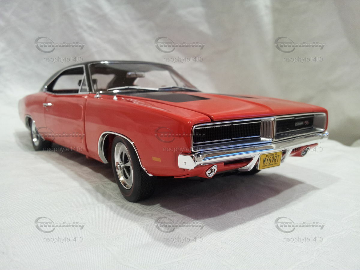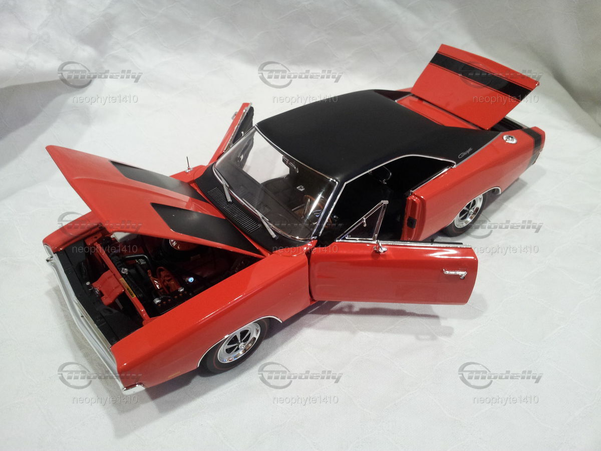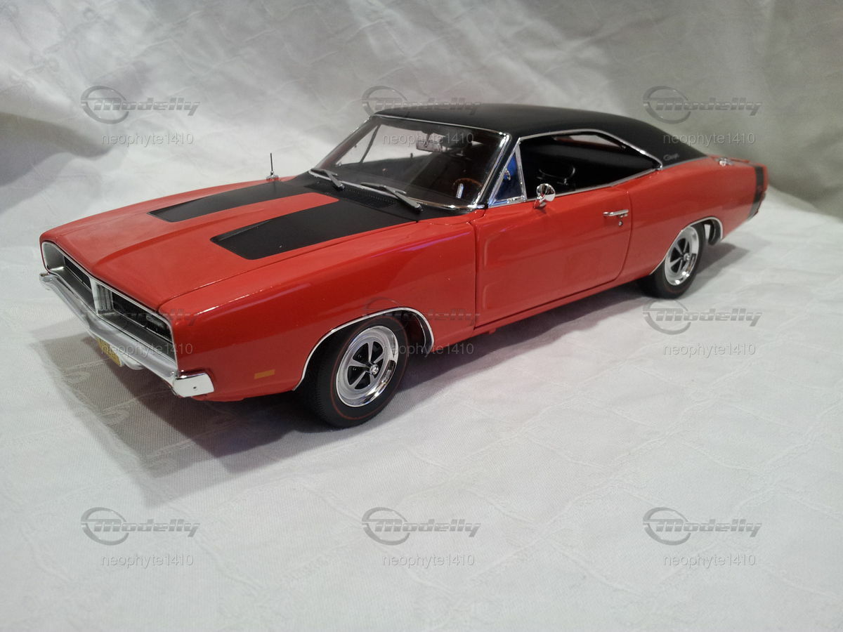 Das hier gezeigte Modellauto in 1:18 Maßstab, hergestellt von Ertl / Autoworld, stellt den Dodge Charger R/T detailgetreu dar und ist Teil der Sammlung von Modellbau-Enthusiasten "neophyte1410". Dieses Modellauto zeigt eine Vielzahl von Merkmalen des Originals, einschließlich der markanten Fahrzeuglinien, der charakteristischen Frontgrillkonstruktion sowie der stilvollen Heckpartie. Die leicht erkennbare „R/T“-Badges auf der Heckklappe und den hinteren Kotflügeln sowie die präzise gestalteten Rückleuchten und Auspuffrohre fangen den Charme des Originals perfekt ein.