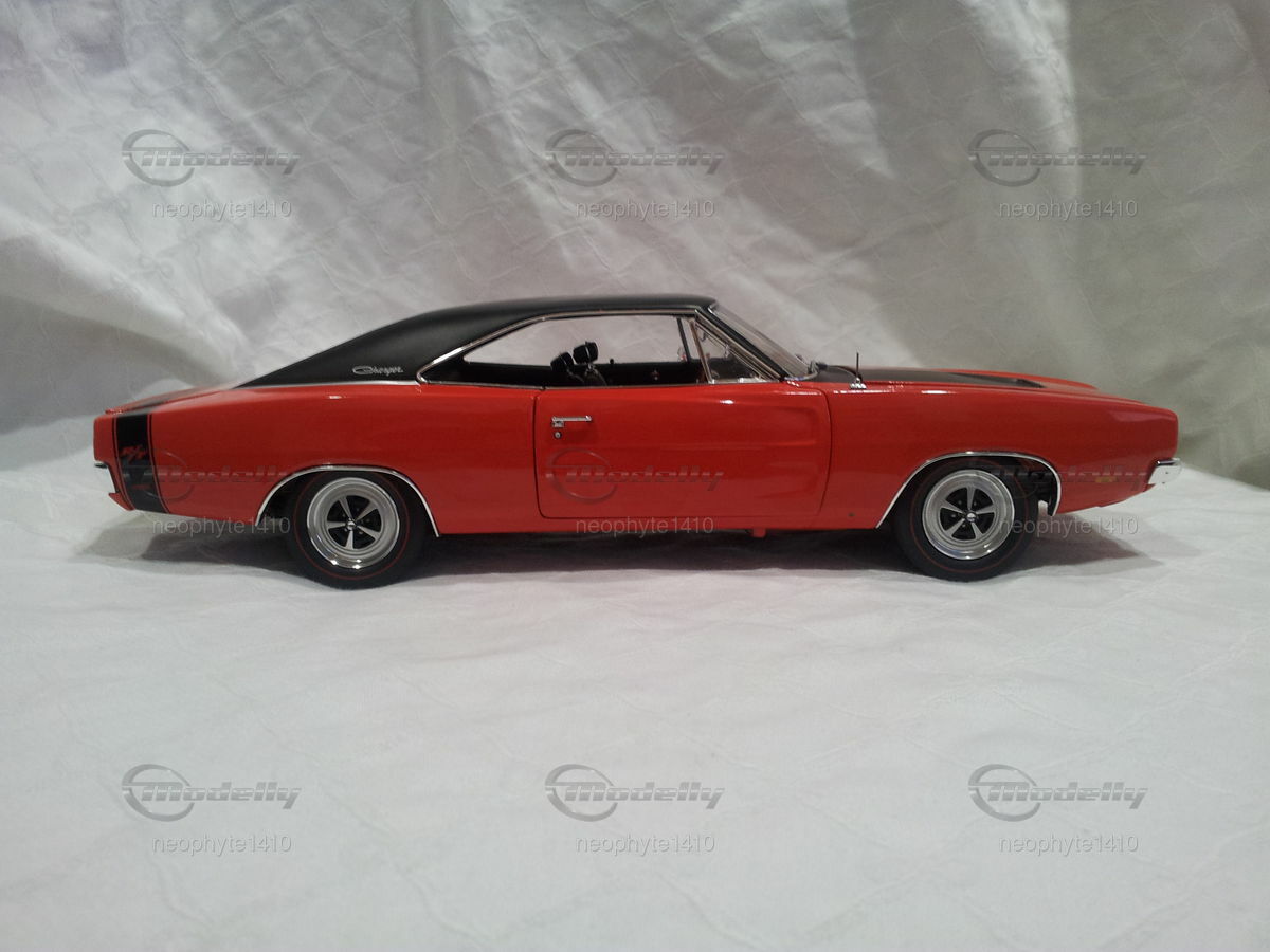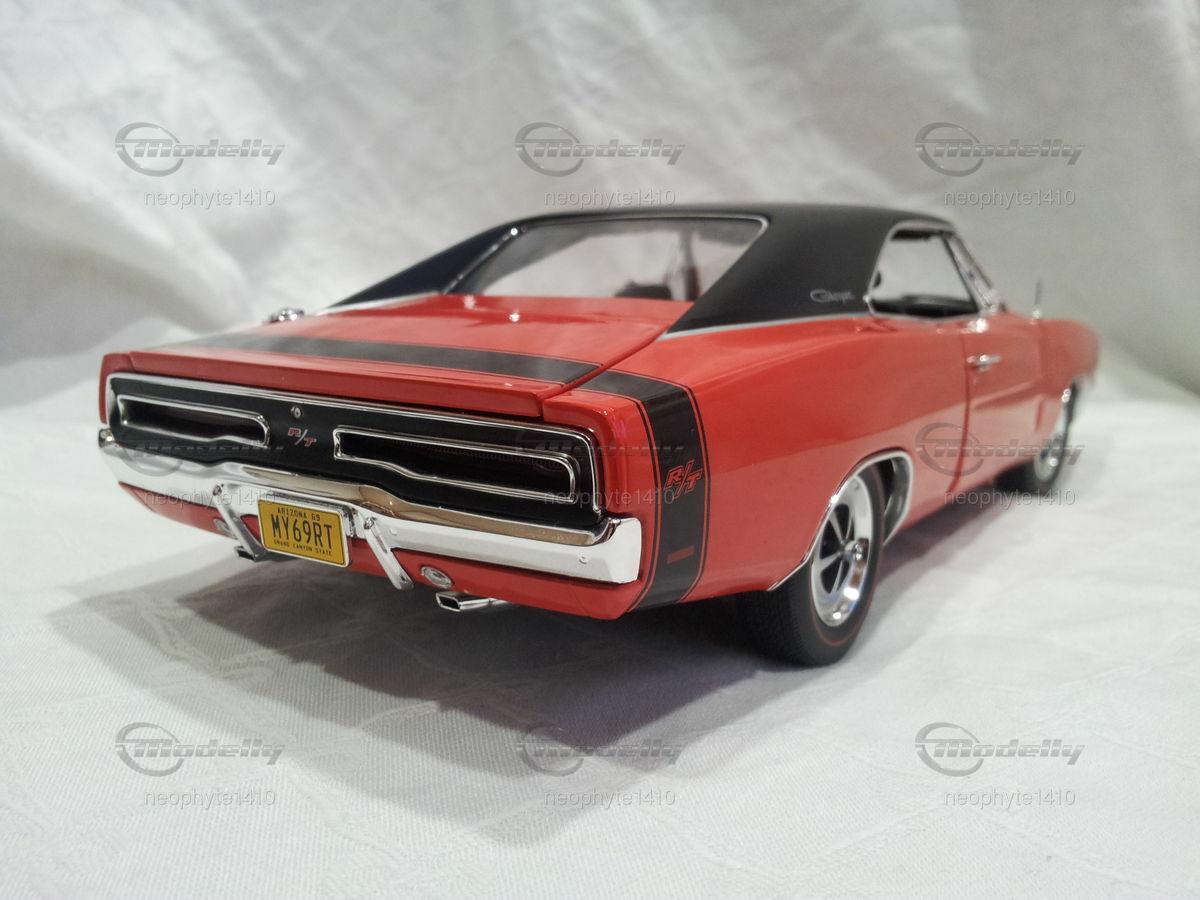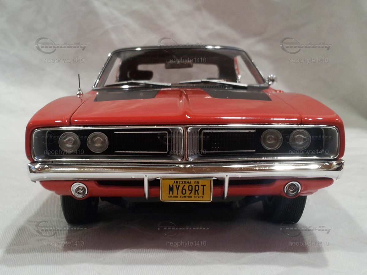 Das hier gezeigte Modellauto in 1:18 Maßstab, hergestellt von Ertl / Autoworld, stellt den Dodge Charger R/T detailgetreu dar und ist Teil der Sammlung von Modellbau-Enthusiasten "neophyte1410". Dieses Modellauto zeigt eine Vielzahl von Merkmalen des Originals, einschließlich der markanten Fahrzeuglinien, der charakteristischen Frontgrillkonstruktion sowie der stilvollen Heckpartie. Die leicht erkennbare „R/T“-Badges auf der Heckklappe und den hinteren Kotflügeln sowie die präzise gestalteten Rückleuchten und Auspuffrohre fangen den Charme des Originals perfekt ein.