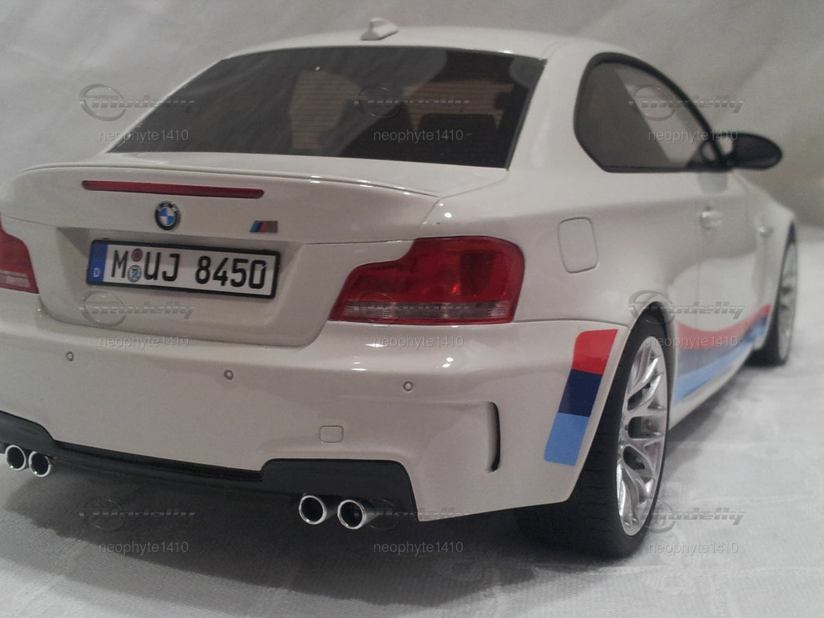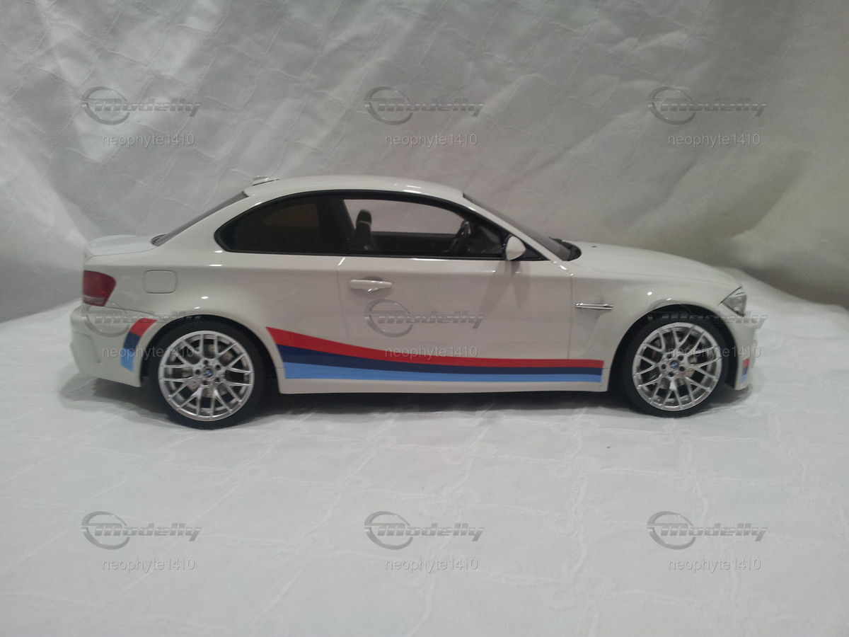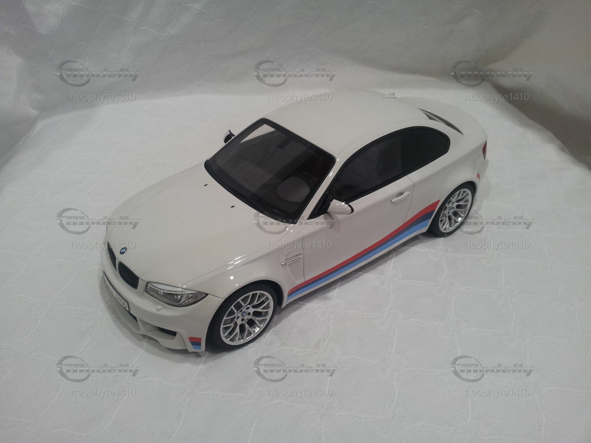 Dieses detaillierte Modellauto im Maßstab 1:18 der Firma GT Spirit ist ein prachtvolles Abbild des originalen BMW 1er M Coupé (E82). Modellly Mitglied "neophyte1410" hat in seiner Sammlung ein besonders schönes Stück erworben. Die Lackierung des Modells ist in einem eleganten Weiß gehalten, ergänzt durch die markanten BMW M-Performance-Streifen in Blau, Hellblau und Rot an den Seiten sowie am Heck. Die sorgfältig nachgebildeten Leichtmetallfelgen und die sportlichen Vierrohrauspuffanlagen betonen die sportliche Ästhetik des Fahrzeugs. Besondere Aufmerksamkeit wurde dem Fahrzeugemblem und den feinen Details wie den Lufteinlässen und Bremsen geschenkt.