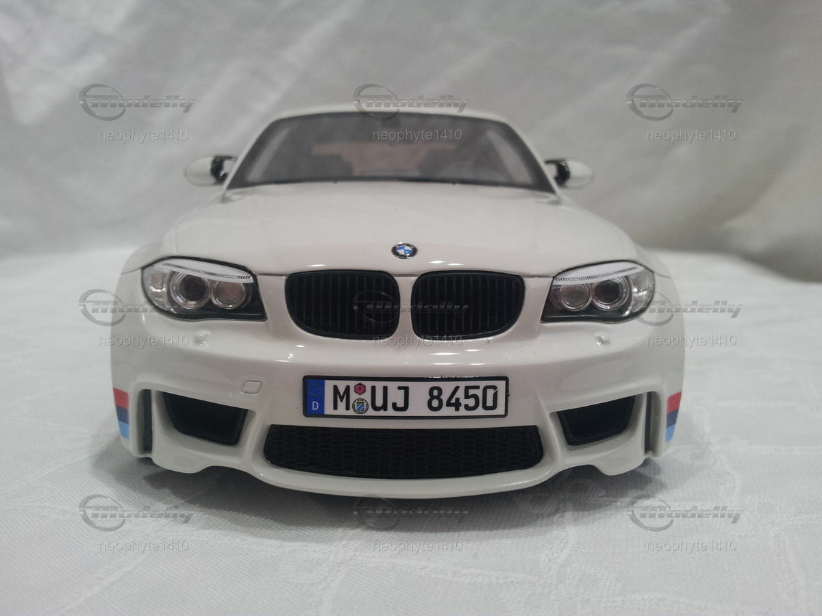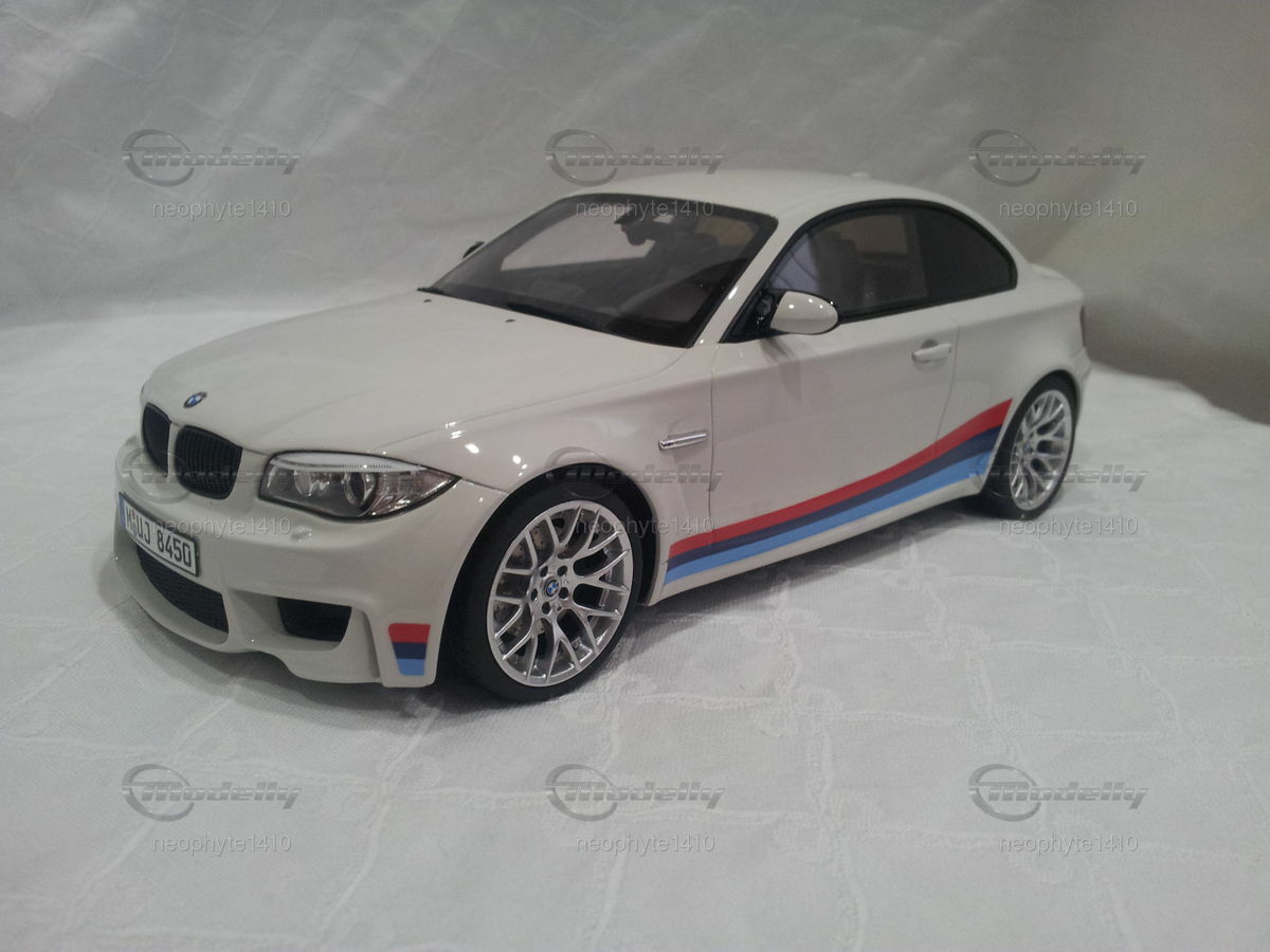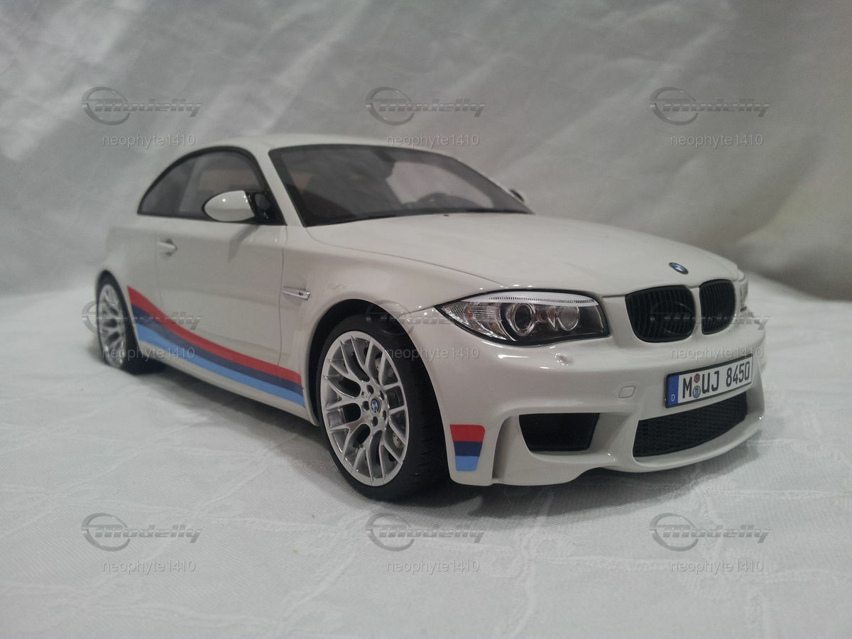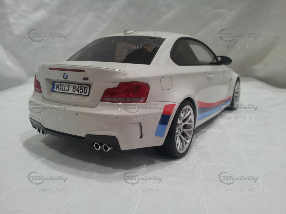 Dieses detaillierte Modellauto im Maßstab 1:18 der Firma GT Spirit ist ein prachtvolles Abbild des originalen BMW 1er M Coupé (E82). Modellly Mitglied "neophyte1410" hat in seiner Sammlung ein besonders schönes Stück erworben. Die Lackierung des Modells ist in einem eleganten Weiß gehalten, ergänzt durch die markanten BMW M-Performance-Streifen in Blau, Hellblau und Rot an den Seiten sowie am Heck. Die sorgfältig nachgebildeten Leichtmetallfelgen und die sportlichen Vierrohrauspuffanlagen betonen die sportliche Ästhetik des Fahrzeugs. Besondere Aufmerksamkeit wurde dem Fahrzeugemblem und den feinen Details wie den Lufteinlässen und Bremsen geschenkt.