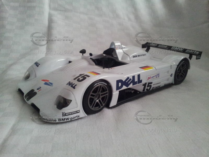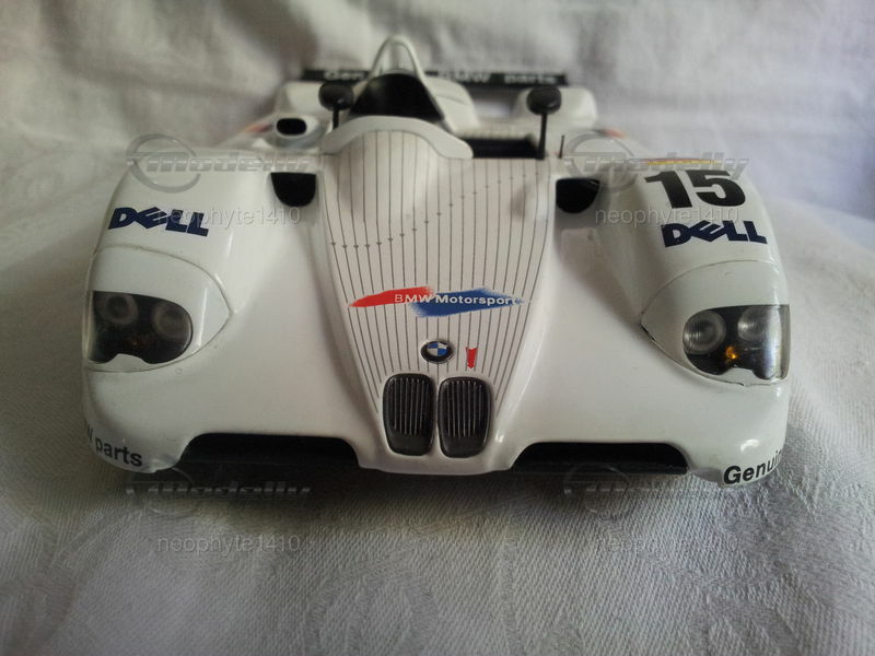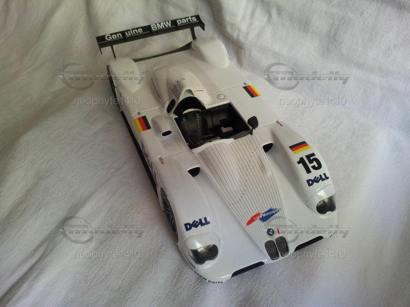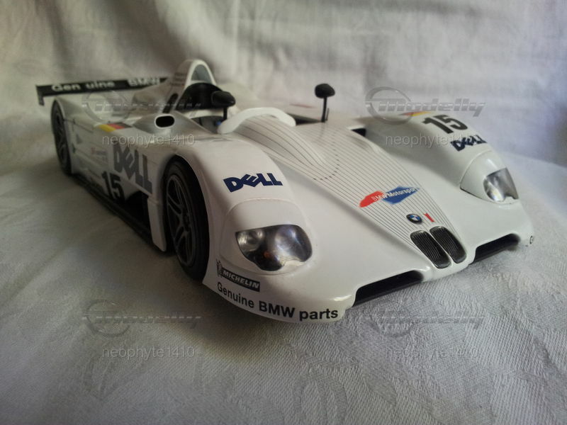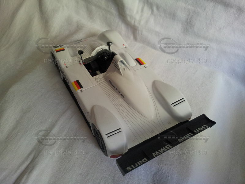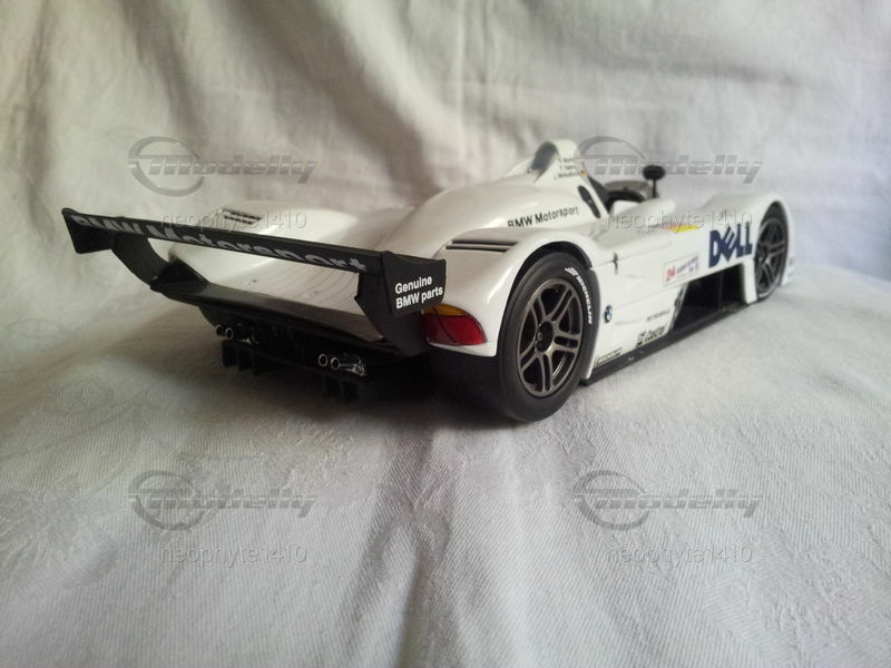 Das 1:18 Modellauto des BMW V12 LMR, hergestellt von Kyosho, fängt die Essenz des Originals wunderbar ein. Hergestellt aus robustem Diecast-Material, zeigt es alle markanten Elemente des echten Rennwagens. Die auffällige Lackierung in weißem Basislack wird durch die Sponsorenlogos von DELL und Michelin ergänzt. Besonders hervorzuheben ist die filigrane Darstellung der feinen Linien und Lufteinlässe sowie die originalgetreu nachgebildeten Felgen und der ausgearbeitete Heckflügel mit dem Schriftzug "BMW Motorsport".