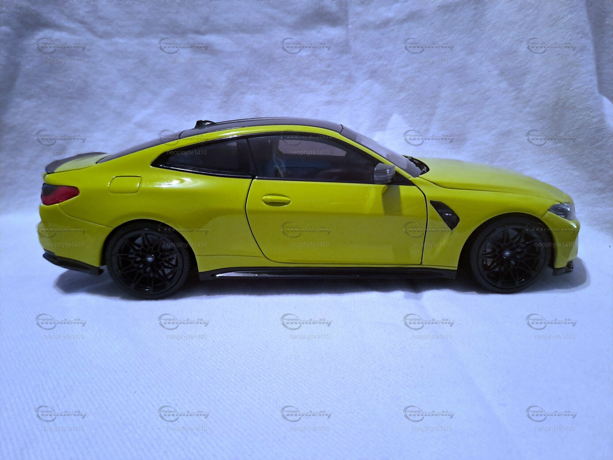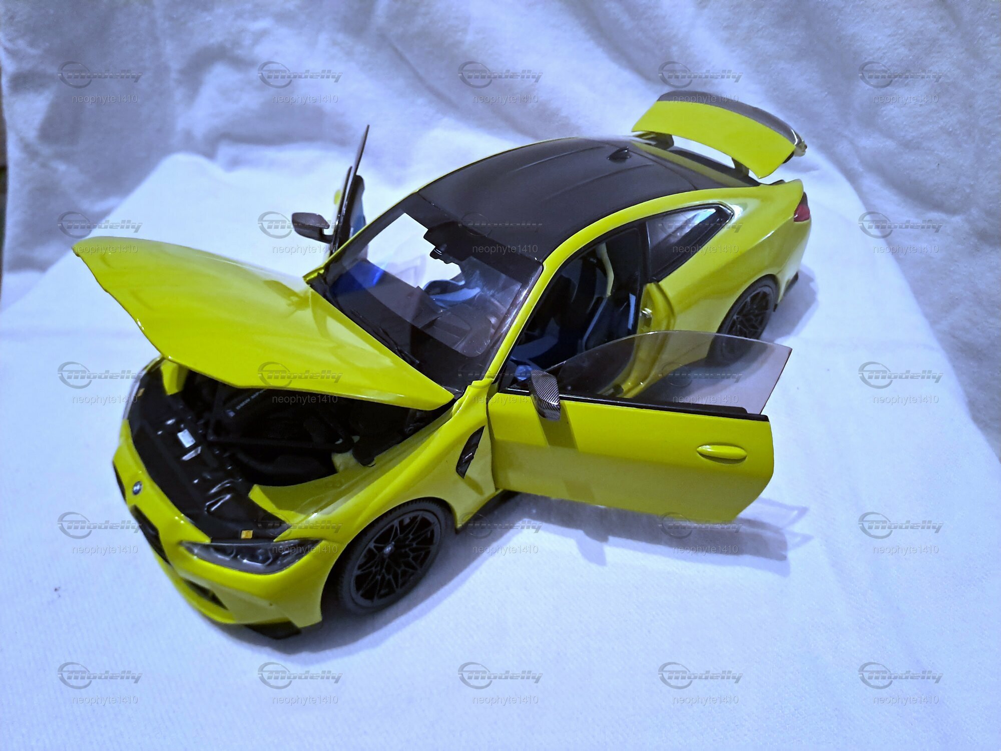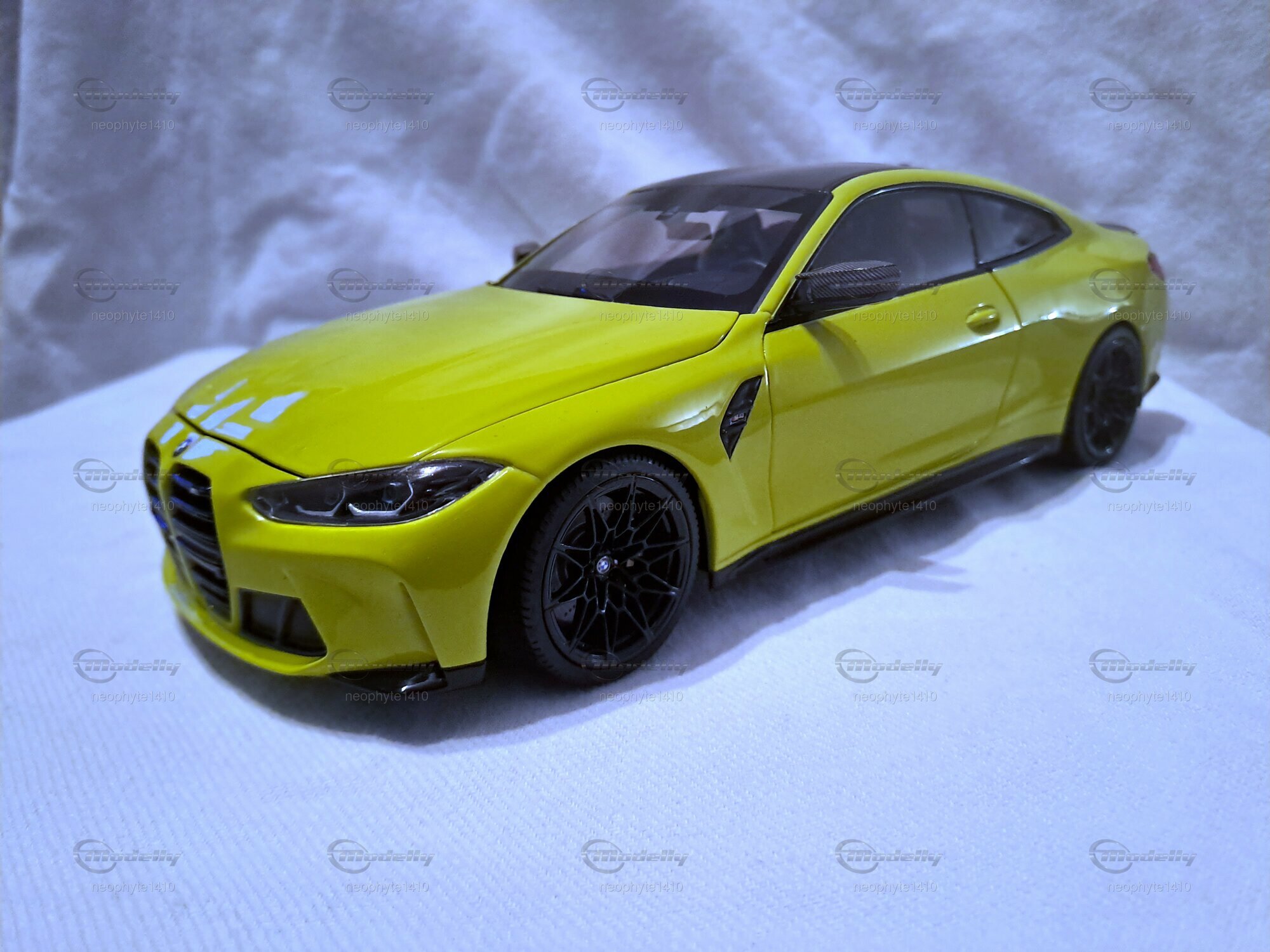 Für Modellautosammler ist das Modell des BMW M4 (G82) im 1:18 Maßstab von Minichamps ein wahres Juwel. Dieses Modellauto ist aus hochwertigem Druckguss-Material gefertigt und zeigt beeindruckende Detailgenauigkeit, wie sie auf den Fotos des Mitglieds "neophyte1410" von Modelly zu sehen ist. Der Klarlack auf der leuchtenden gelben Oberfläche des Autos verleiht dem Modell einen authentischen und glänzenden Look. Die Türen, die Motorhaube und der Kofferraum sind beweglich und geben den Blick auf den detaillierten Innenraum und Motorbereich frei. Besonders die schwarze Carbon-Optik an den Spiegeln und am Dach sowie die filigranen schwarzen Felgen sind besondere Highlights des Modells.