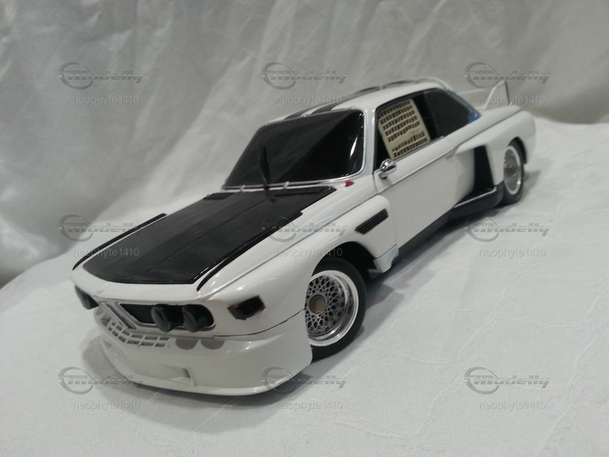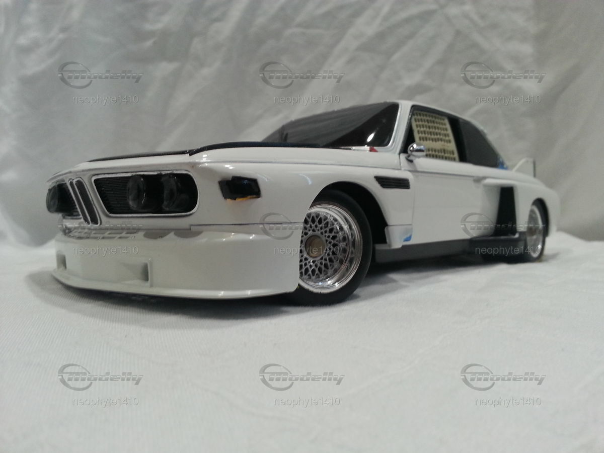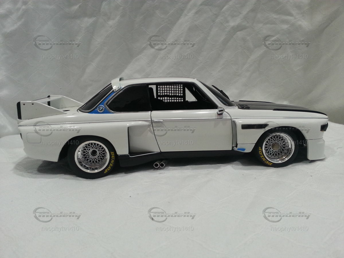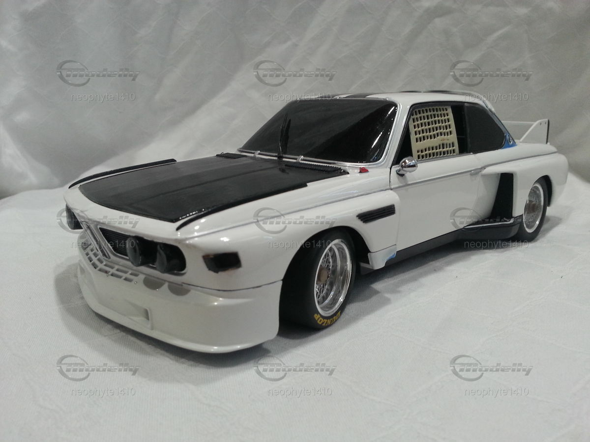 Das hier abgebildete Modellauto ist eine 1:18 Skala Reproduktion des BMW 3.5 CSL Gr. 5 von Pauls Modell Art / Minichamps. Es ist wichtig zu erwähnen, dass dieses Modell nachträglich modifiziert wurde und somit nicht das Produkt in Originalzustand von Pauls Modell Art / Minichamps darstellt. Das Miniaturmodell von Modelly-Mitglied "neophyte1410" besticht durch detaillierte Nachbildungen wie die Frontpartie mit den Scheinwerfern und den Luftleitblechen sowie die präzisen Nachbildungen des Heckflügels und der Felgen. Das Modell trägt die Farbschema in Weiß und Schwarz, ähnlich wie das originale Rennfahrzeug. Sponsoringaufkleber, wie die von Goodyear sind ebenso zu erkennen.