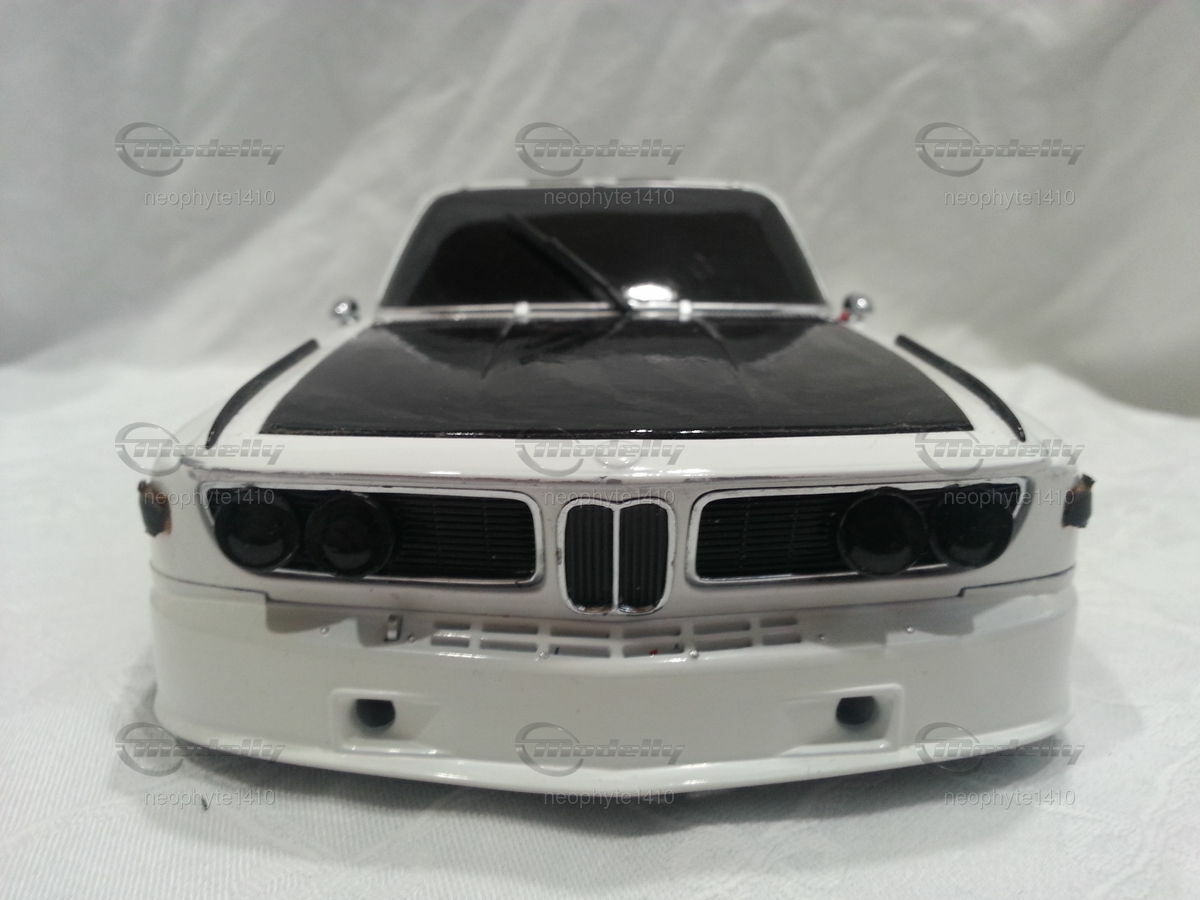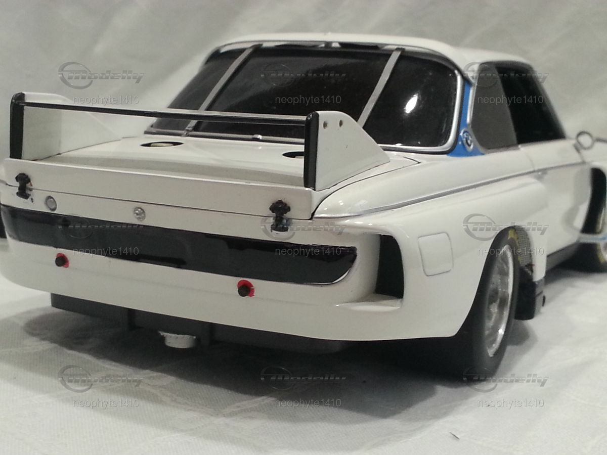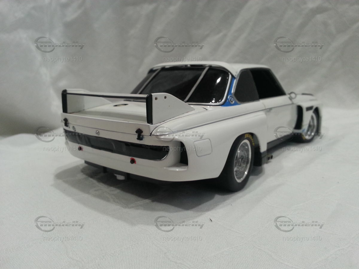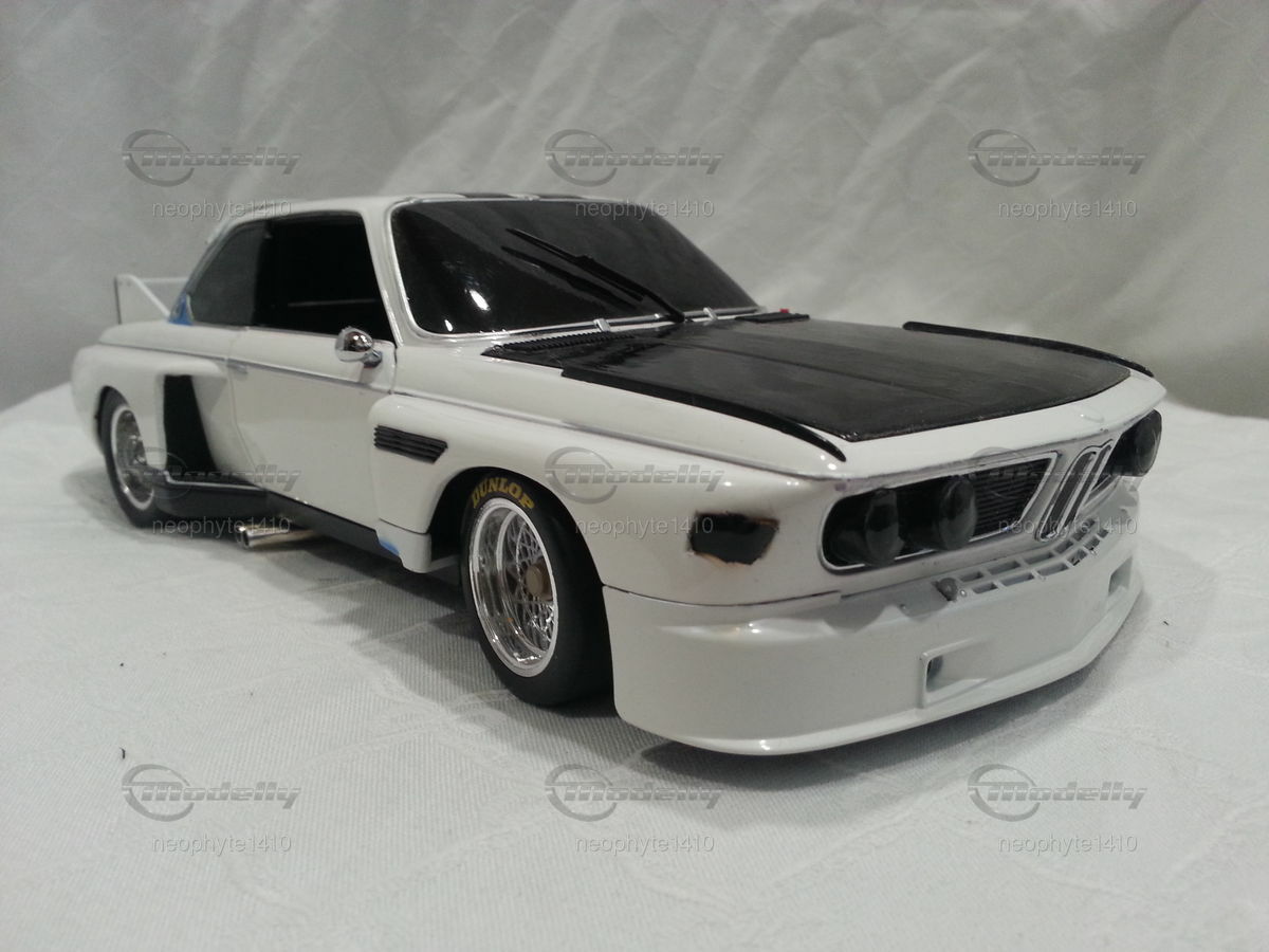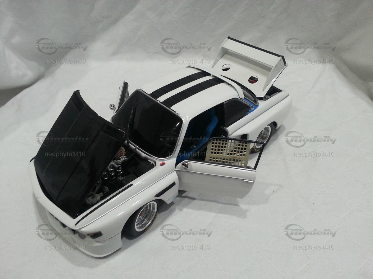 Das hier abgebildete Modellauto ist eine 1:18 Skala Reproduktion des BMW 3.5 CSL Gr. 5 von Pauls Modell Art / Minichamps. Es ist wichtig zu erwähnen, dass dieses Modell nachträglich modifiziert wurde und somit nicht das Produkt in Originalzustand von Pauls Modell Art / Minichamps darstellt. Das Miniaturmodell von Modelly-Mitglied "neophyte1410" besticht durch detaillierte Nachbildungen wie die Frontpartie mit den Scheinwerfern und den Luftleitblechen sowie die präzisen Nachbildungen des Heckflügels und der Felgen. Das Modell trägt die Farbschema in Weiß und Schwarz, ähnlich wie das originale Rennfahrzeug. Sponsoringaufkleber, wie die von Goodyear sind ebenso zu erkennen.