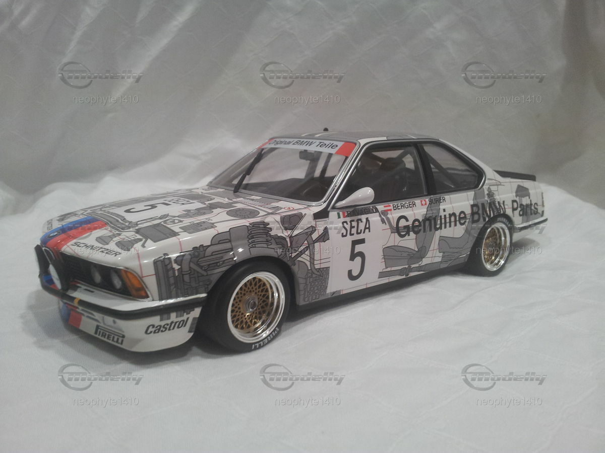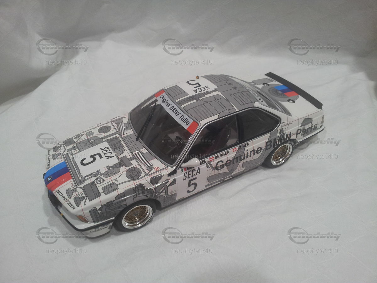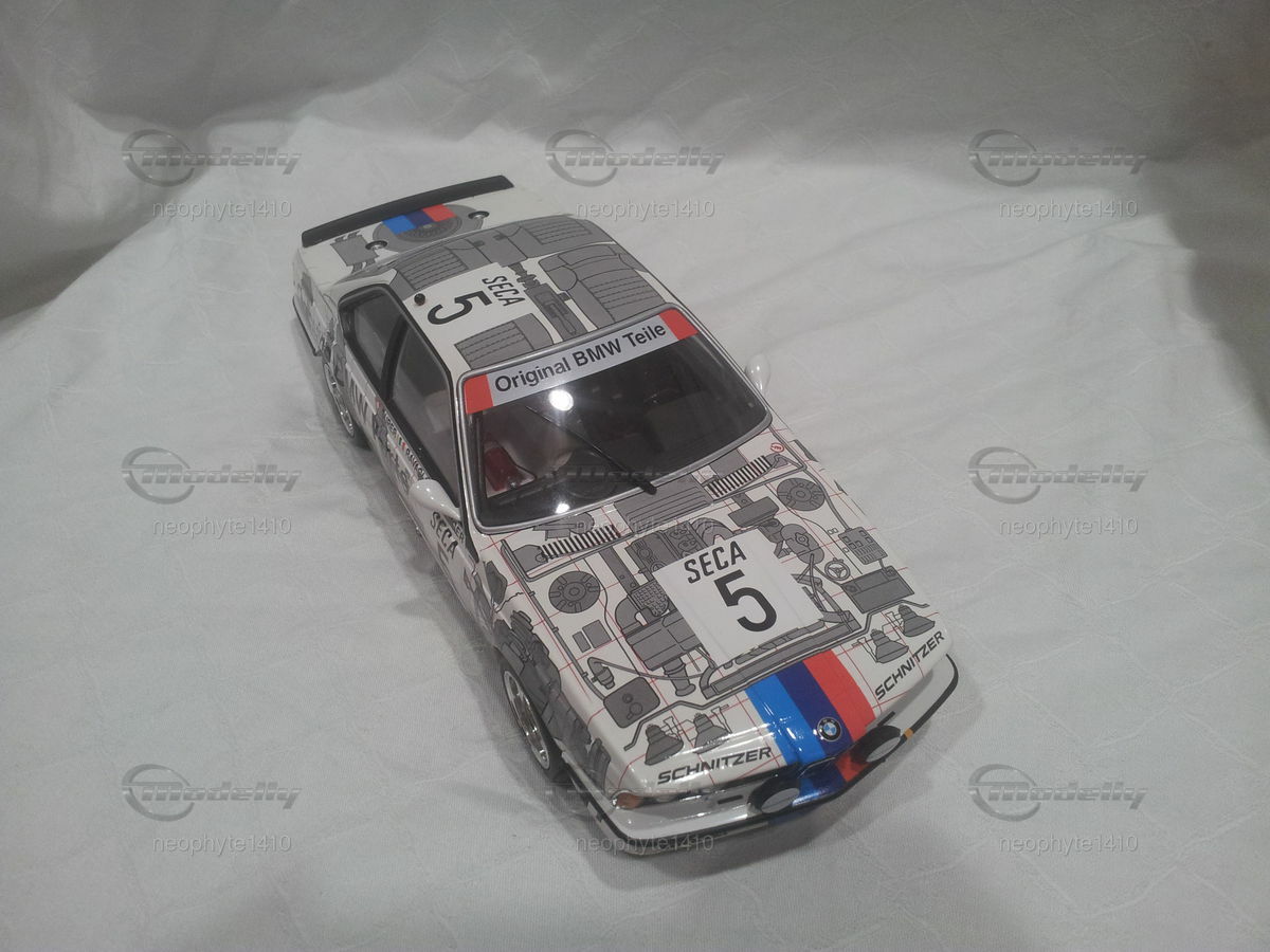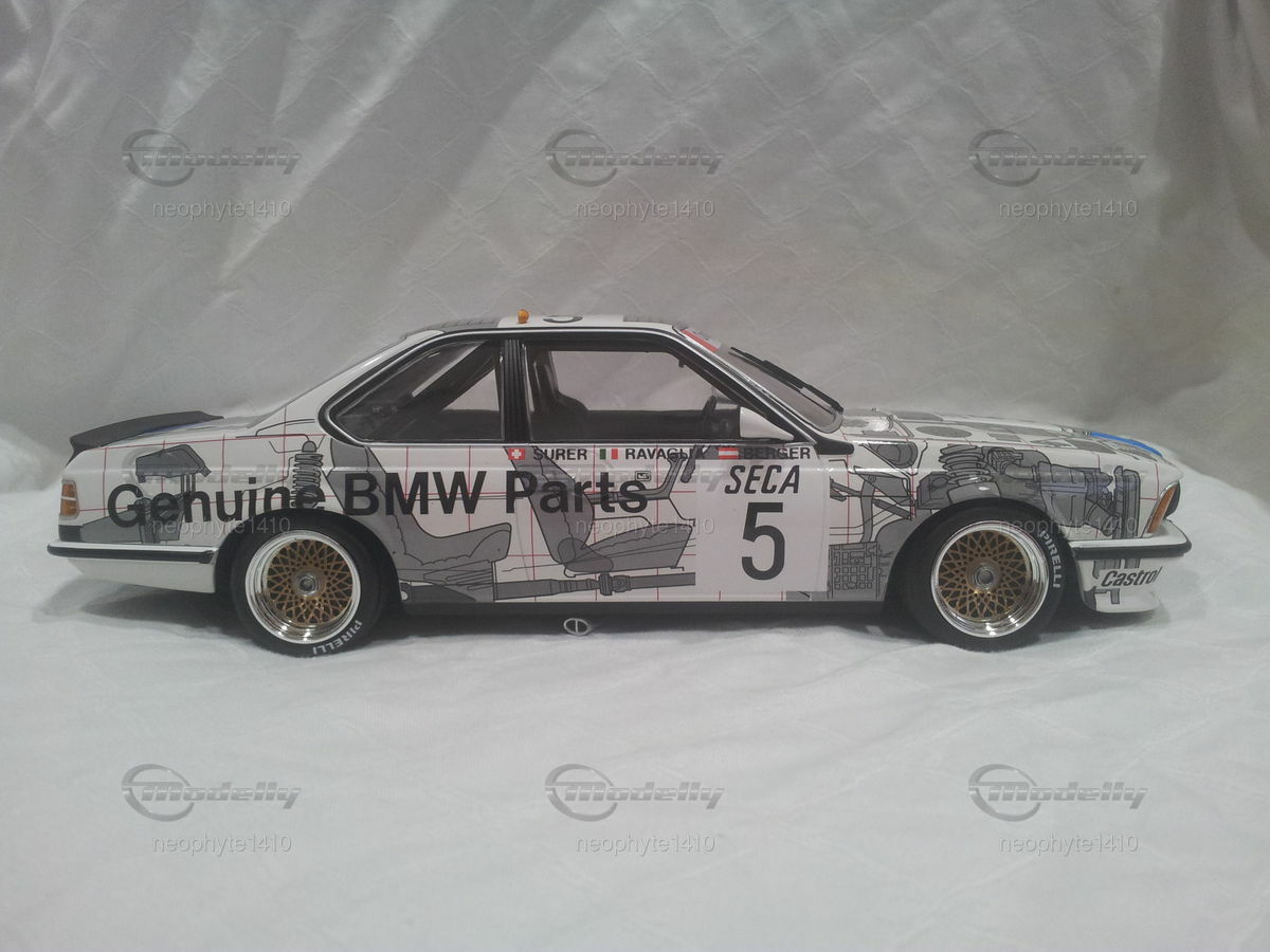 Die Lackierung dieses Modellautos ist besonders bemerkenswert. Die Basisfarbe Weiß wird durch detaillierte mechanische Zeichnungen und Sponsoren-Aufkleber in Schwarz und Rot ergänzt. Die Modellkarosserie trägt authentische Logos und Grafiken der ursprünglichen Sponsoren wie Pirelli und Castrol sowie "Genuine BMW Parts". Die goldfarbenen Felgen und das sorgfältig nachgebildete Interieur spiegeln die hohe Qualität und Detailtreue der Miniatur wider. Dieses Modellauto im Maßstab 1:18, ebenfalls von Pauls Modell Art / Minichamps, ist ein wertvolles Sammlerstück für jeden Modellauto-Enthusiasten.