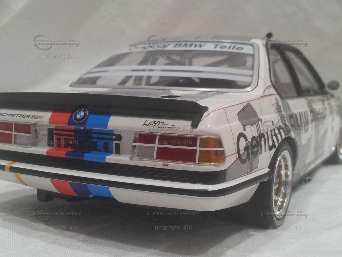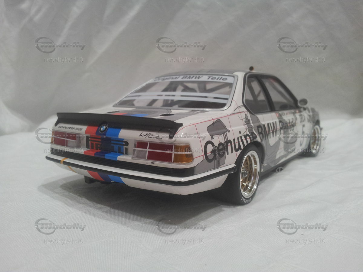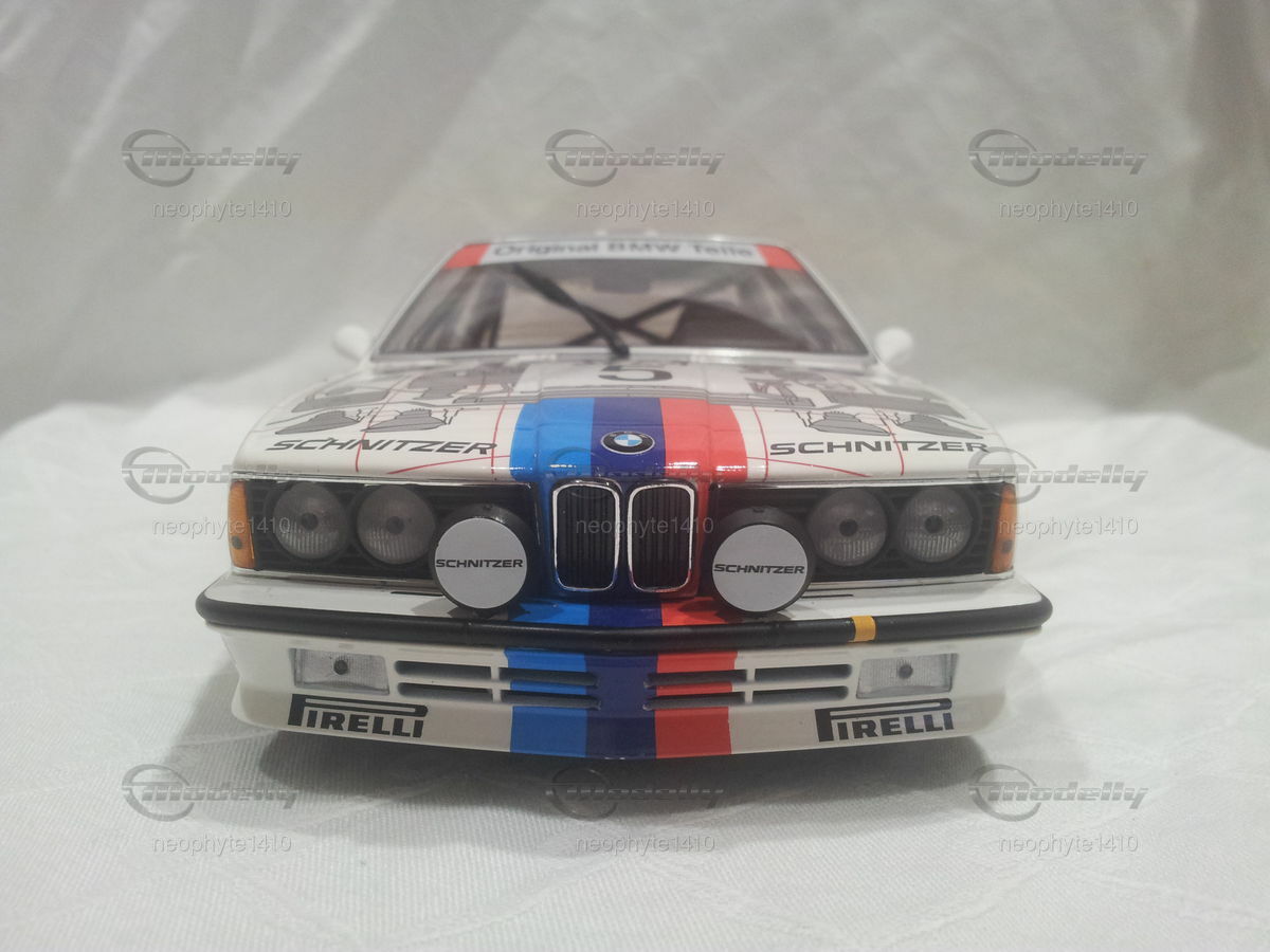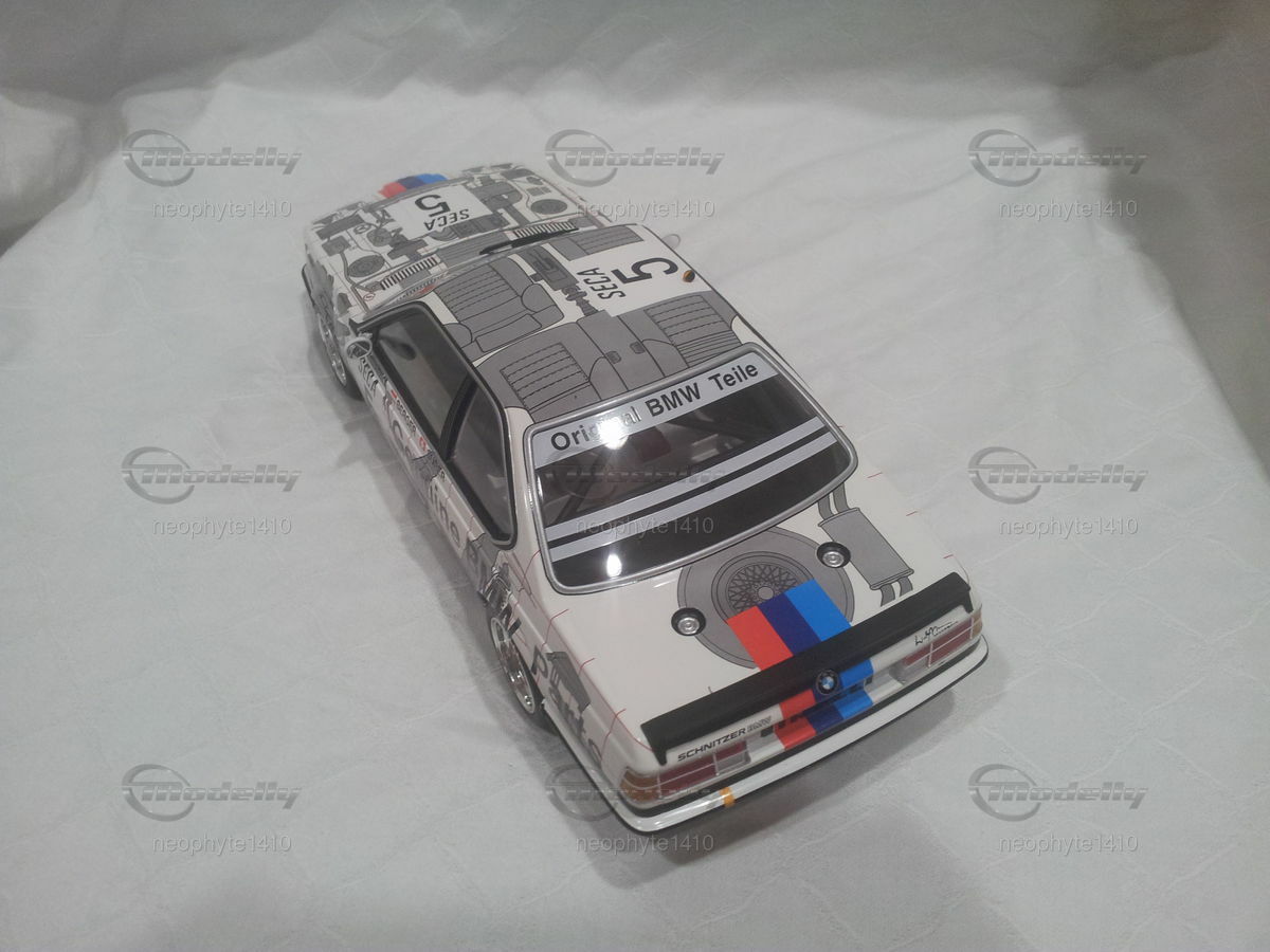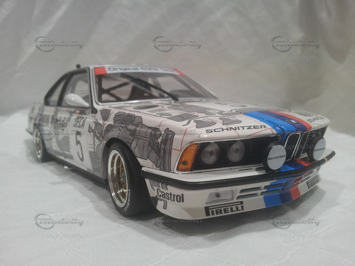 Die Lackierung dieses Modellautos ist besonders bemerkenswert. Die Basisfarbe Weiß wird durch detaillierte mechanische Zeichnungen und Sponsoren-Aufkleber in Schwarz und Rot ergänzt. Die Modellkarosserie trägt authentische Logos und Grafiken der ursprünglichen Sponsoren wie Pirelli und Castrol sowie "Genuine BMW Parts". Die goldfarbenen Felgen und das sorgfältig nachgebildete Interieur spiegeln die hohe Qualität und Detailtreue der Miniatur wider. Dieses Modellauto im Maßstab 1:18, ebenfalls von Pauls Modell Art / Minichamps, ist ein wertvolles Sammlerstück für jeden Modellauto-Enthusiasten.