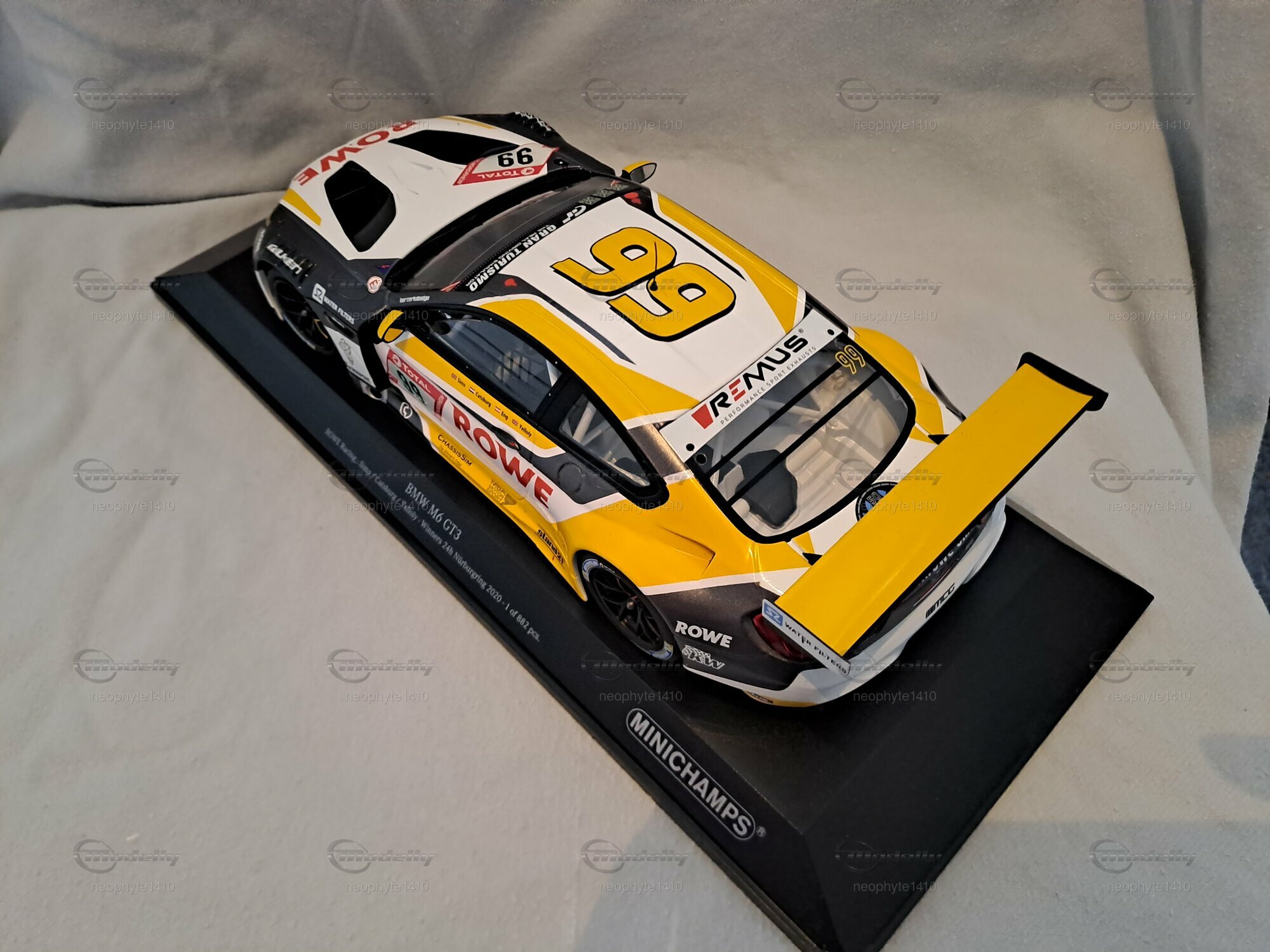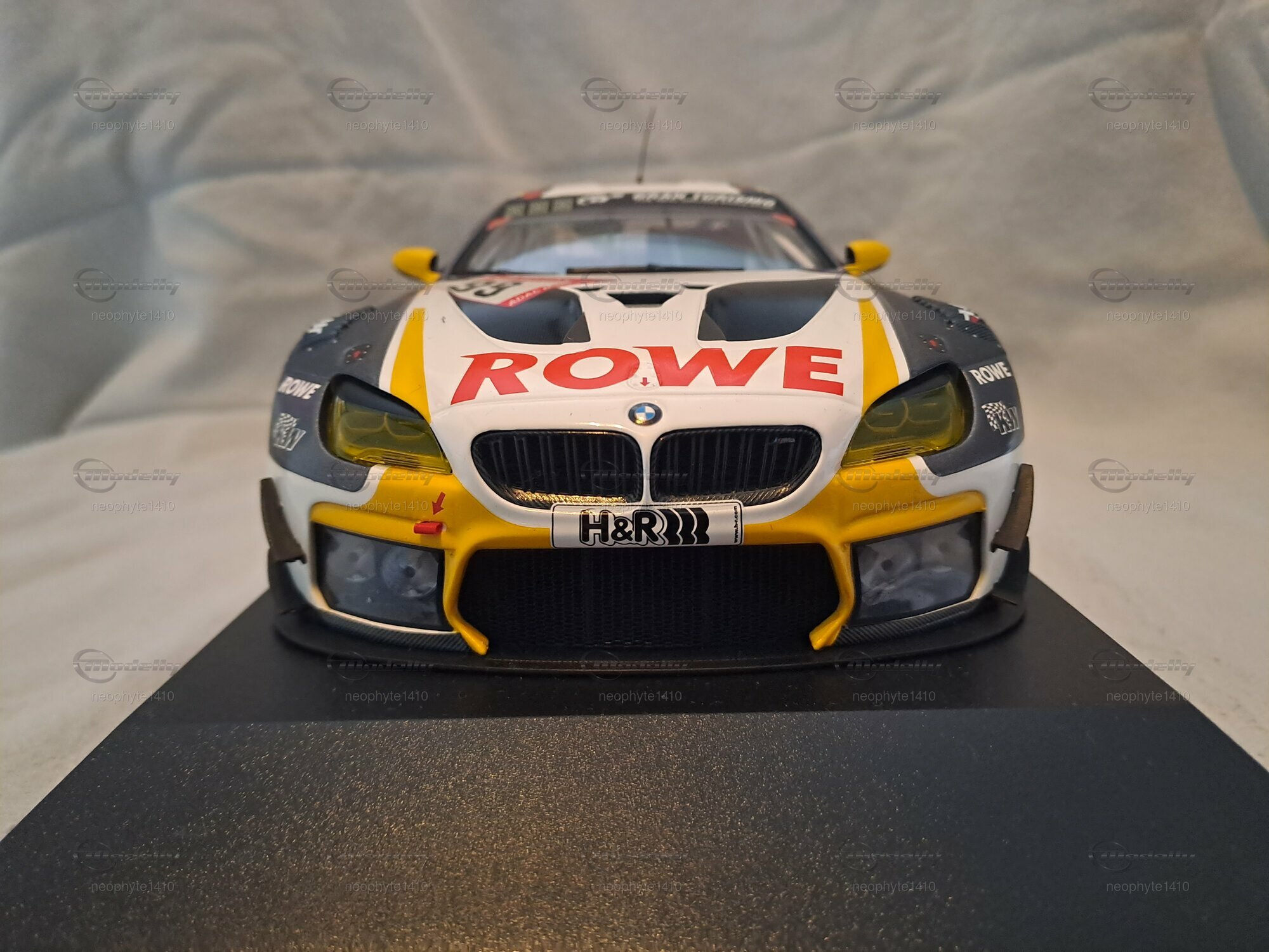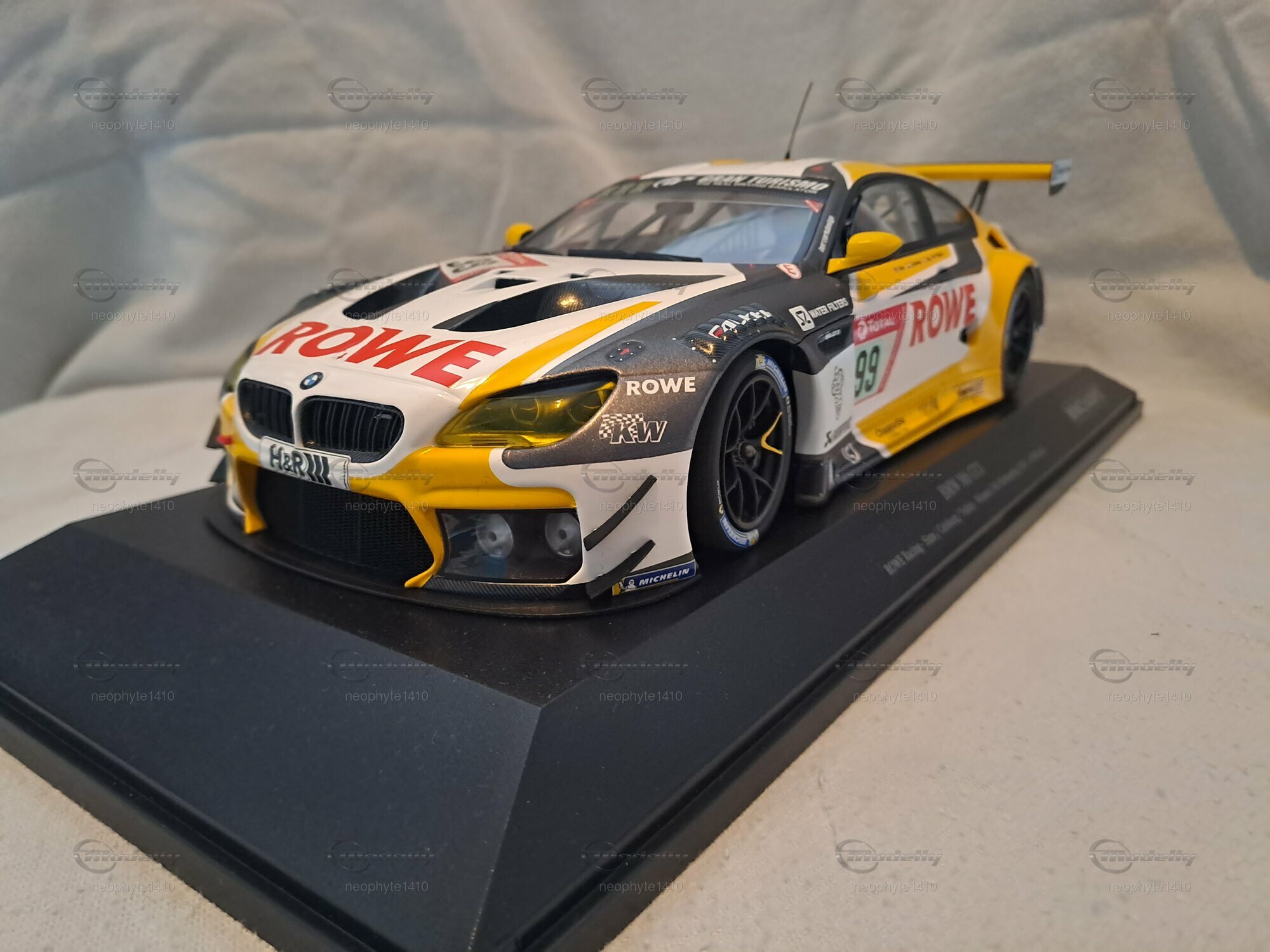 Das Modell des BMW M6 GT3 #99 Sieger 24 h Nürburgring 2020, das von Minichamps in einem Maßstab von 1:18 gefertigt wurde, ist ein hochdetailliertes Miniaturmodell. Dieses Modell besteht aus Diecast und weist eine aufwendige Lackierung im markanten Design des Siegerfahrzeugs von ROWE Racing auf. Die auffällige Farbkombination aus Weiß, Schwarz und Gelb wird durch die Sponsorenlogos von ROWE, H&R und Michelin ergänzt, die an verschiedenen Stellen der Karosserie zu sehen sind. Besonders auffällig ist der große Schriftzug "ROWE" auf der Motorhaube sowie die Startnummer 99, die die Identifikation des Siegerfahrzeugs unterstreicht.
