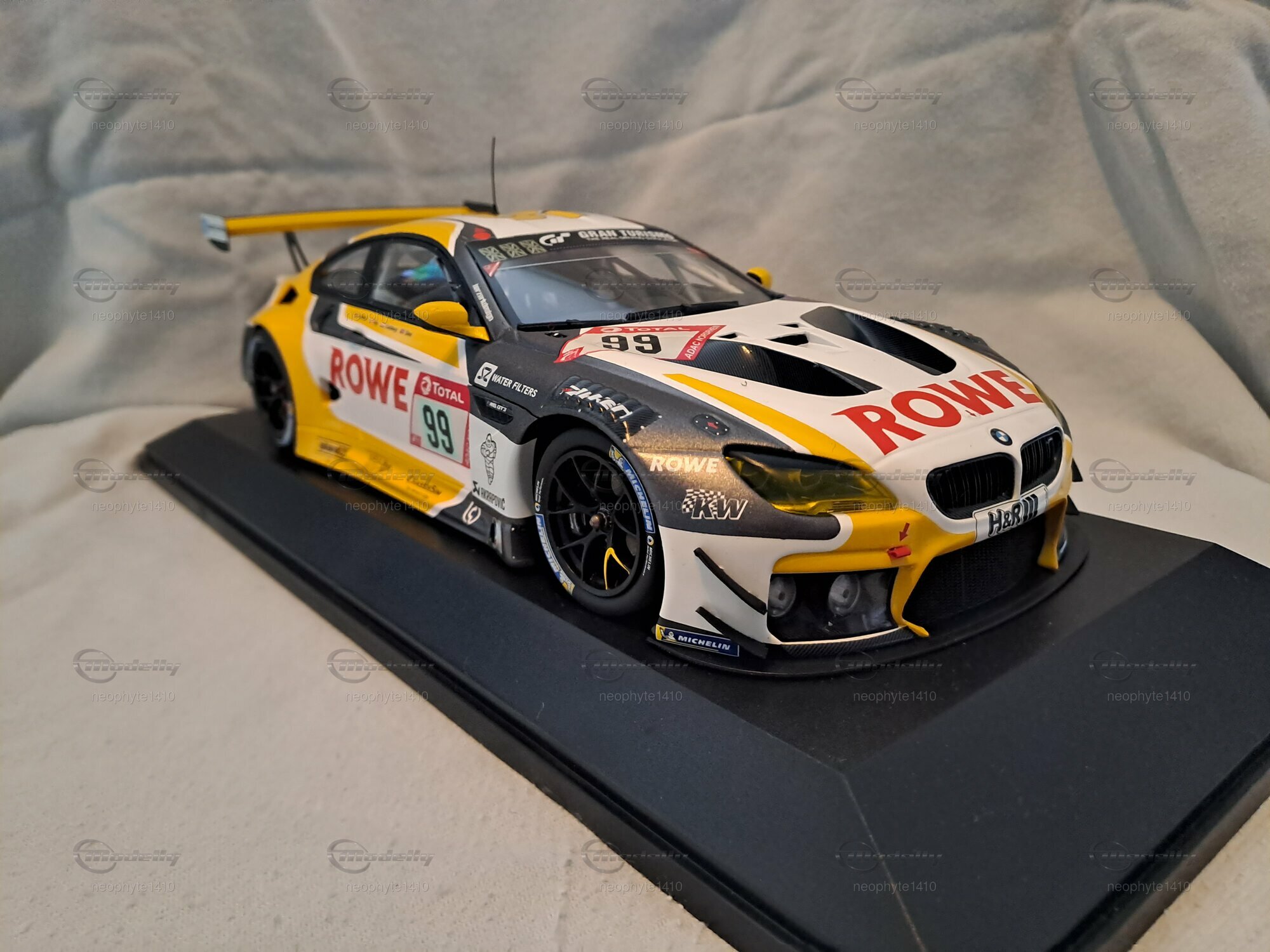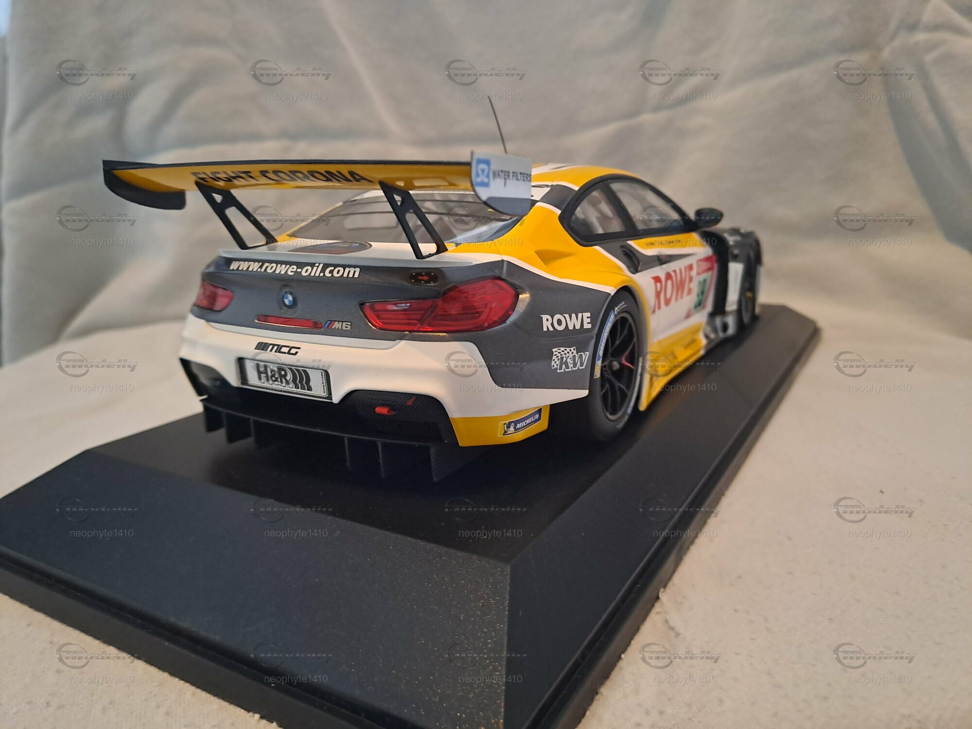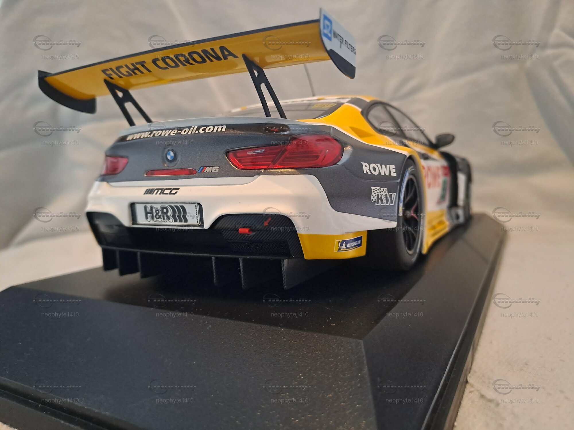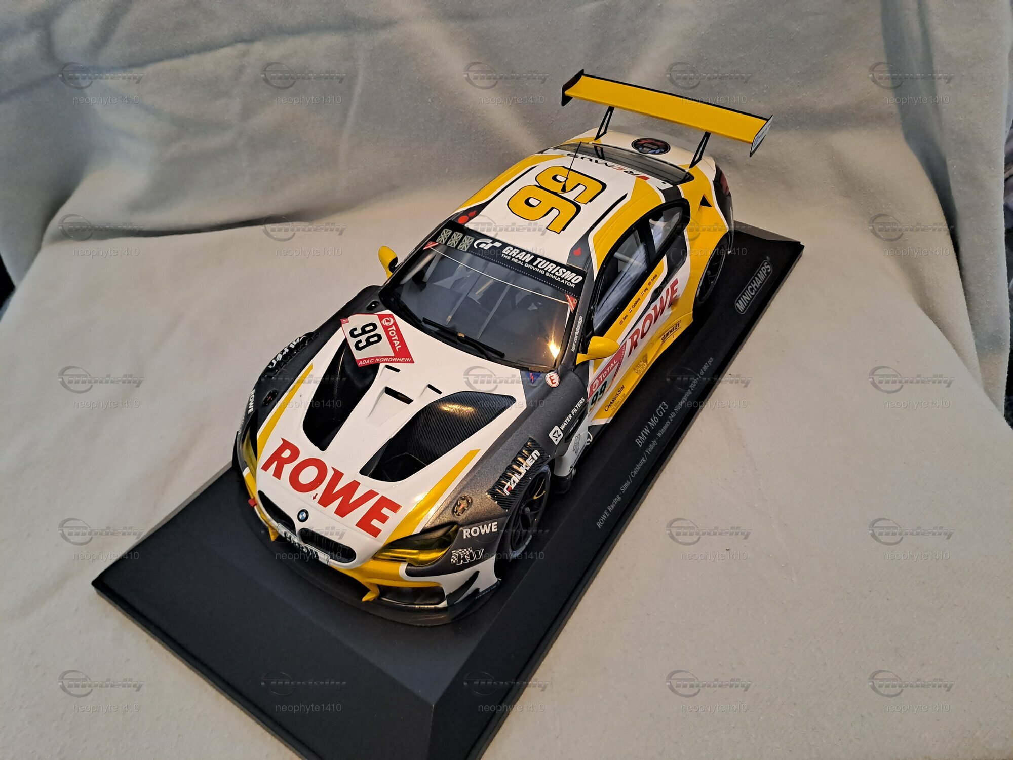 Das Modell des BMW M6 GT3 #99 Sieger 24 h Nürburgring 2020, das von Minichamps in einem Maßstab von 1:18 gefertigt wurde, ist ein hochdetailliertes Miniaturmodell. Dieses Modell besteht aus Diecast und weist eine aufwendige Lackierung im markanten Design des Siegerfahrzeugs von ROWE Racing auf. Die auffällige Farbkombination aus Weiß, Schwarz und Gelb wird durch die Sponsorenlogos von ROWE, H&R und Michelin ergänzt, die an verschiedenen Stellen der Karosserie zu sehen sind. Besonders auffällig ist der große Schriftzug "ROWE" auf der Motorhaube sowie die Startnummer 99, die die Identifikation des Siegerfahrzeugs unterstreicht.