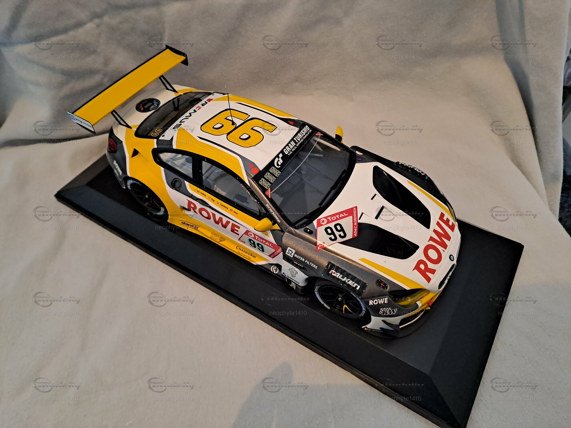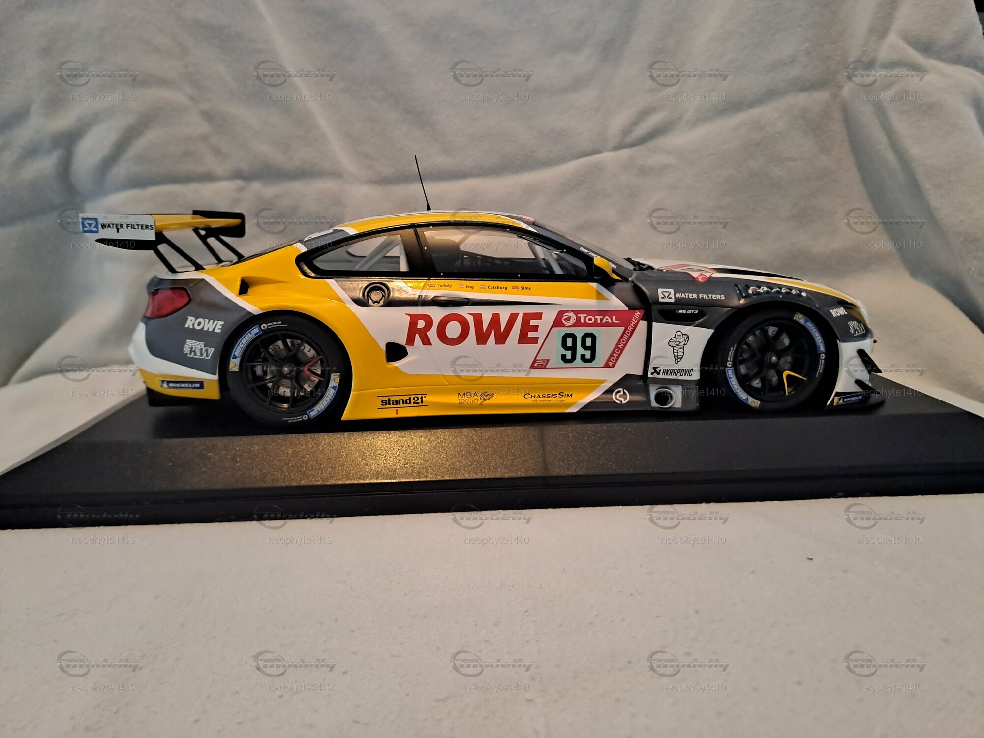 Das Modell des BMW M6 GT3 in 1:18 Maßstab, hergestellt von Minichamps, ist ein echter Hingucker für Sammler. Dieses Modell ist eine limitierte Auflage, weltweit existieren nur 882 Stück. Dies erhöht den Wert und die Begehrlichkeit bei Sammlern und Modellauto-Enthusiasten erheblich. Die Präzision und Liebe zum Detail sind bei diesem Modell bemerkenswert. Jedes kleine Element, von den Lüftungsschlitzen bis hin zu den Sponsorenaufklebern, ist originalgetreu wiedergegeben. Für den Besitzer und Sammler "neophyte1410" auf Modelly ist dieses Modell sicherlich ein Juwel in der Sammlung, das mit Stolz präsentiert wird.