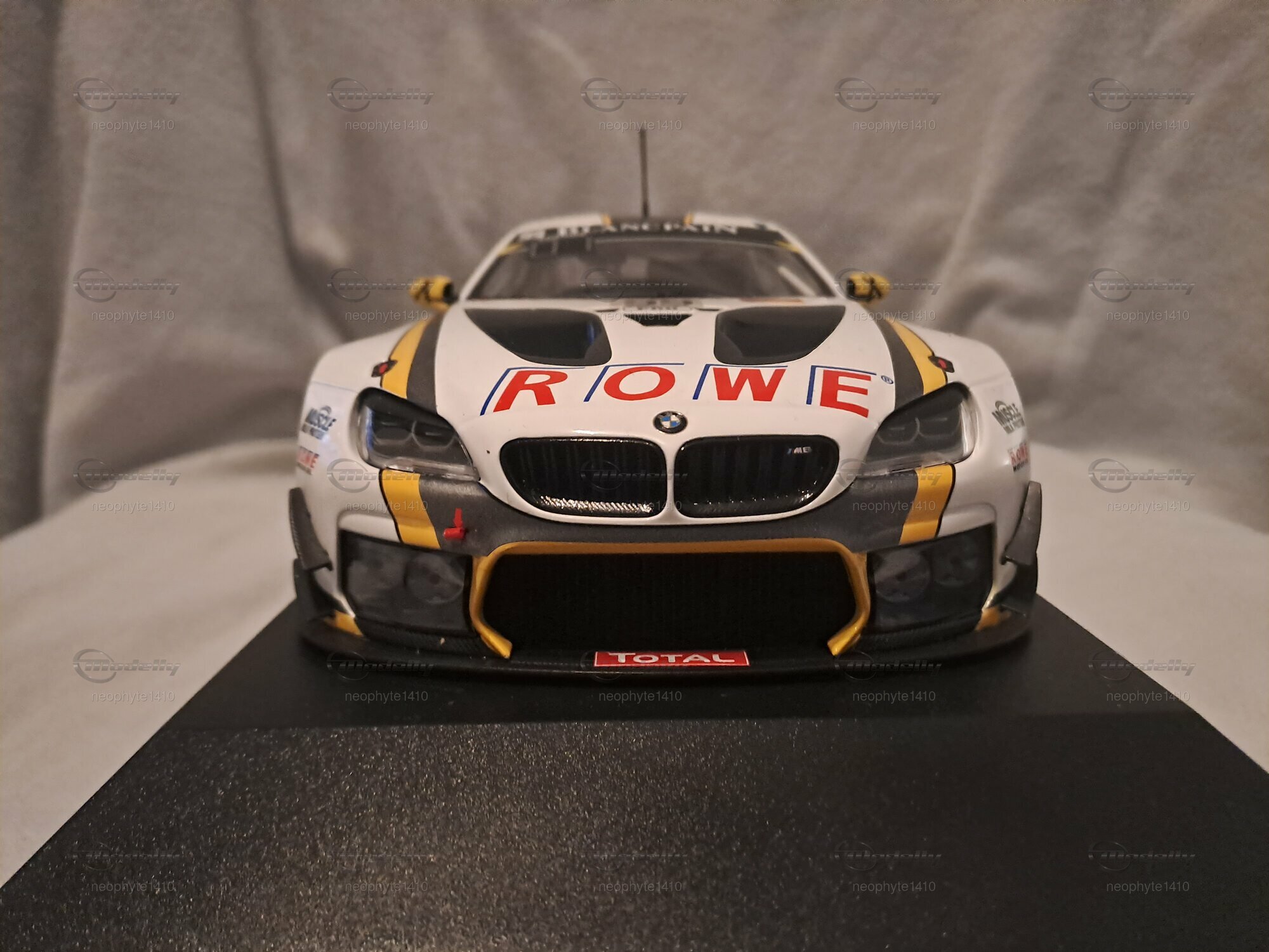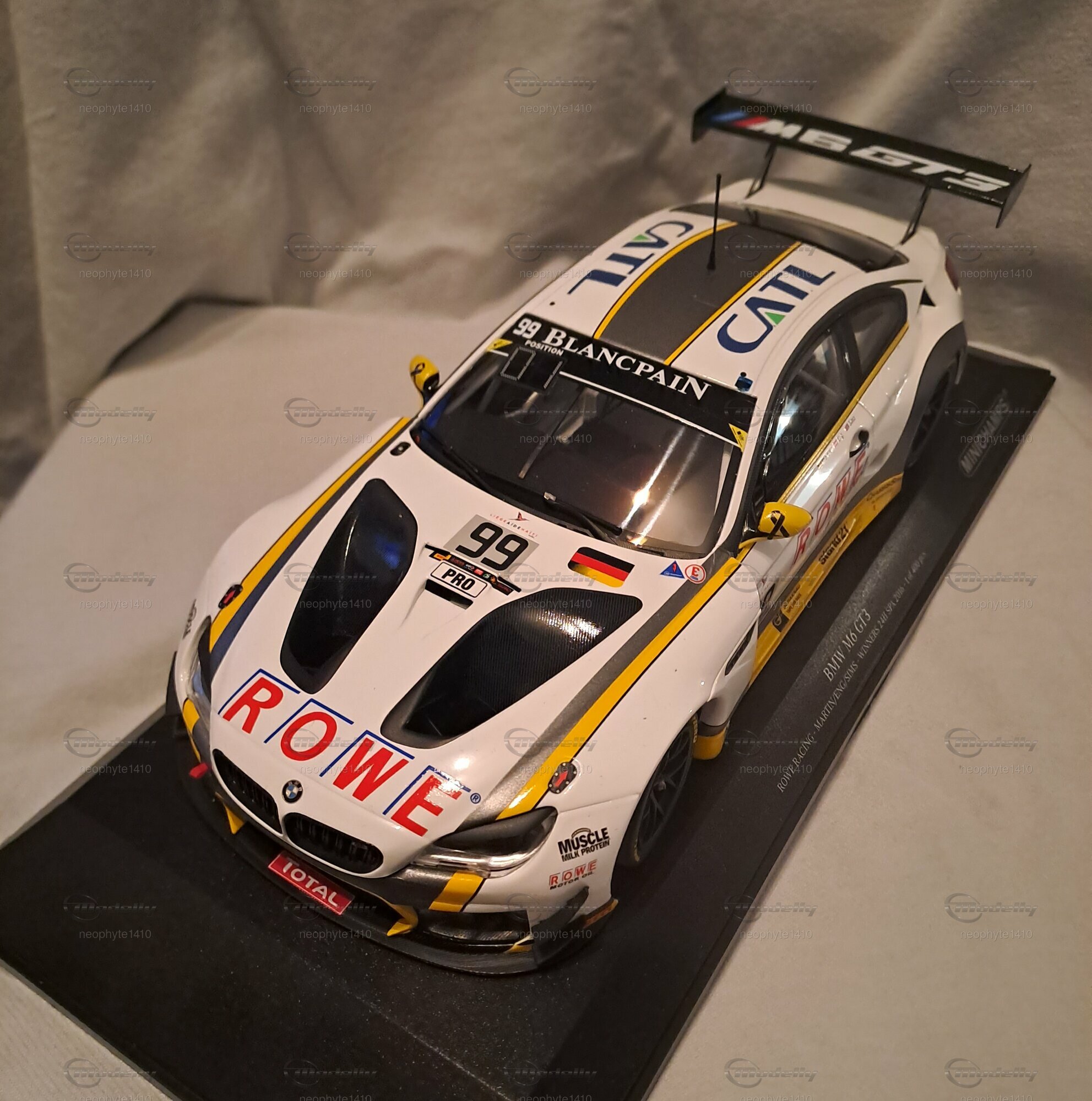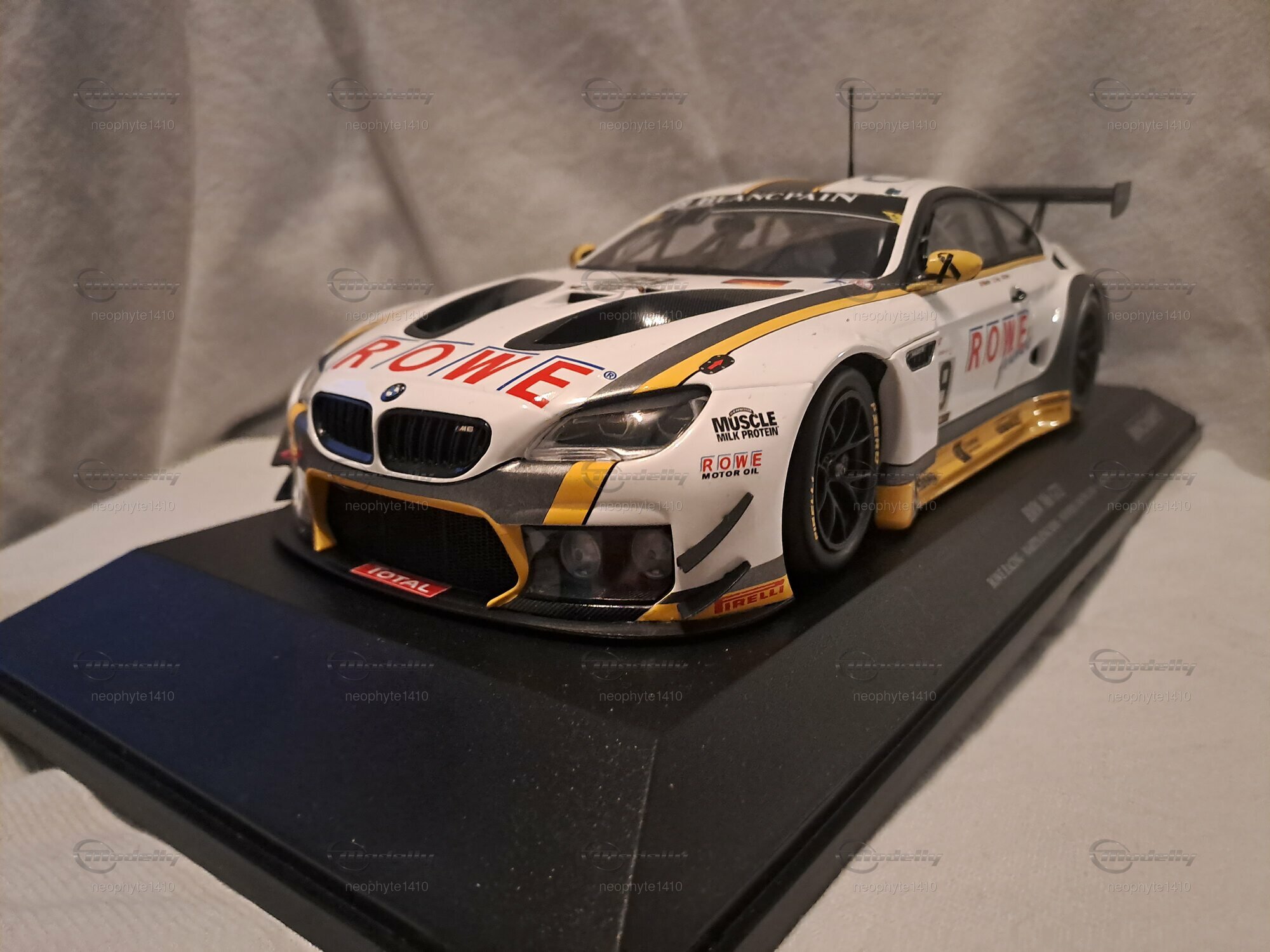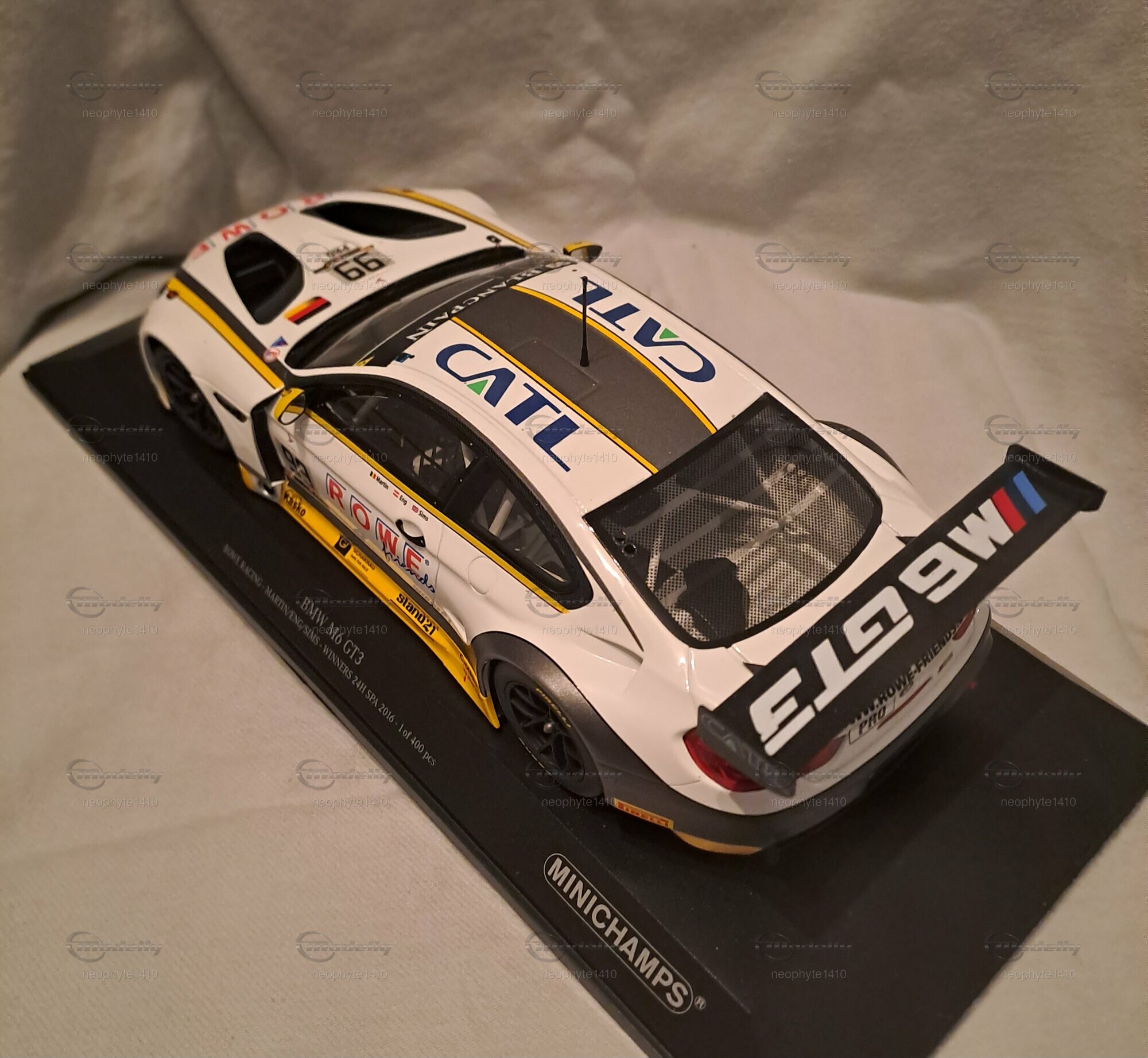 Das abgebildete Modellauto des BMW M6 GT3 für den Einsatz beim 24-Stunden-Rennen von Spa-Francorchamps 2016 wurde von Minichamps in 1:18 Maßstab hergestellt. Es handelt sich um eine limitierte Auflage, wobei nur 400 Stück weltweit produziert wurden und somit ein besonders wertvolles Stück für Sammler darstellt. Das Modell wurde aus Diecast-Material gefertigt, was seine Stabilität und Detailtreue unterstützt. Die Farbkombination auf dem Modell ist außergewöhnlich präzise wiedergegeben, mit dominanten Weiß- und Gelbtönen, die durch schwarze Akzente ergänzt werden. Besonders auffällig sind die Sponsoring-Aufkleber von ROWE und Pirelli, die die Renntradition des BMW M6 GT3 unterstreichen.