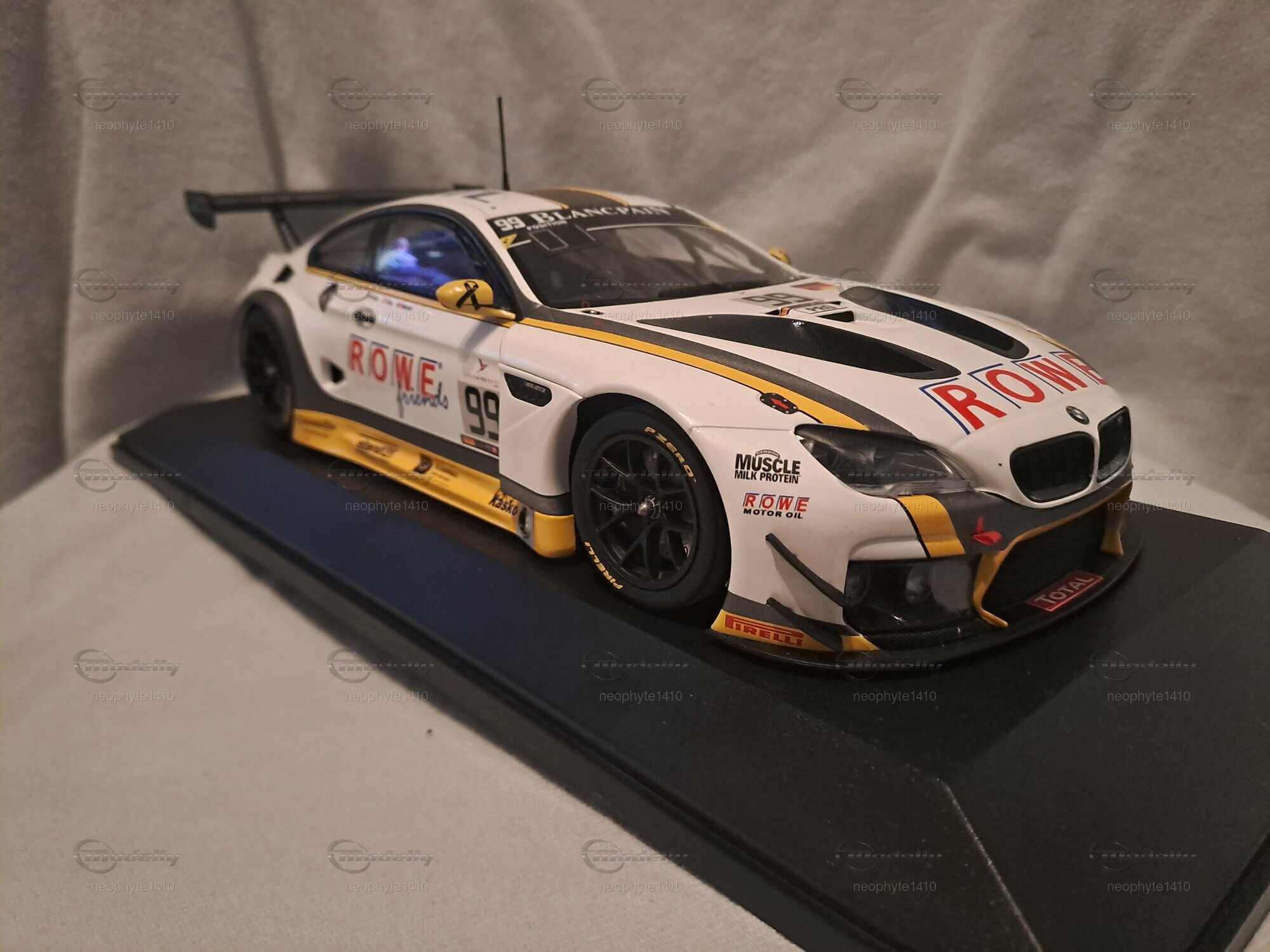 Das Miniaturmodell besticht durch seine detaillierte Gestaltung und die aufmerksame Wiedergabe der Besonderheiten des Rennwagens. Die Frontpartie des Wagens zeigt eindrucksvolle Lufteinlässe und die markanten Scheinwerfer des BMW M6 GT3. Die Räder sind akkurat nachgebildet und tragen die Markierungen der Pirelli-Reifen. Der Heckflügel ist ebenfalls detailliert ausgearbeitet und trägt zur authentischen Erscheinung des Modells bei. Die Sponsoring-Beklebungen und die Startnummer 99 sind präzise auf der Karosserie angebracht und verleihen dem Modell seinen realistischen Renn-Look. Fahrerinformationen und Team-Logos wurden exakt nach den Vorbildern der Rennen aufgetragen, was das Modell zu einem Must-Have für Sammler und Rennenthusiasten macht.