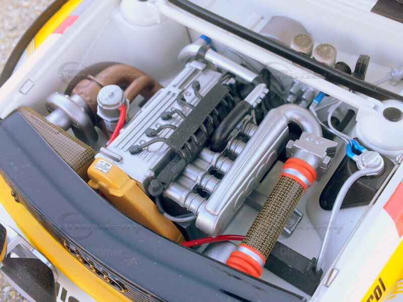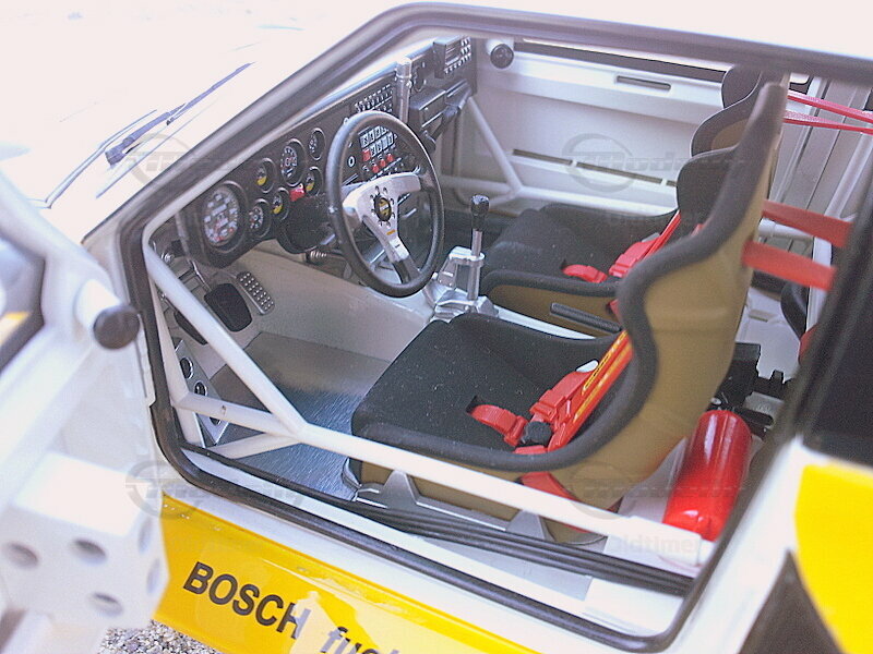 Dieses Modell, hergestellt von AUTOart, ist eine präzise Nachbildung des originalen Audi Sport quattro S1 E2. Es ist im Maßstab 1:18 gefertigt und besteht hauptsächlich aus Kunststoff, was ihm ein detailliertes und realistisches Aussehen verleiht. Besonders auffällig sind die detaillierten Scheinwerfer, die Rallyelichter an der Front und die sorgfältig nachgebildeten Sponsorenaufkleber. Zu den sichtbaren Sponsoren auf dem Modell gehören Castrol und L'Equipe, die dem Auto ein authentisches Erscheinungsbild verleihen.