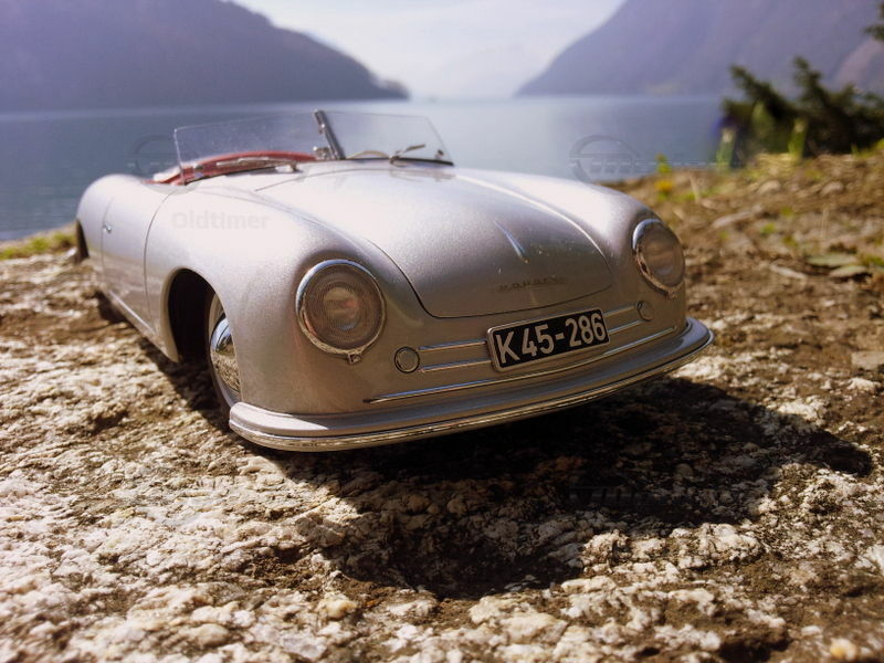 Im Juni 1948 bekam das Erstlingswerk von "Ferry" Porsche seine Zulassung. Gebaut wurde der wunderbar gestaltete Porsche 356 im österrreichischen Gmünd (Kärnten). Einige Komponenten stammten vom VW Modell "Käfer", z.B. die Vorder- und Hinterachsen und auch der Motor. Über einem Stahlrohrrahmen wurden von Hand geformte Aluminiumbleche angepasst.