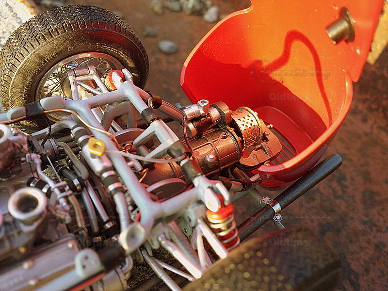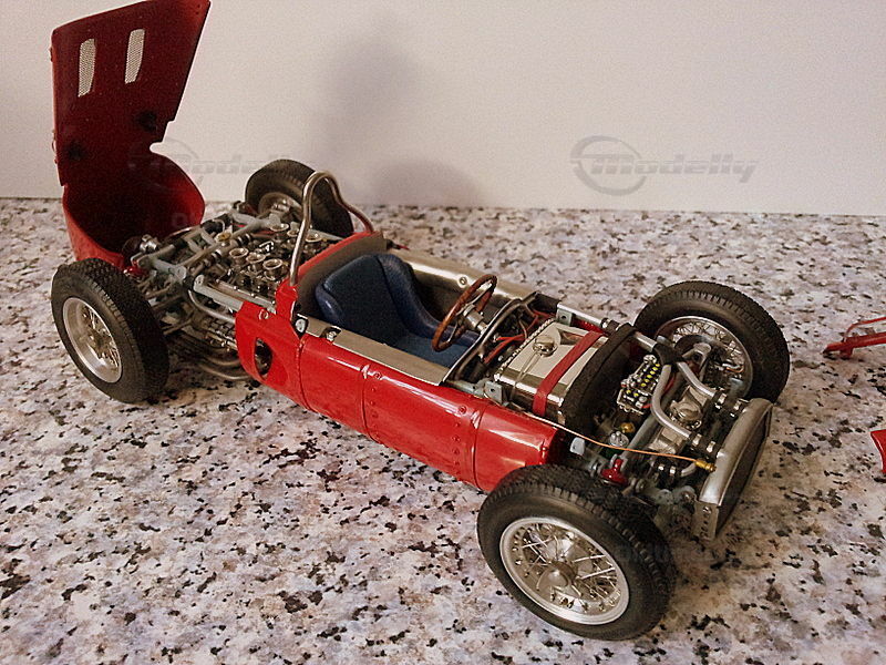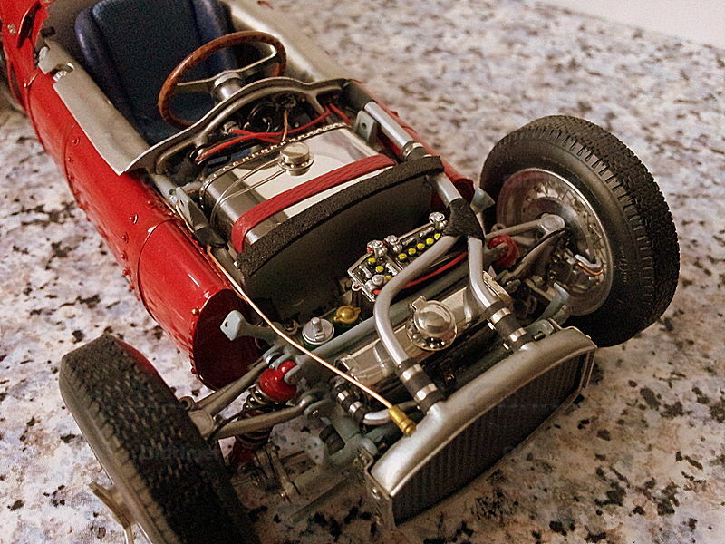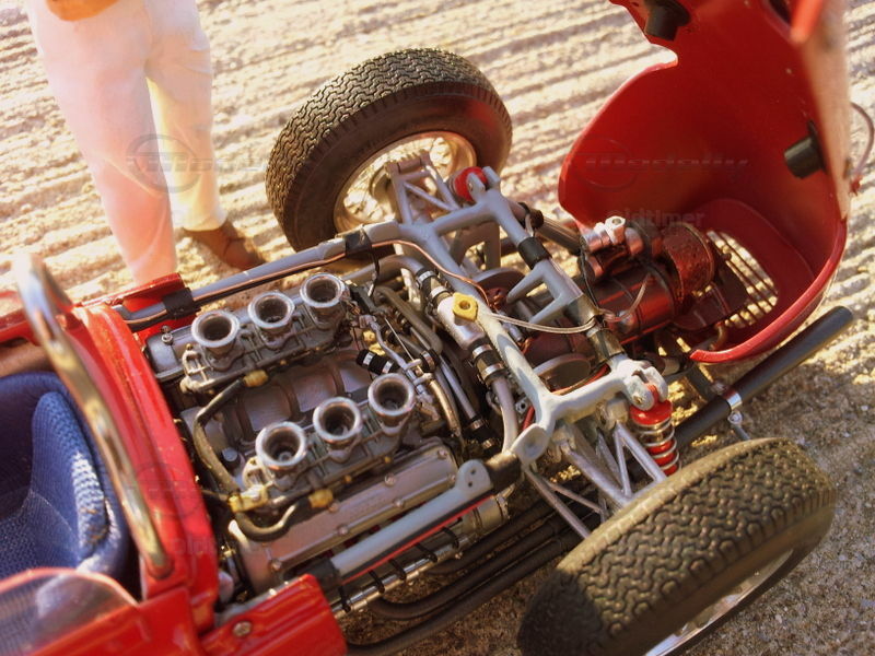 Die Motorhaube im Heck ist klappbar und gibt den Blick auf einen äusserst detaillierten Motor frei. Das Cockpit weist alle Anzeigen und Schalter des echten Fahrzeuges auf, der Sitzbezug ist aus echtem Stoff. Der Frontteil kann durch zwei Schrauben auf der Unterseite gelöst und abgenommen werden. Darunter befindet sich der Benzintank mit vorbildgerechter Verkabelung und allen Zuleitungen sowie das Kühlaggregat.