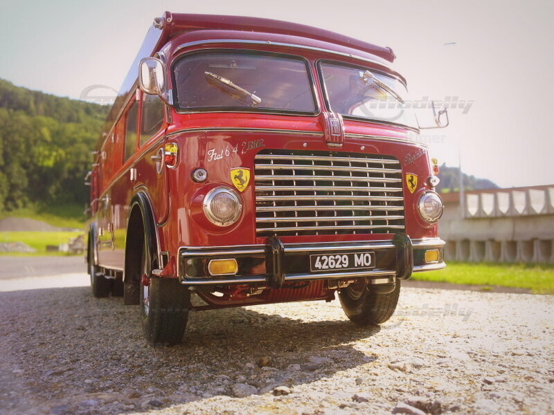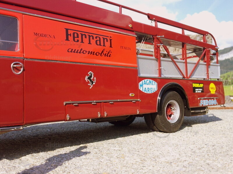 Der Ferrari Renntransporter der Scuderia Ferrari von 1957 ist ein absoluter Blickfang - vor allem, wenn er mit drei CMC-Ferrari-Modellen beladen ist.