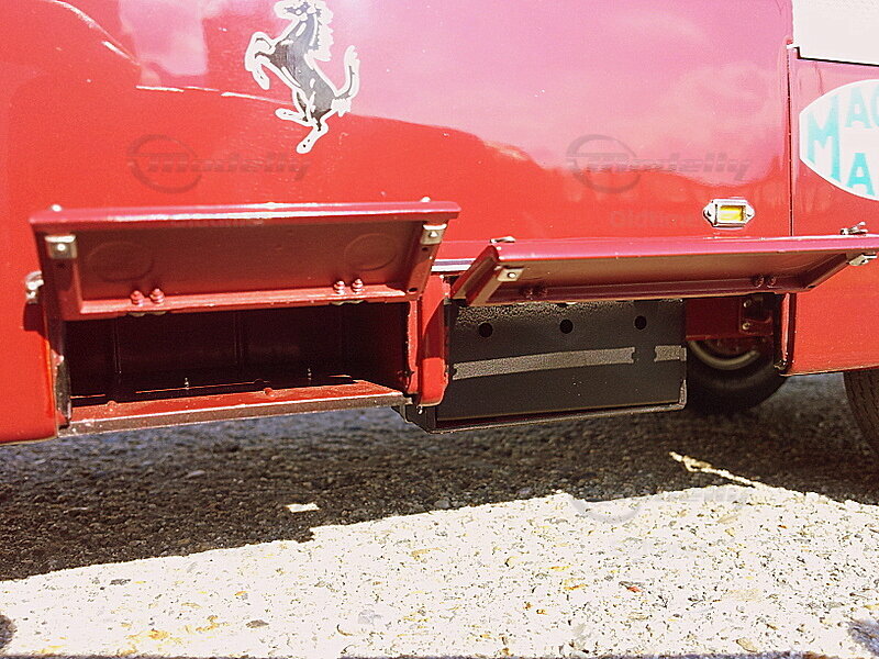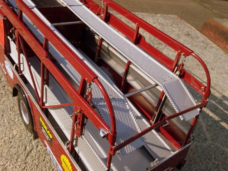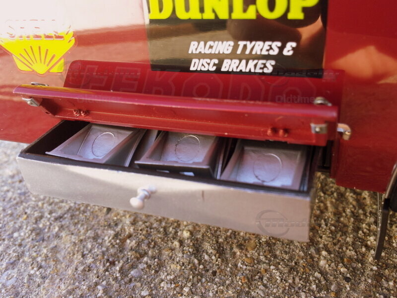 Spezielles Staufach mit herausziehbarer Schublade, in der sechs Unterlegkeile Platz finden. Sie dienen dazu, die Boliden auf der Ladefläche vor dem Abrollen zu sichern