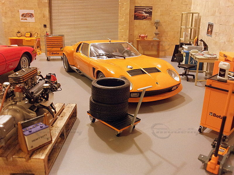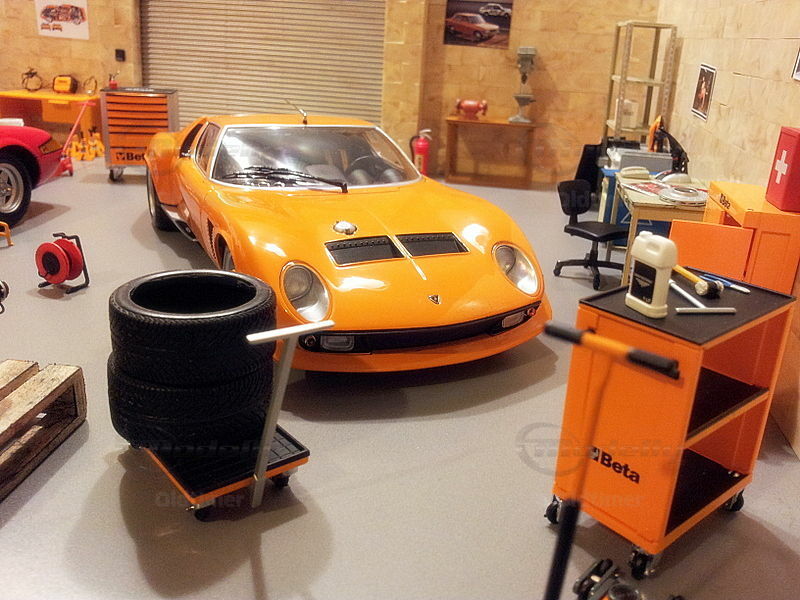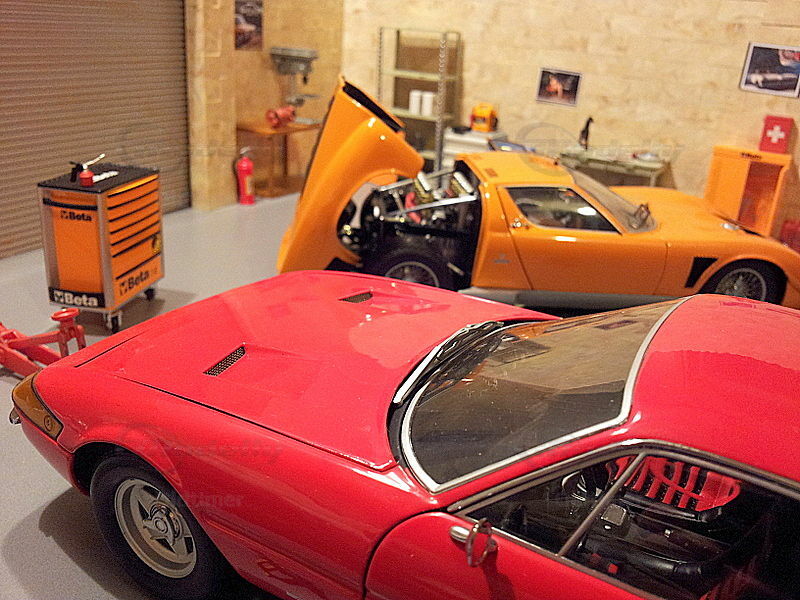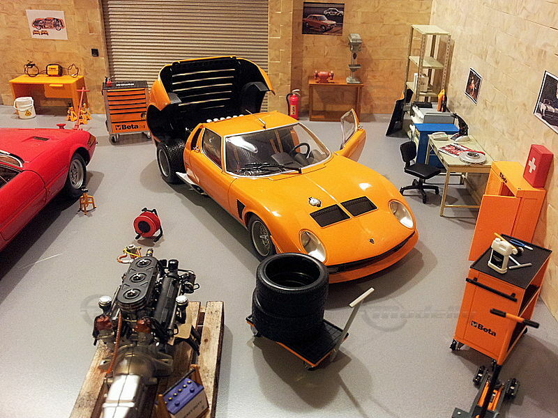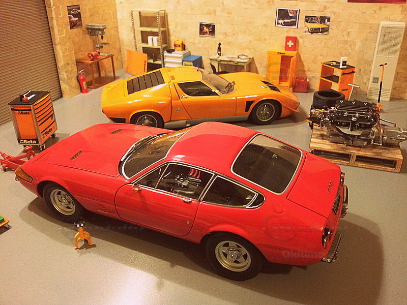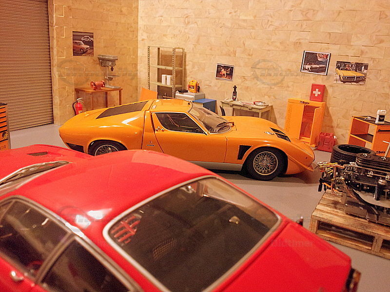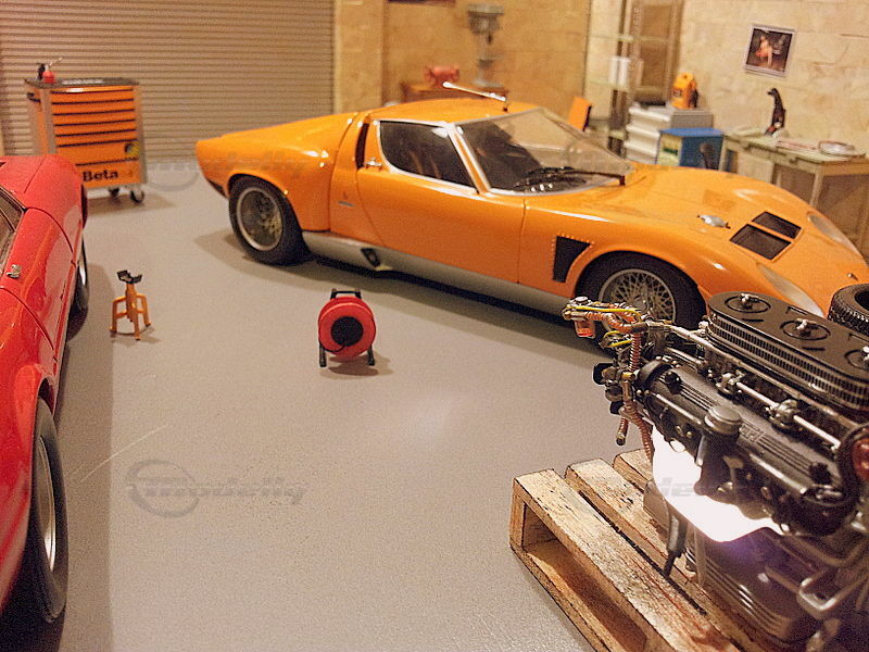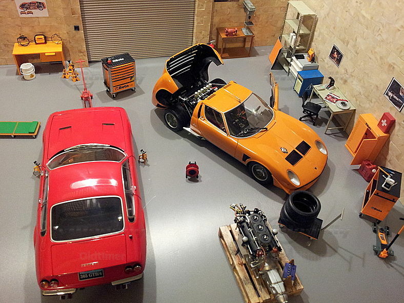 Ein "Werkstatt"-Diorama. Irgendwo, vielleicht in Italien, steht eine kleine, privat geführte Hobbywerkstatt. Hier wird an schnellen Sportwagen und bestimmt auch mal an Alltagsfahrzeugen geschraubt. Aktuell stehen ein seltener Lamborghini Jota SVR und ein Ferrari 365 "Daytona" in der Garage.