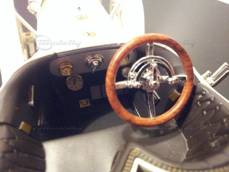 Das Modell: Sehr filigran gestaltet, aus Kunststoff gefertigt und daher sehr leicht. Alle drei Türen sowie die Motorhaube sind zu öffnen und das beiliegende Verdeck aus echtem Stoff lässt sich aufsetzen.