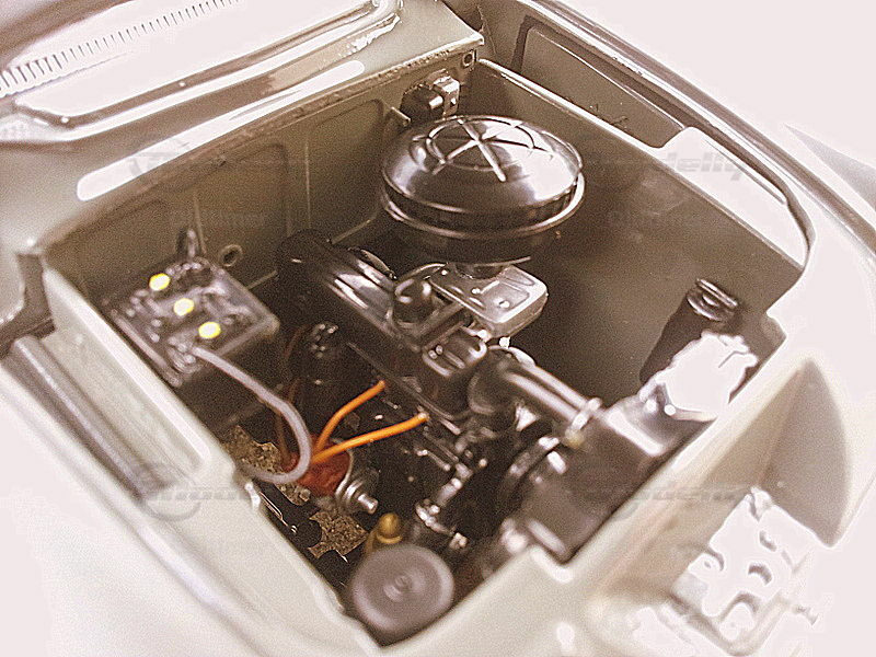 Einfach, aber sehr schön umgesetzt von Minichamps. Die Grundform ist schon etwas älter, was man unter anderen an den Scharnieren von Türen und Hauben sieht. Die Lackierung ist aber sehr gut und auch der Innenraum ist gut gemacht. Auch der Motor ist wirklich gut nachgebildet.
