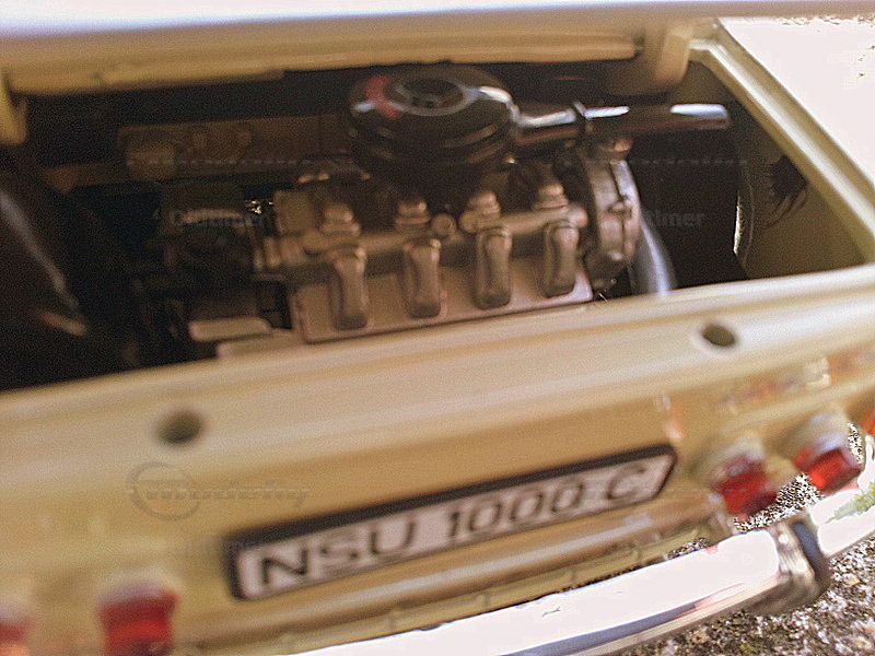 Einfach aber sehr schön umgesetztes Modell von Revell. Die Form dieses Modells stammt aus dem Jahr 2001. Auch hier wieder ein Beweis, dass Revell schon sehr "früh" sehr gute Modelle gebaut hat. Die Türen sitzen an kleinen Scharnieren und die Spaltmasse sind erfreulich gering. Die Innenausstattung ist vorbildgerecht recht "spartanisch" aber ordentlich umgesetzt. Der Motor im Heck ist ebenfalls einfach aber gut. Der "Kofferraum" vorne kann nicht geöffnet werden.