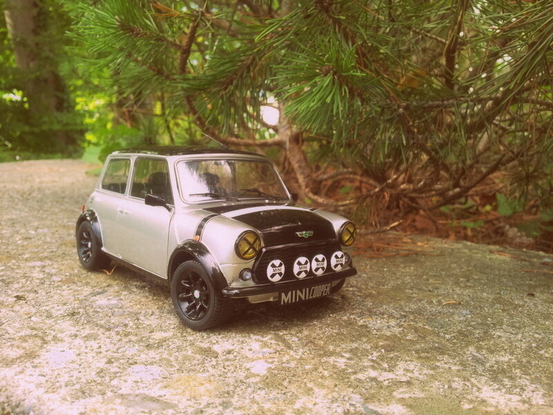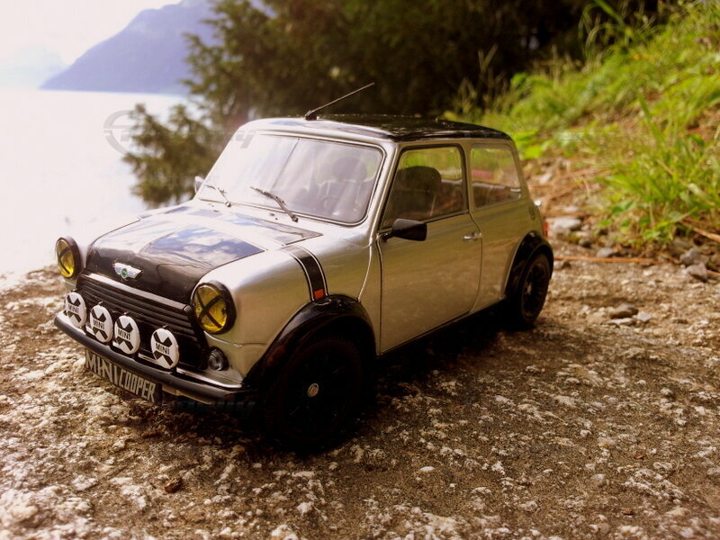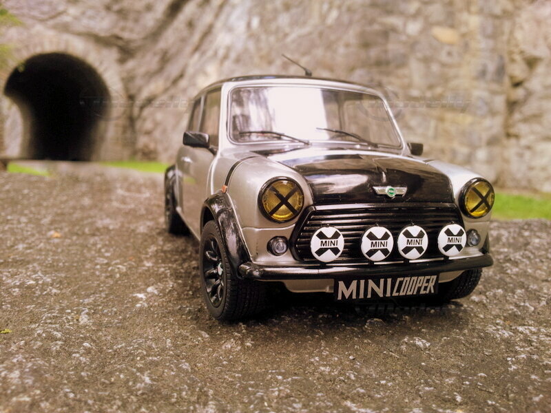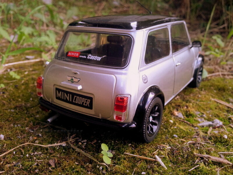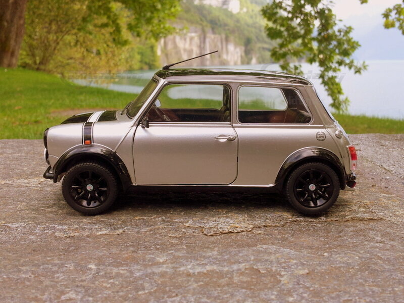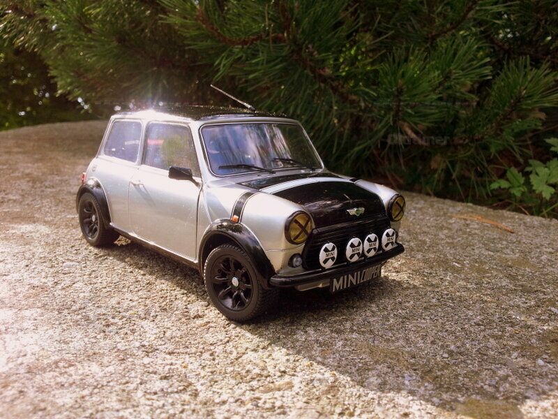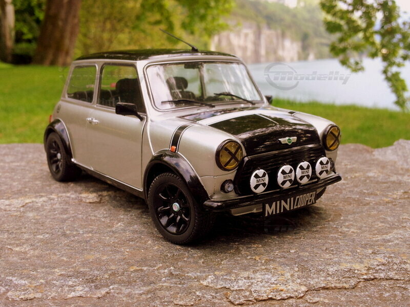 Das Modell des Mini 1.3 Sport von Solido im Maßstab 1:18 besticht durch seine Detailtreue. Die Lackierung in Schwarz und Silber hinterlässt einen eleganten und gleichzeitig sportlichen Eindruck. Die gelben Scheinwerfer und die vier zusätzlichen Scheinwerfer auf der Frontstoßstange stechen sofort ins Auge und sind typische Merkmale des Rallye-Designs. Auch die kleinen Details wie der Kühlergrill mit dem Mini-Logo, die Kotflügelverbreiterungen und die Mini-Schriftzüge auf den Nabenabdeckungen sind präzise umgesetzt.