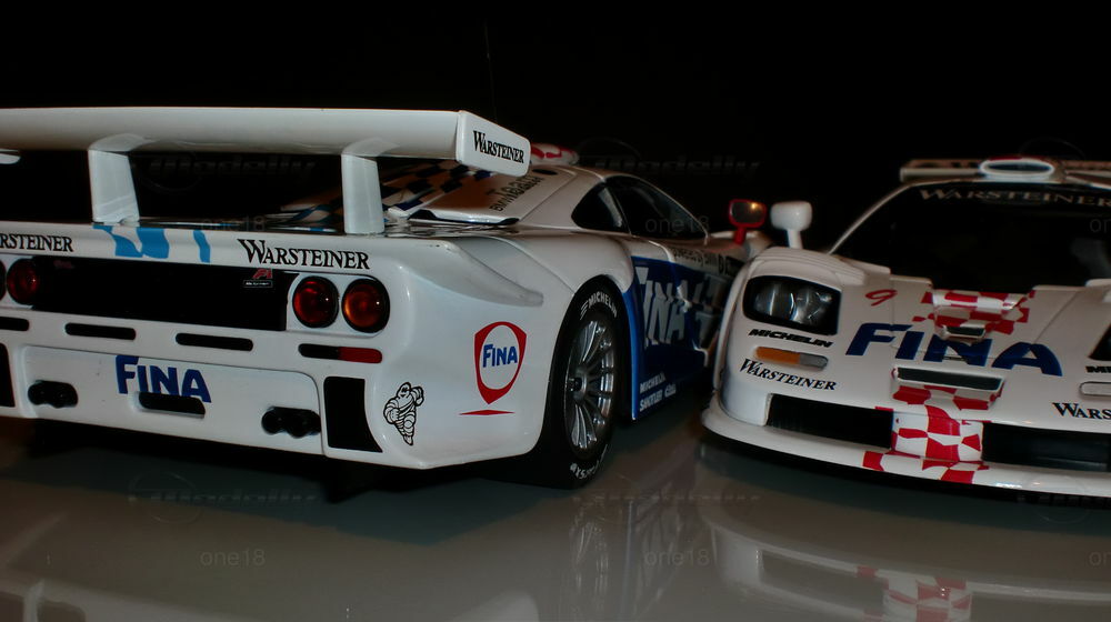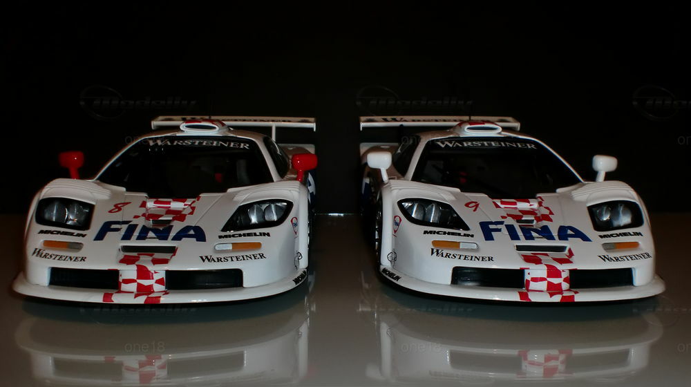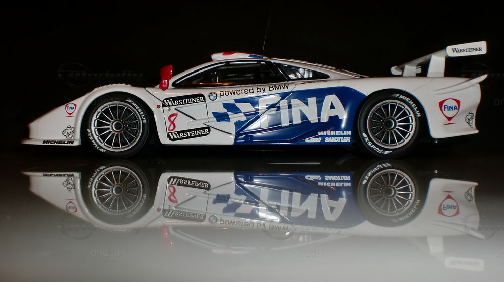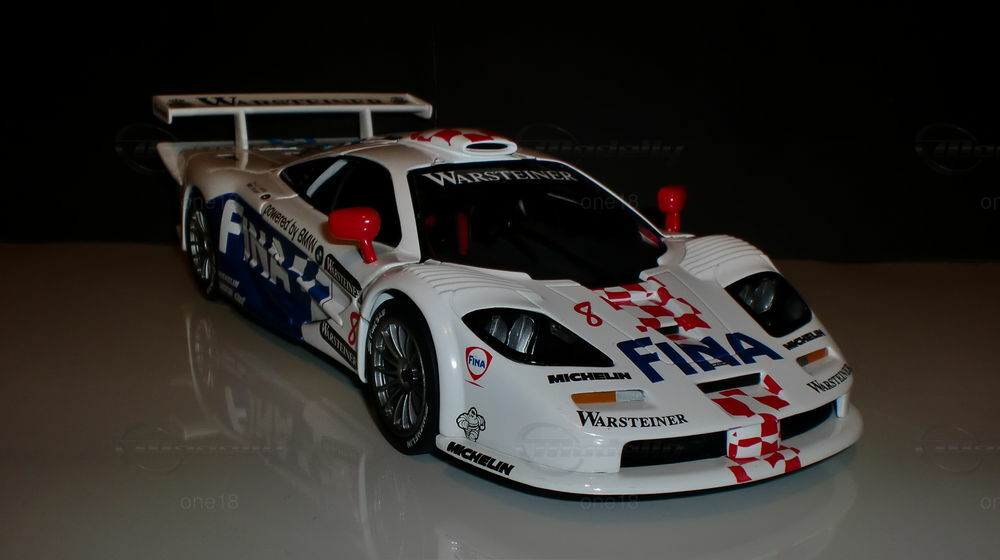 Das hier gezeigte Modellauto im Maßstab 1:18 wurde von UT Models hergestellt und gehört zur Sammlung des Modelly-Mitglieds "one18". Es handelt sich um eine detailgetreue Nachbildung des McLaren F1 GTR Langheck aus der FIA-GT Meisterschaft 1997. Auffällig sind die präzisen Sponsoring-Decals, unter anderem von Michelin, Warsteiner und FINA. Die lackierte Karosserie im charakteristischen Weiß mit blauen und roten Akzenten sowie die aufgedruckten Sponsorenlogos fangen das Erscheinungsbild des Originals perfekt ein.