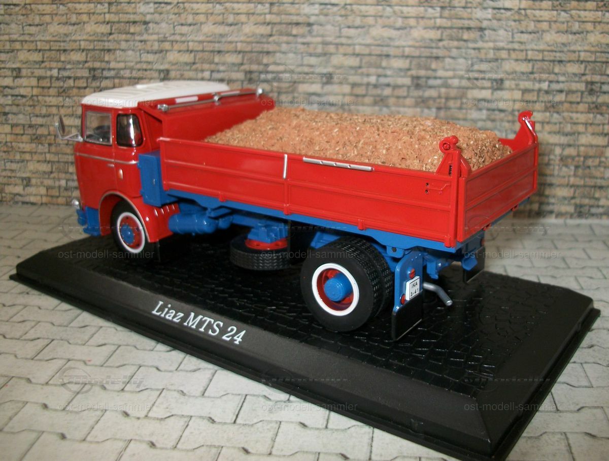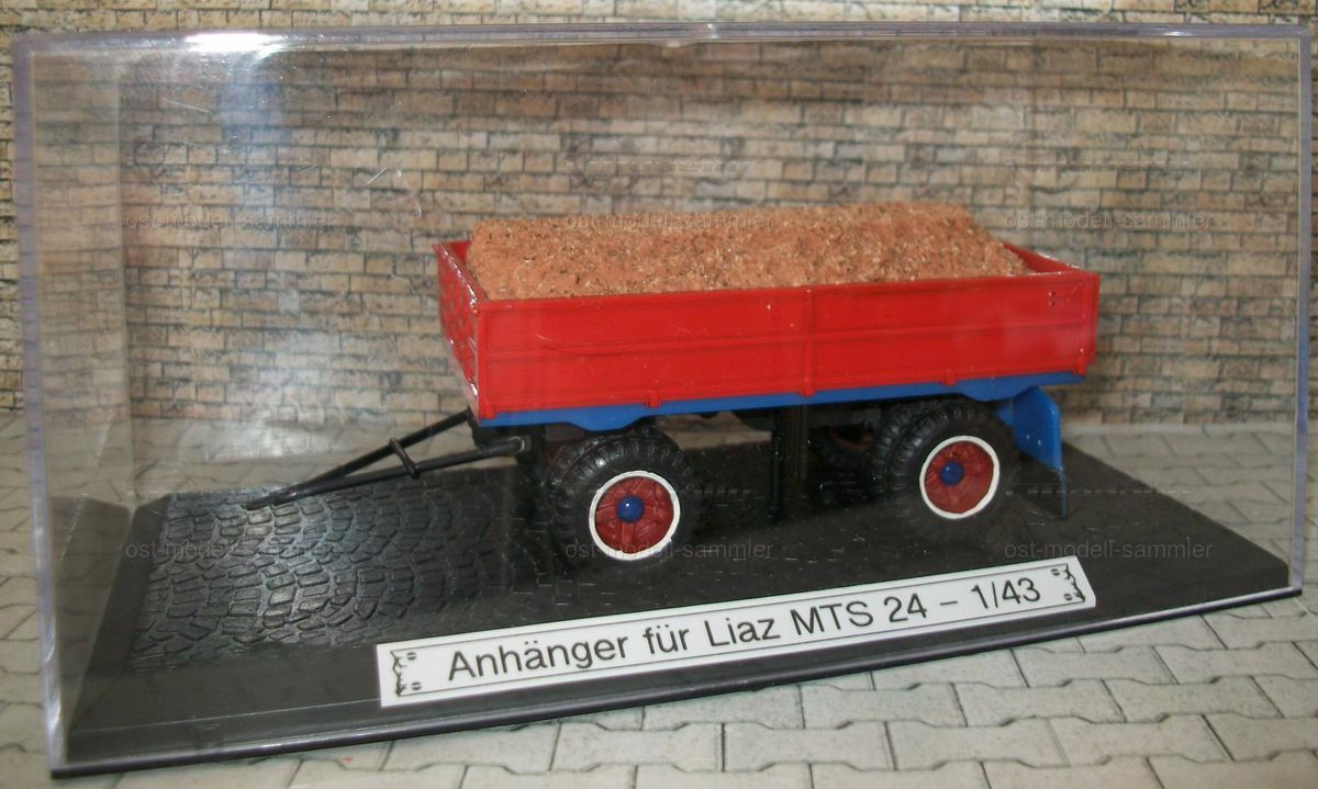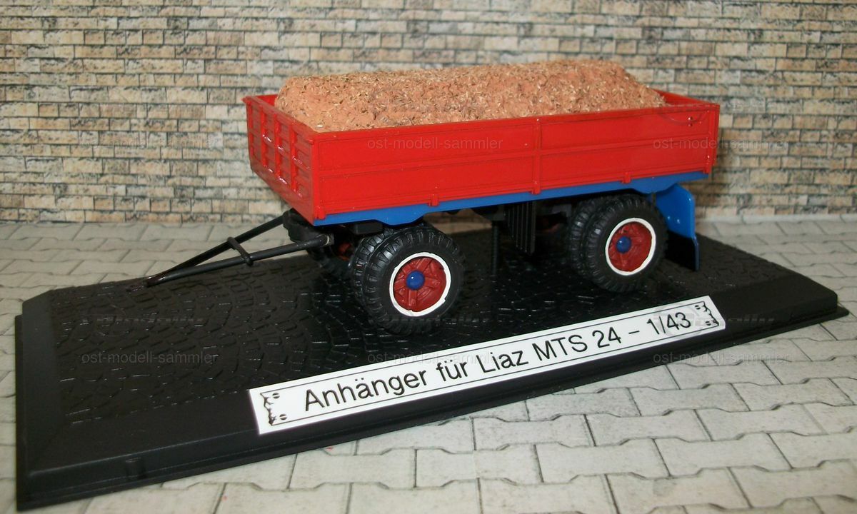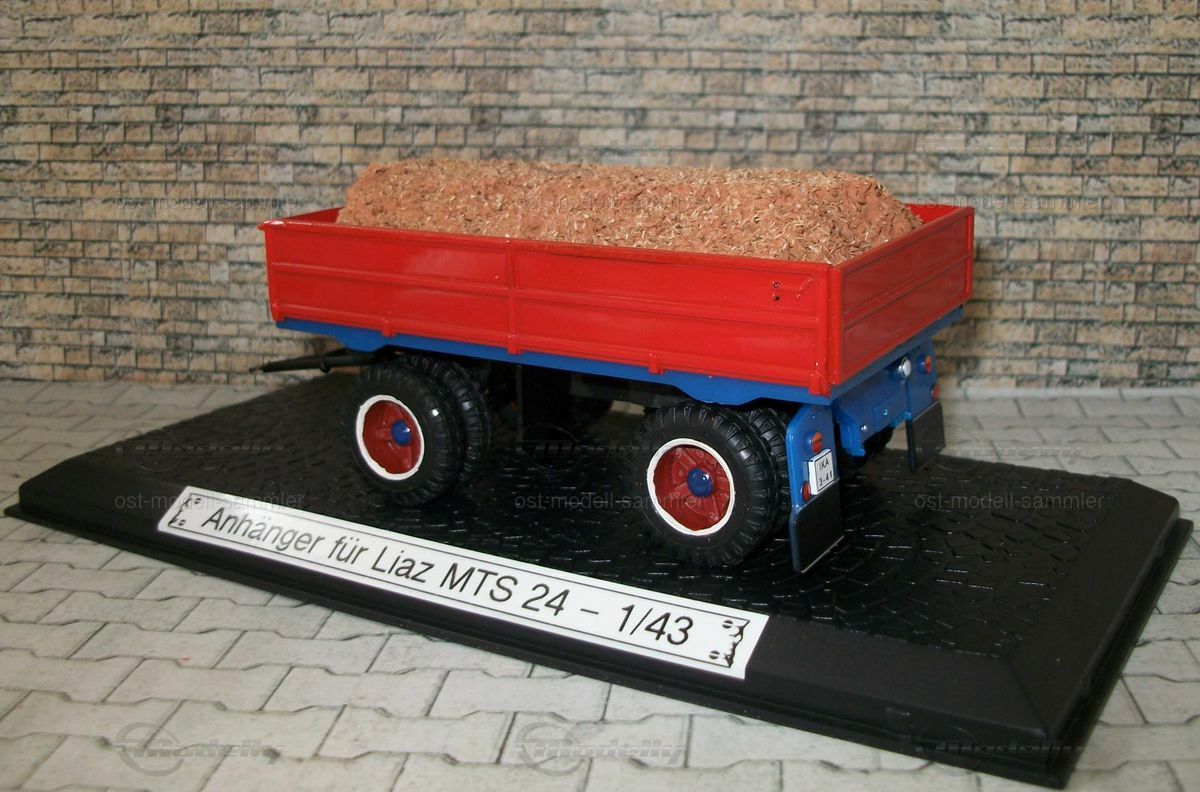 Die Anbaugeräte und der Anhänger sind ebenfalls sorgfältig nachgebildet und verleihen dem Modell eine authentische Erscheinung. Der Anhänger ist in Rot lackiert und mit einer Ladung aus Holzspänen bestückt, was die Vielseitigkeit des originalen Liaz MTS 24 widerspiegelt. Diese Detaillierung verleiht der Miniatur eine realistische Note und zeigt, wie präzise die Herstellung von Modellfahrzeugen sein kann. Sammler auf Modelly, insbesondere der Nutzer "ost-modell-sammler", werden dieses Modell sicherlich als wertvolle Ergänzung ihrer Kollektion betrachten.