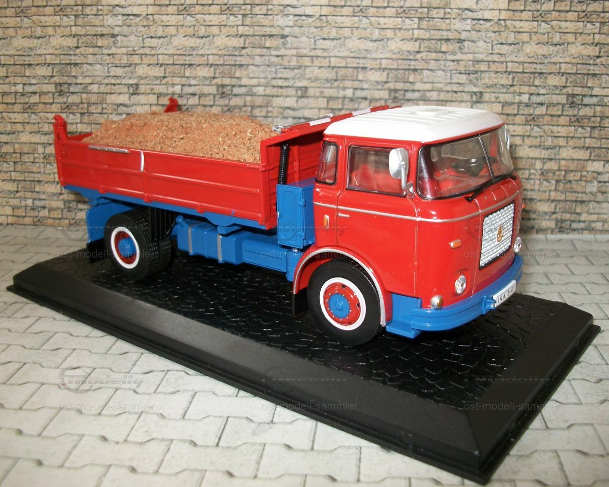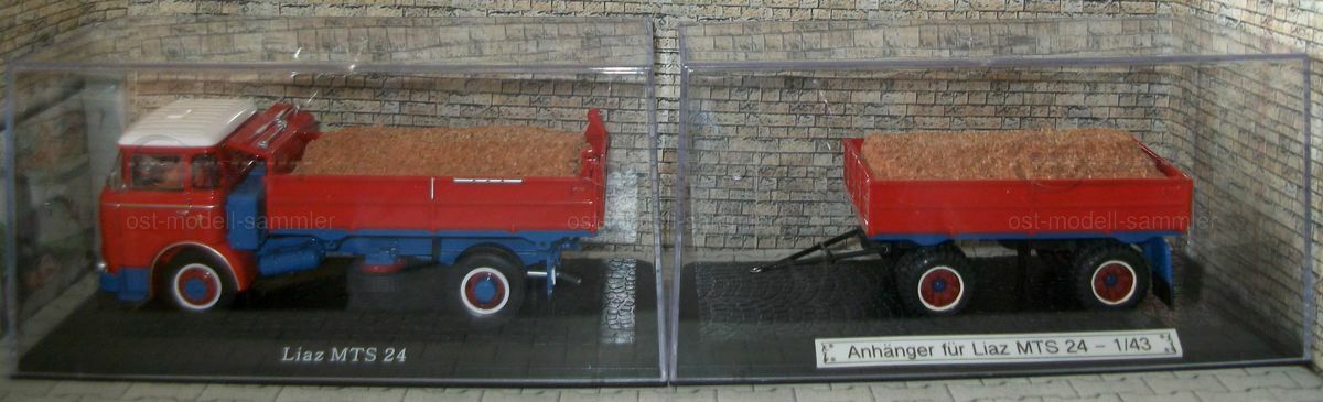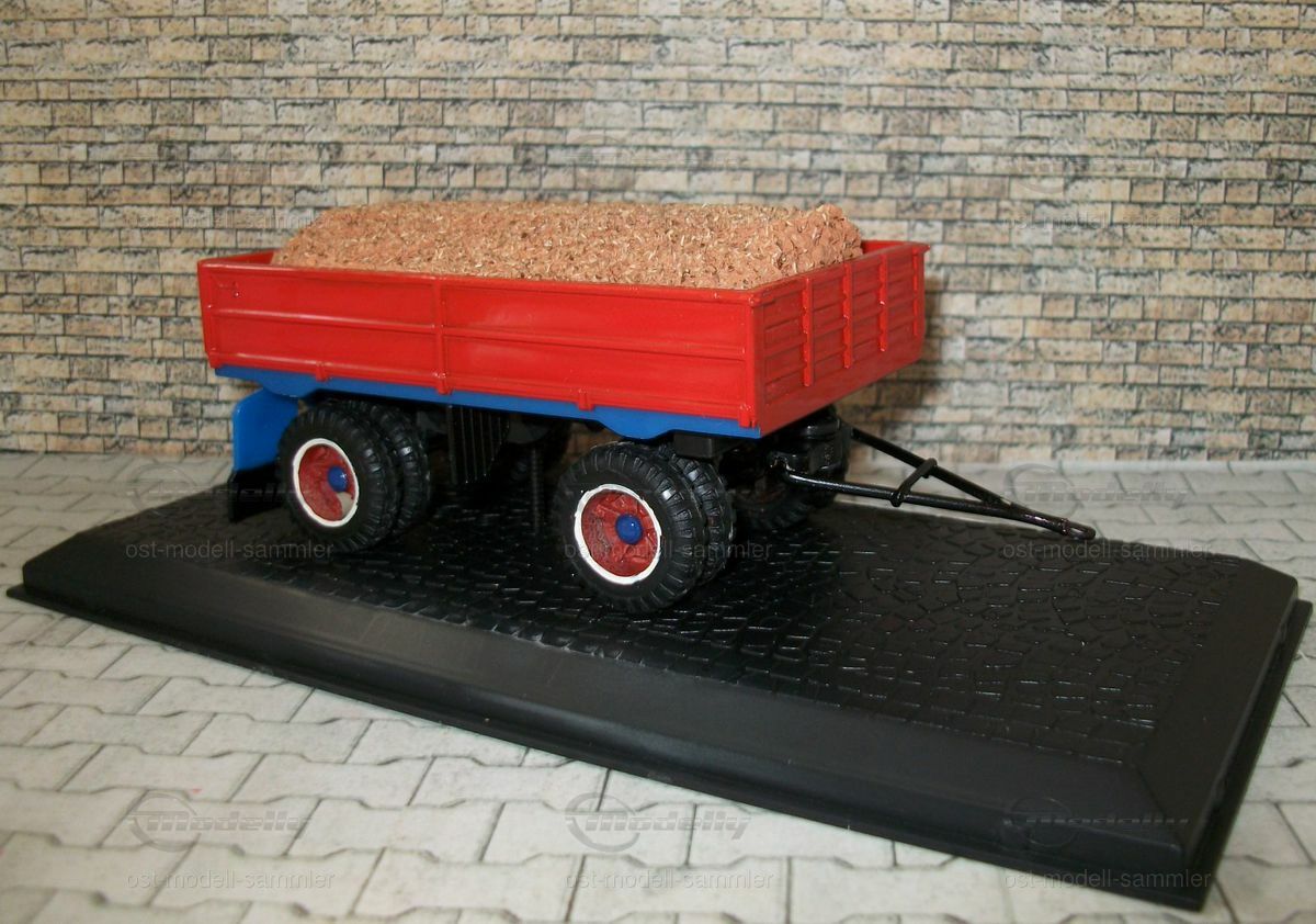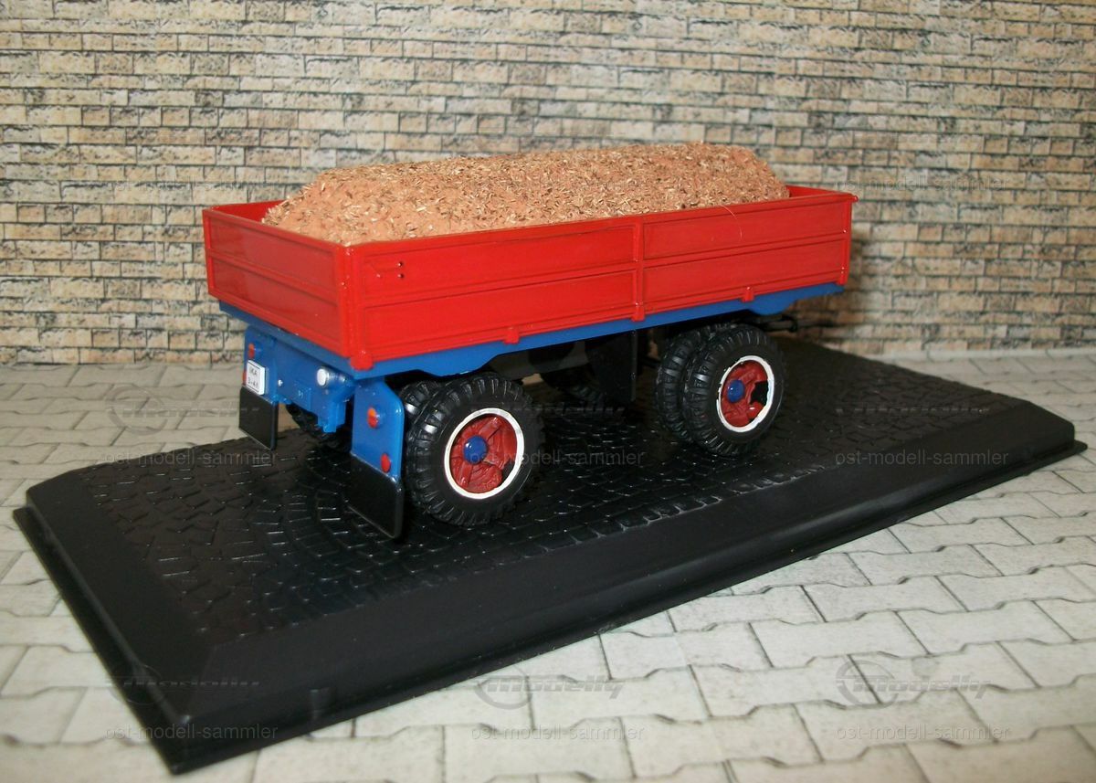 Die Anbaugeräte und der Anhänger sind ebenfalls sorgfältig nachgebildet und verleihen dem Modell eine authentische Erscheinung. Der Anhänger ist in Rot lackiert und mit einer Ladung aus Holzspänen bestückt, was die Vielseitigkeit des originalen Liaz MTS 24 widerspiegelt. Diese Detaillierung verleiht der Miniatur eine realistische Note und zeigt, wie präzise die Herstellung von Modellfahrzeugen sein kann. Sammler auf Modelly, insbesondere der Nutzer "ost-modell-sammler", werden dieses Modell sicherlich als wertvolle Ergänzung ihrer Kollektion betrachten.