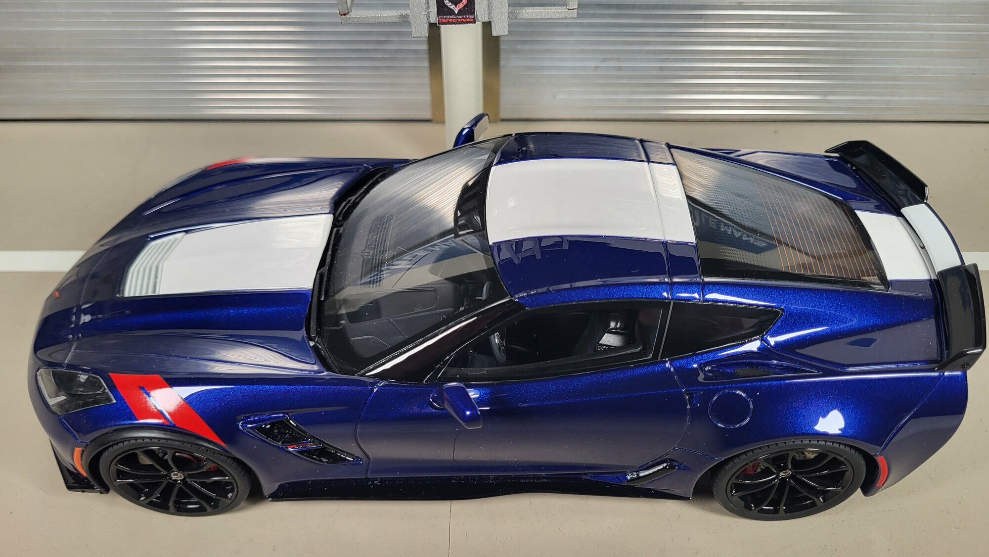 Das Modellauto beeindruckt durch seine präzise Verarbeitung und detailgetreue Replikation. Der blaue Lack in Kombination mit den weißen Streifen und roten Akzenten verleiht ihm eine markante Erscheinung. Zu den auffälligen Details gehören die akkuraten Scheinwerfer, die feinen Linien der Karosserie und die präzise Nachbildung des Interieurs, das durch die klaren Fenster gut sichtbar ist. Das Modell wurde sorgfältig gestaltet, um dem Original in jeder Hinsicht zu ähneln. Dies zeigt sich auch in den kleinen Details wie den separaten Türgriffen und Spiegeln. Die Felgen, möglicherweise gefertigt von Michelin Pilot Super Sport Reifen, sind in tiefem Schwarz gehalten und verleihen dem Modell eine aggressive und sportliche Note. Der Heckspoiler aus schwarzem Material vervollständigt das sportliche Erscheinungsbild und unterstreicht die leistungsorientierte Natur dieses Modells.