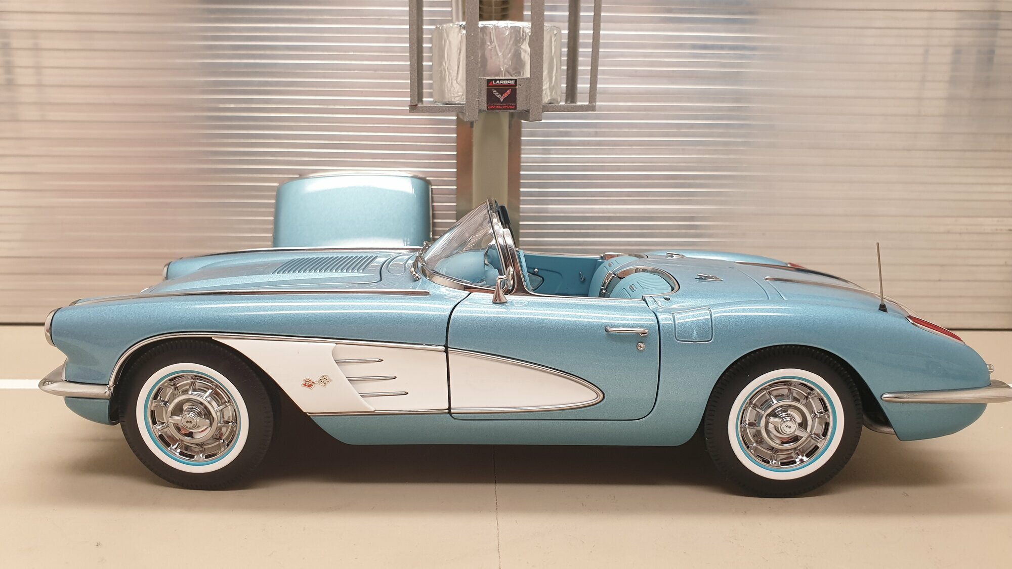 Das hier vorgestellte Modellauto ist eine 1:18-Maßstabsnachbildung, hergestellt von AUTOart Millennium. Die Qualität dieses Modellautos ist bemerkenswert, da es aus dem langlebigen Material Diecast gefertigt ist, was für eine realistische und robuste Darstellung sorgt. Das Modellauto ist detailgetreu und zeigt die Merkmale der Original-Corvette. Der Innenraum ist präzise nachempfunden, komplett mit originalgetreuen Sitzen, einem authentischen Armaturenbrett und funktionsfähigen Lenkrad. Das Modell gehört zur Sammlung von Modelly-Mitglied "Phat-T", was der Modellautosammlung sicherlich besondere Bedeutung verleiht. Die silbernen Kanten und das hellblaue Farbschema des Modells sind besonders auffällig und verleihen dem Auto einen eleganten Look.