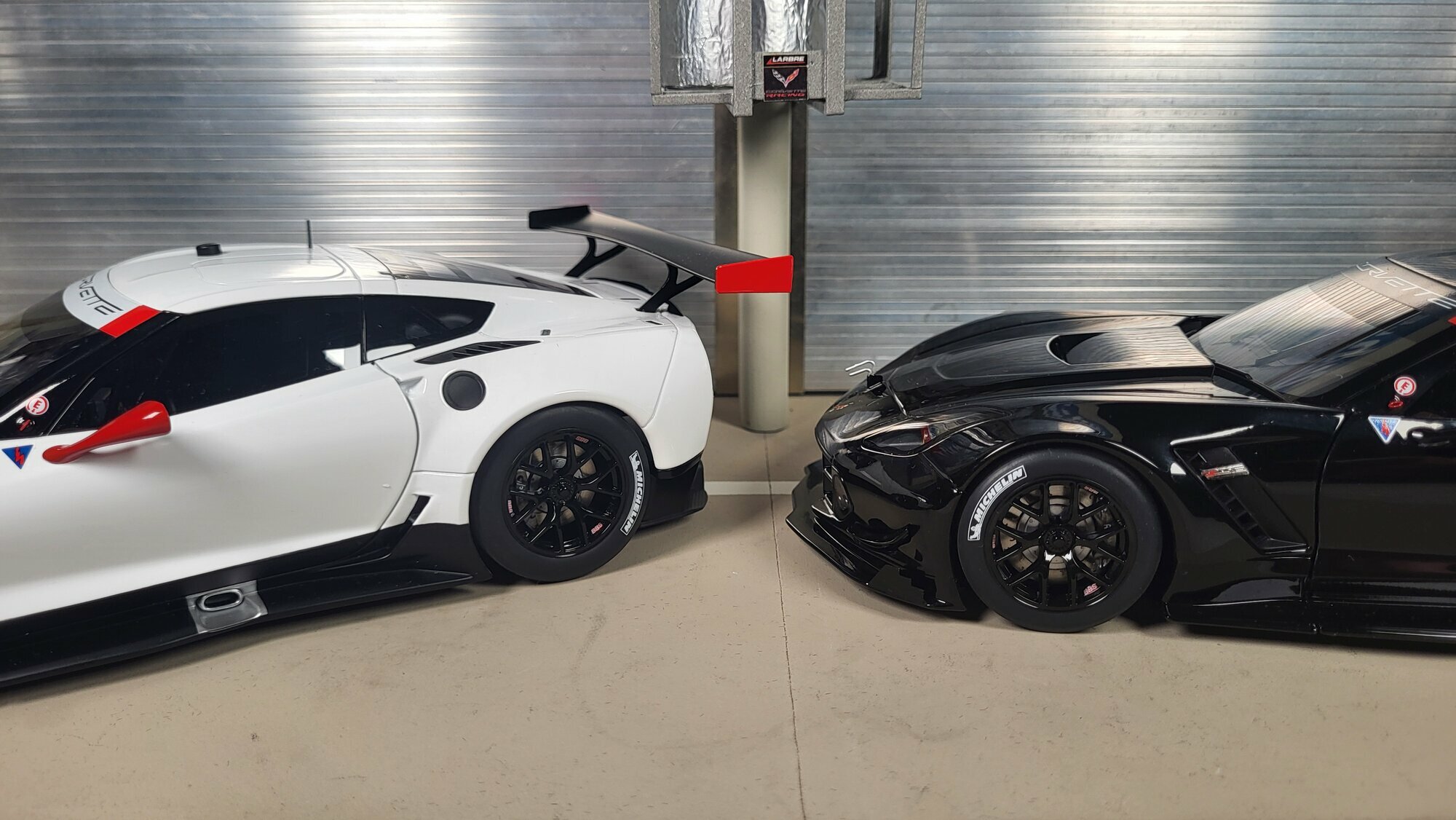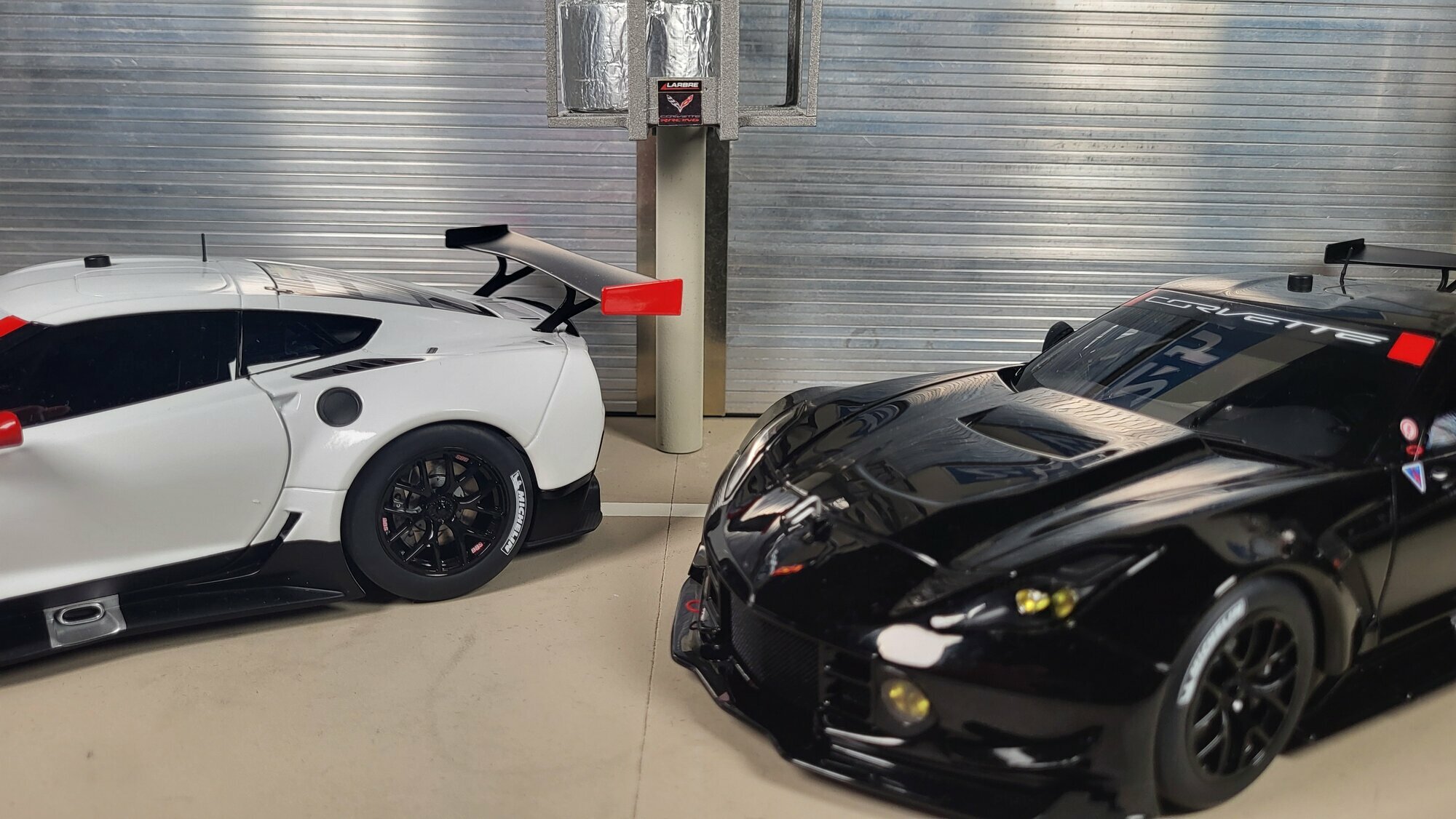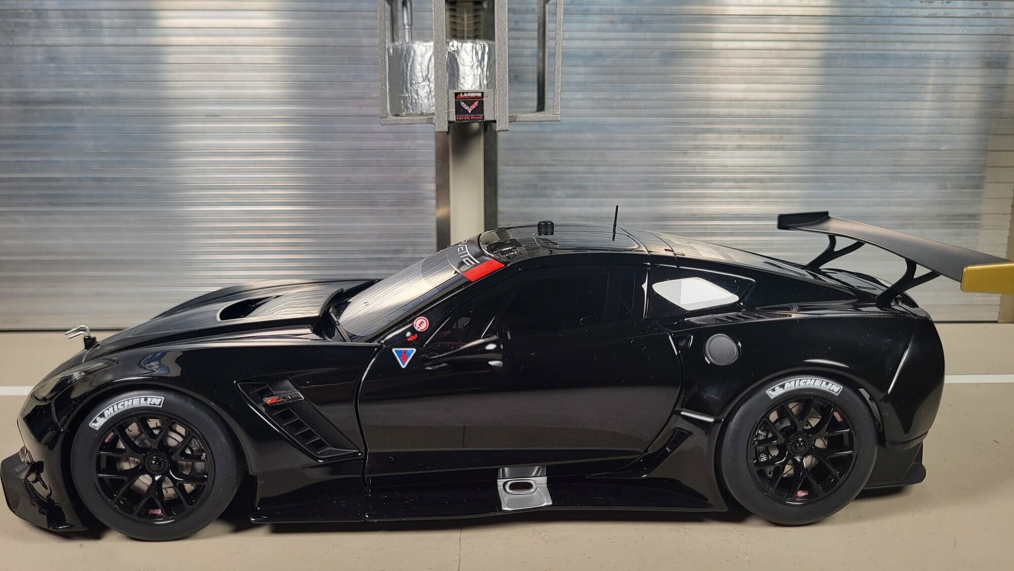 Das in den Bildern gezeigte Exemplar ist ein Modellauto im Maßstab 1:18 von AUTOart und gehört zur Sammlung von „Phat‑T“. Die Ausführung mit schwarzer Lackierung zeigt die Form der Chevrolet Corvette C7.R ohne auffällige Rennbemalung. Die Oberfläche ist glatt und gleichmäßig, die Sicken an Haube und Kotflügeln sind sauber nachgezogen. Das Dach trägt Antennen- und Sensorattrappen, wie sie bei Datenerfassung und Funk im Einsatzfahrzeug vorhanden sind. Die Front weist einen tief heruntergezogenen Splitter und seitliche Luftleitelemente auf; aus der Haube ragt die angedeutete Entlüftungsöffnung. An der Seite fallen die breiten Schweller mit Diffusoransätzen sowie die markanten seitlichen Öffnungen ins Auge. Die Zentralverschlussräder sind korrekt nachgebildet, dahinter sind gelochte Bremsscheiben sichtbar. Auf den Slicks sind die Reifenschriftzüge von MICHELIN aufgedruckt. Hinten steht der große Flügel mit auffälligen Endplatten in Schwarz und goldfarbenen Endkappen, unter denen der Diffusor erkennbar ist. Das Scheibenband trägt die „Corvette“‑Schrift, seitlich ist ein kleines Z06‑Badge eingesetzt, was auf den Technikverwandten in der Serienproduktion verweist. Die Verglasung ist dunkel, im Innenraum sind Überrollkäfig, Schalensitz und Netzstrukturen zu erkennen. Nach Angaben des Herstellers nutzt AUTOart bei dieser Baureihe eine Kunststoffkarosserie („Composite“) auf Metallboden, was die feine Detaillierung der Paneelübergänge und der kleinen Anbauteile erleichtert. Auch die Abschleppöse vorn sowie die Tanköffnung hinten links sind am Modell umgesetzt. Für Sammler ist festzuhalten: Dieses Modell ist ein 1:18‑Modell von AUTOart, überwiegend aus Kunststoff gefertigt, das die Linien und aerodynamischen Besonderheiten der Chevrolet Corvette C7.R präzise darstellt und damit eine sachliche Ergänzung der Sammlung von „Phat‑T“ bildet.