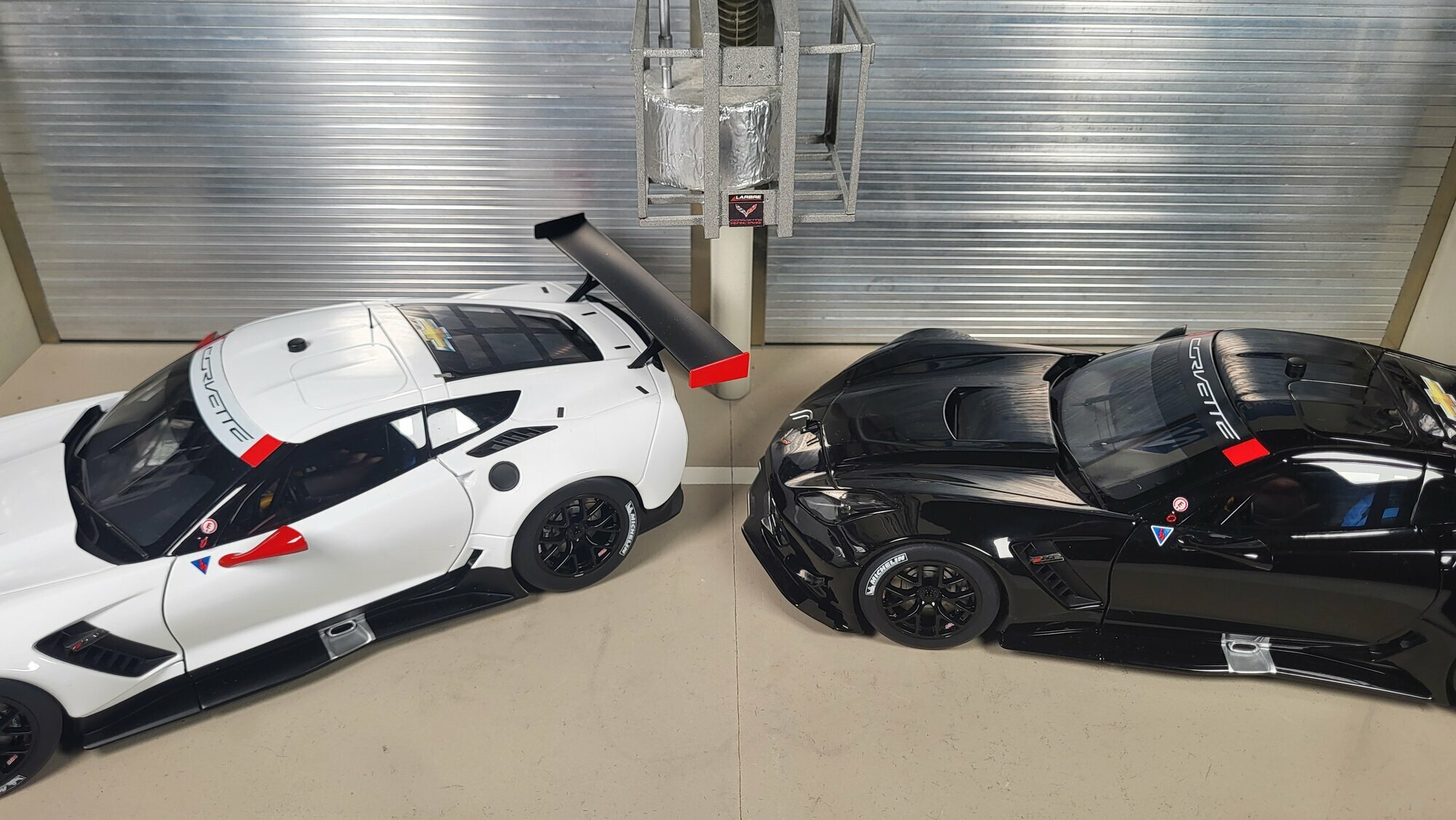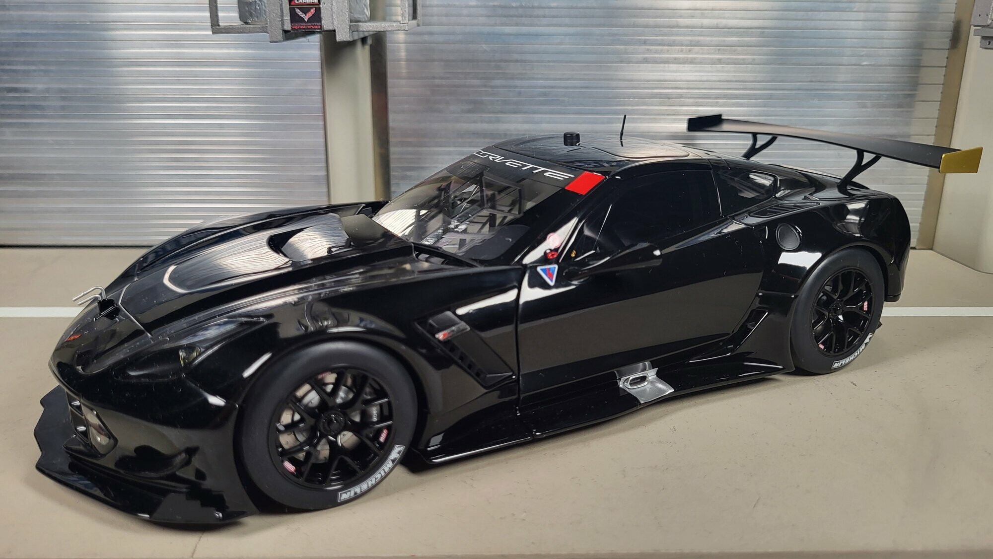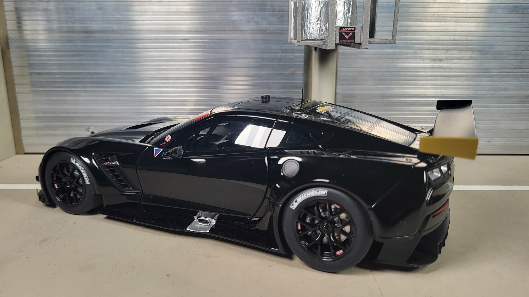 Das hier gezeigte Modell stammt aus der Sammlung des Modelly-Mitglieds „Phat-T“ und bildet die Chevrolet Corvette C7.R im Maßstab 1:18 nach. Produzent ist AUTOart, ein Hersteller, der seine „Composite“-Bauweise mit großem Kunststoffanteil verwendet. Dadurch ist die Karosserie dieses Modells überwiegend aus Kunststoff gefertigt, was präzise Oberflächen und feine Spaltmaße ermöglicht. Die reale Basis ist die Chevrolet Corvette C7.R, der werksseitige GT-Rennwagen von Corvette Racing auf Grundlage der siebten Corvette-Generation C7, Bauzeit der Generation 2014–2019. Das Design orientiert sich an der Rennversion mit breiteren Kotflügeln, tiefen Splittern und dem hohen Heckflügel. Auf den Fotos ist eine schwarze, nahezu sponsorlose Ausführung zu sehen, die die Linienführung klar zeigt. Das Modellauto im Maßstab 1:18 von AUTOart ist damit ein interessantes Stück für Sammler, die die Technik und Formensprache der Chevrolet Corvette C7.R ohne Rennlackierung studieren möchten.