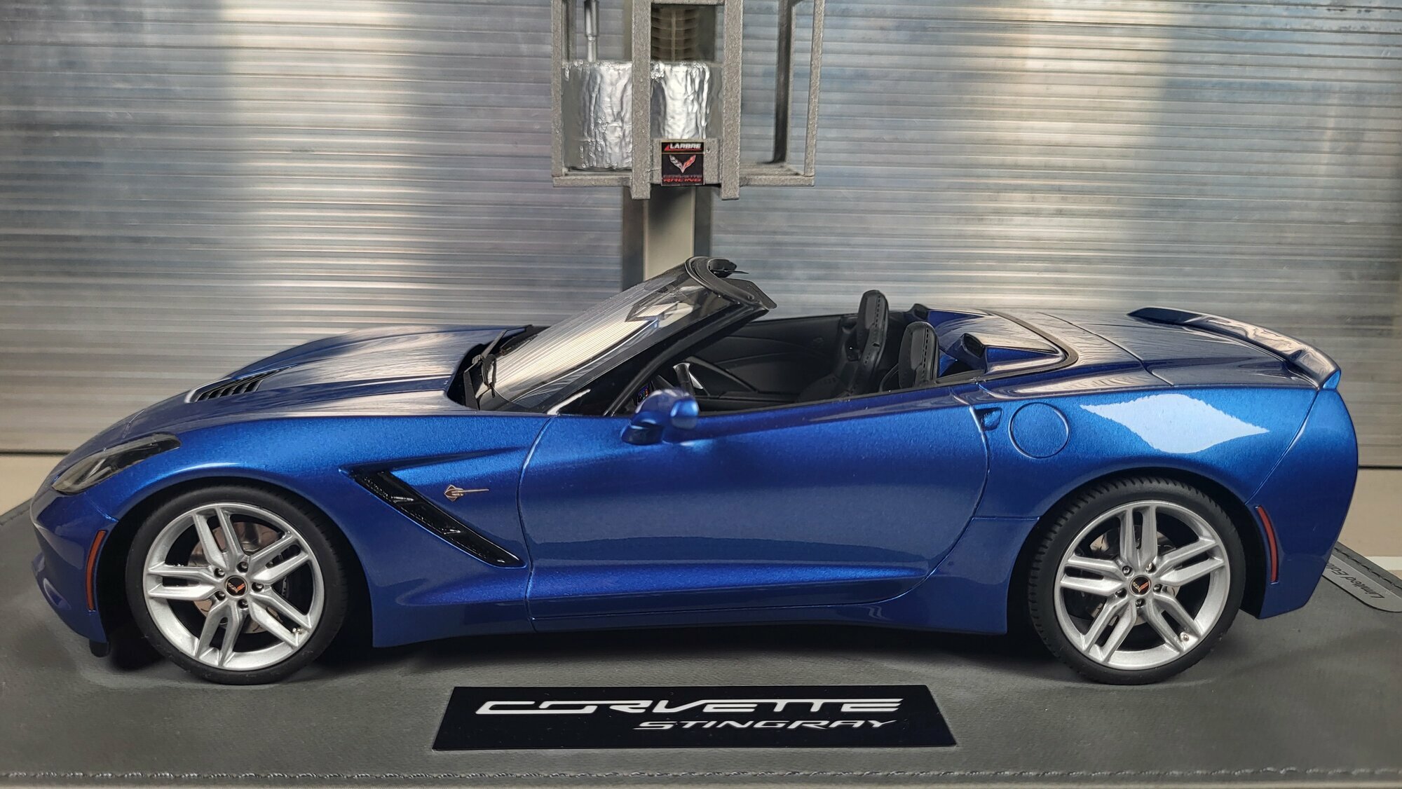 Das hier gezeigte Exponat aus der Sammlung des Modelly‑Mitglieds „Phat‑T“ ist ein Modellauto im Maßstab 1:18 von BBR Models. Gefertigt ist es aus Resin (Kunstharz), wodurch die Proportionen und scharfen Spaltkanten der Karosserie der Chevrolet Corvette C7 Stingray Convertible präzise nachgebildet werden können. Resin‑Modelle sind üblicherweise geschlossen; auch hier sind Türen, Hauben und das Verdeck nicht zu öffnen, was eine saubere Außenlinie ermöglicht. Die Fotos zeigen die stimmigen Proportionen der vorderen Haubenentlüftung, die seitlichen Kiemen und das bekannte Stingray‑Badge. Die Lackierung im tiefen Metallic‑Blau ist gleichmäßig aufgetragen und zeigt definierte Reflexe, die Kantenverläufe bleiben klar sichtbar. Die fünfarmigen Felgen, die gelocht dargestellten Bremsscheiben und die bedruckten Corvette‑Zentrierkappen geben die Optik der Serienräder der Chevrolet Corvette C7 Stingray Convertible sachgerecht wieder. Im Interieur fallen die zweigeteilten Sportsitze, das dreispeichige Lenkrad und die erhöhte Mittelkonsole mit sichtbarer Trennlinie zum Beifahrerbereich auf. Der Präsentationssockel mit umlaufender Ziernaht und dem Schild „Corvette Stingray“ ordnet das Modell eindeutig ein und erleichtert die staubfreie Vitrinenpräsentation. Dieses Fahrzeug ist somit ein Modellauto im Maßstab 1:18, produziert von BBR Models, und bildet die wichtigsten Details der Chevrolet Corvette C7 Stingray Convertible in sammlungsfreundlicher Form ab.