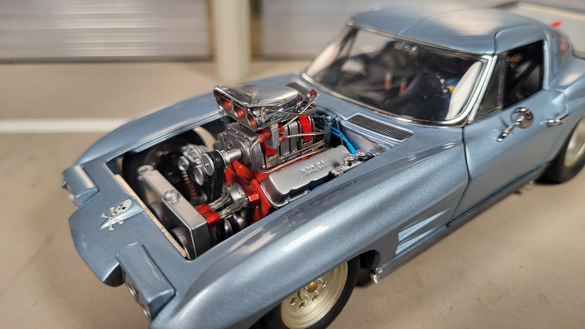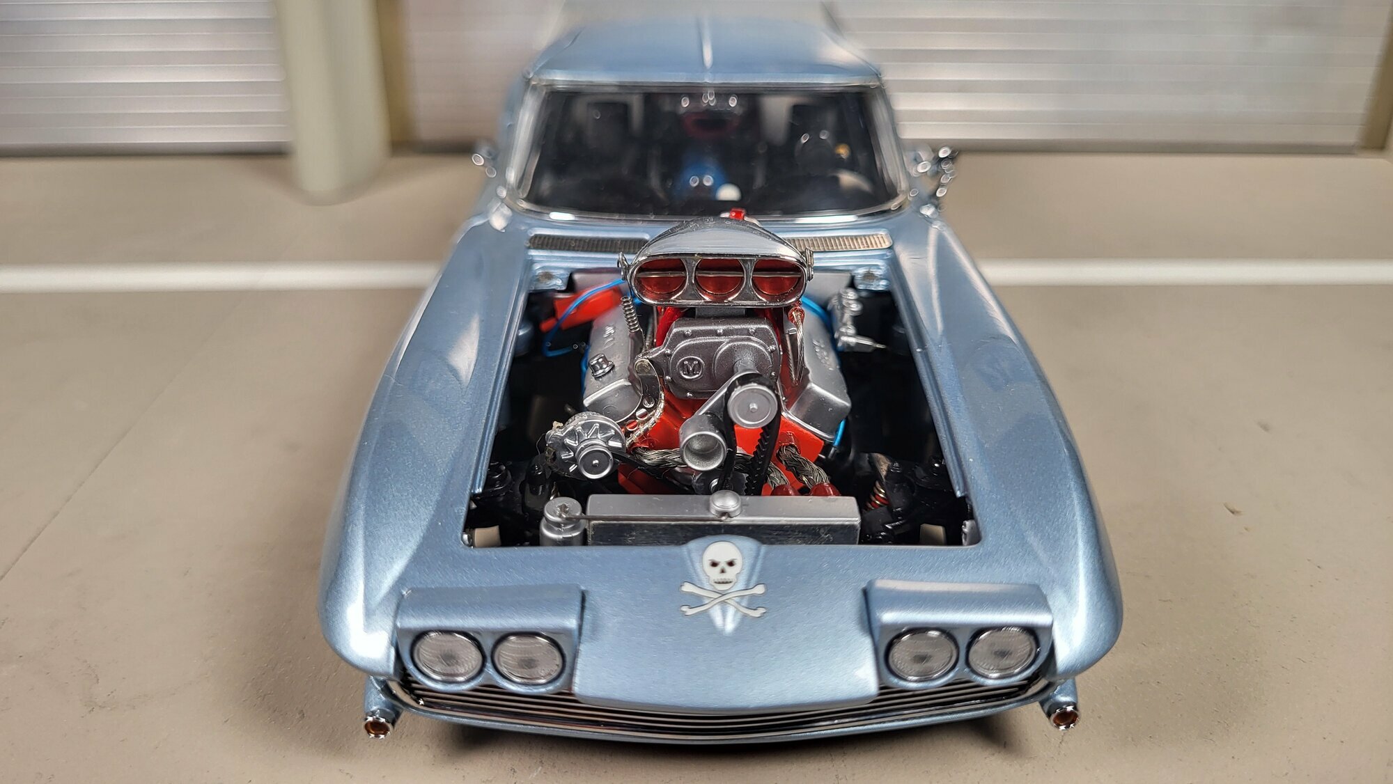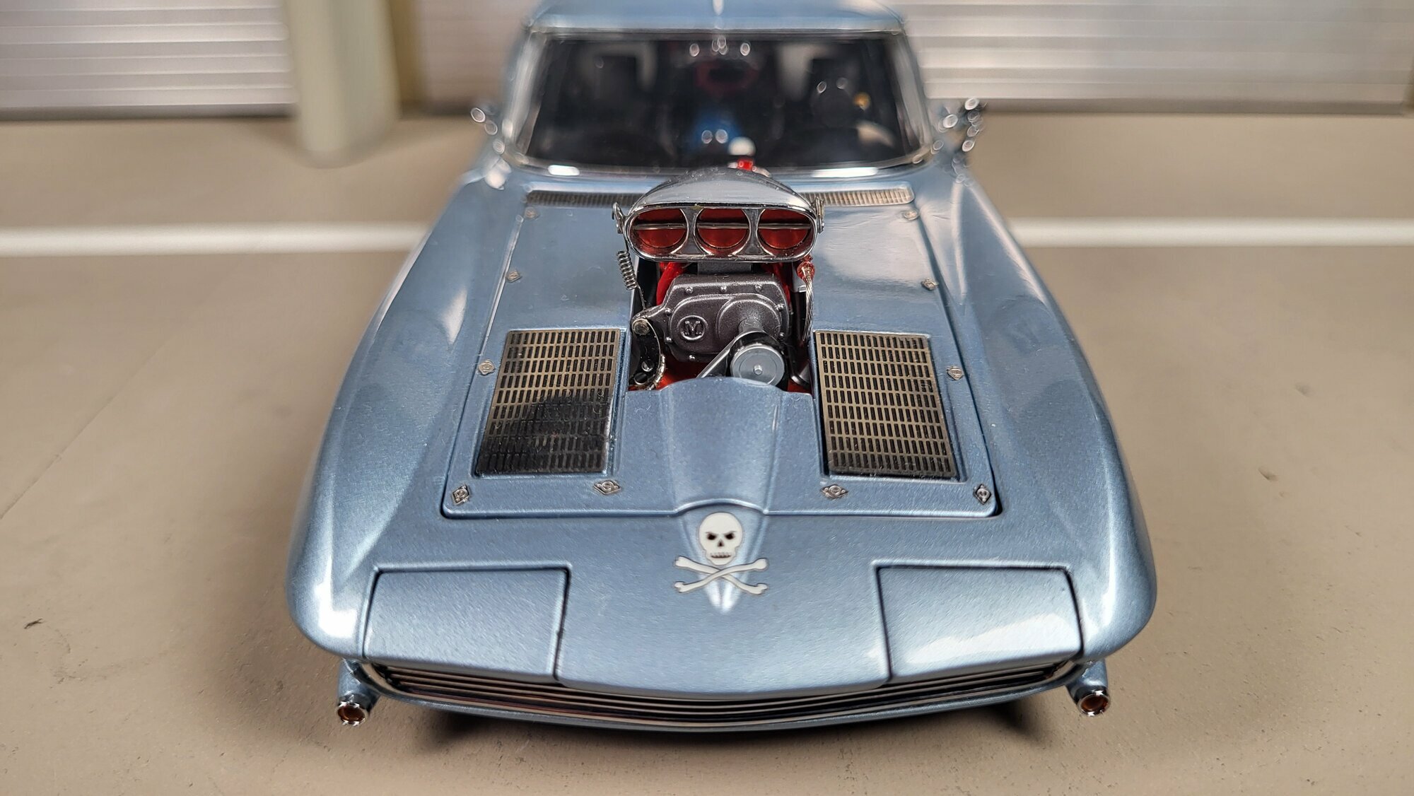 Die Lackierung des Modells ist in einem kühlen Blau gehalten, das den sportlichen Charakter der Chevrolet Corvette C2 Pro Mod Dragster unterstreicht. Die Vorderseite des Modells zeigt einen Totenkopf mit gekreuzten Knochen, ein markanter Hinweis auf die kraftvolle Performance des Originals. Die goldenen Felgen und die roten Details des Motors setzen zusätzliche optische Akzente. Diese präzise Nachbildung ist nicht nur ein Highlight für Sammler, sondern bietet auch detaillierte Einblicke in das Design und die Ästhetik eines der bedeutendsten amerikanischen Sportwagen der Automobilgeschichte.