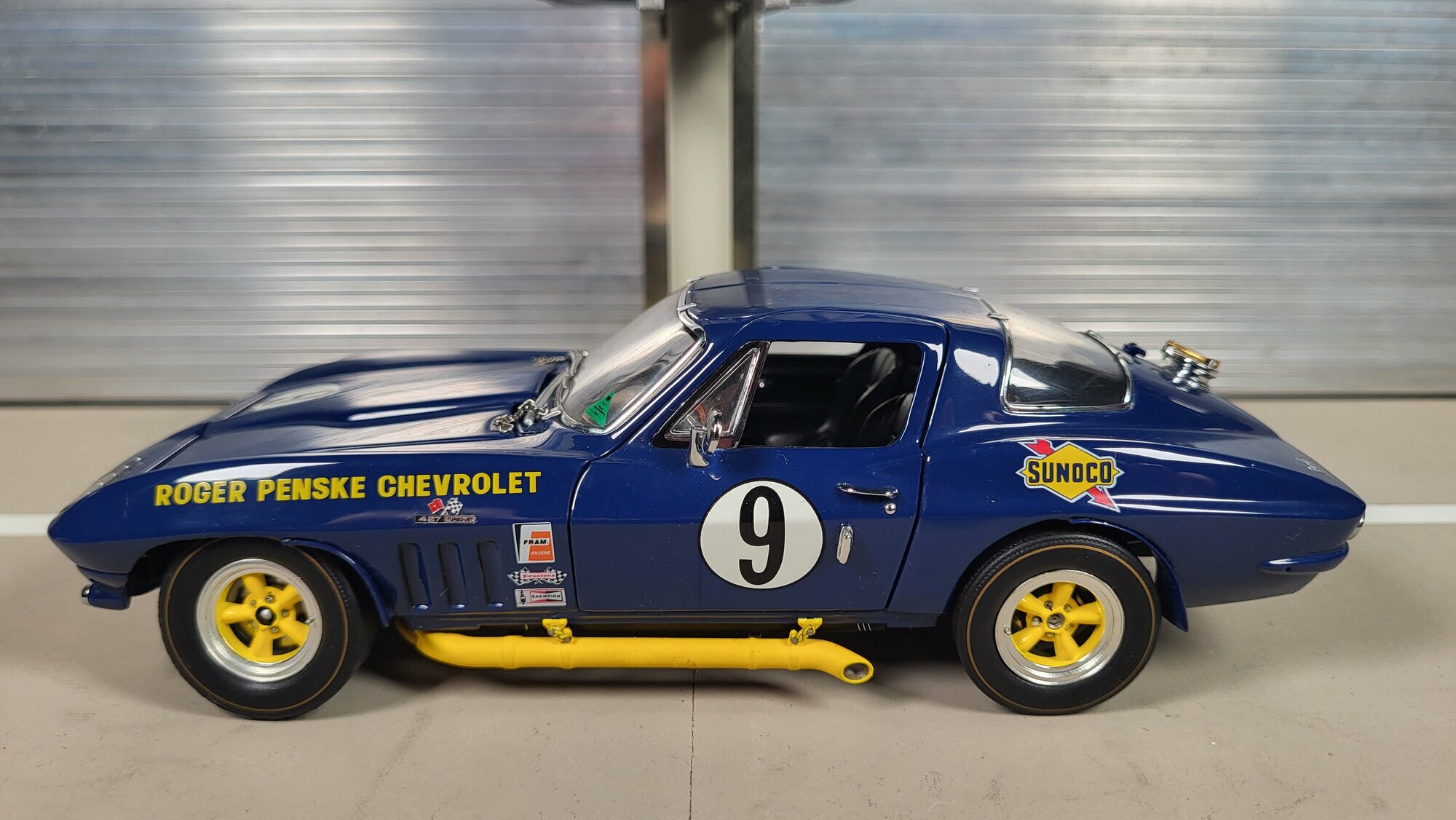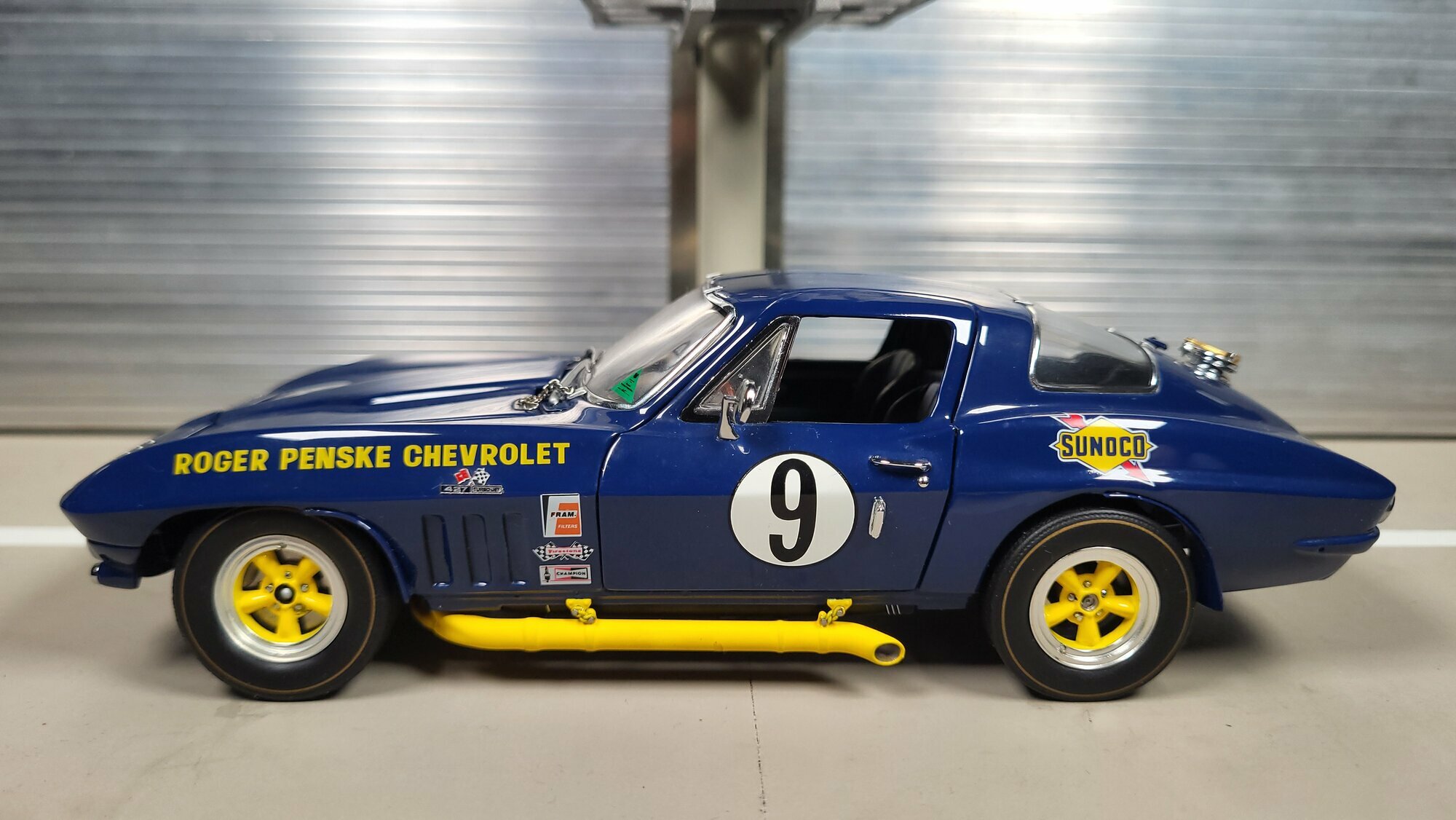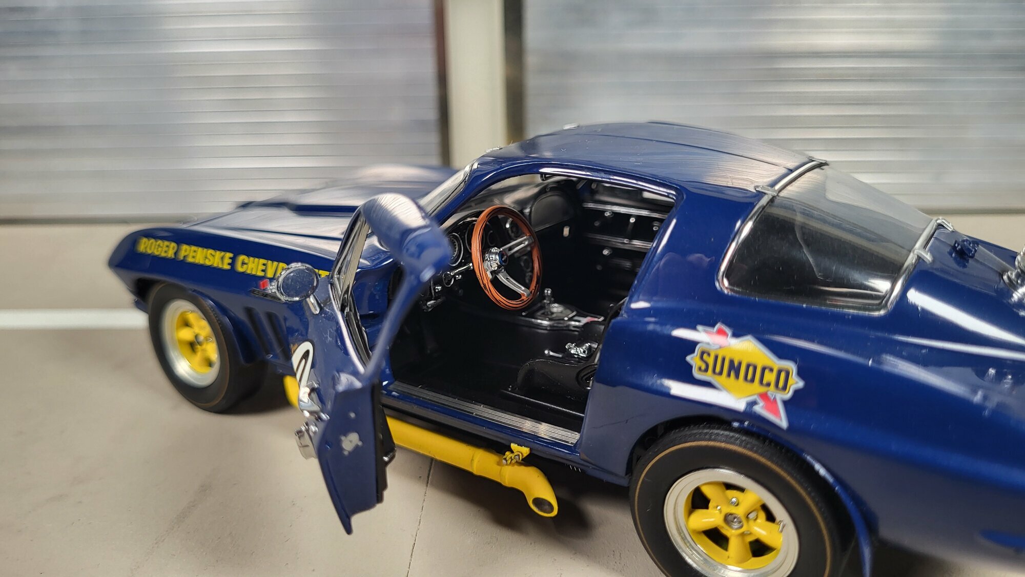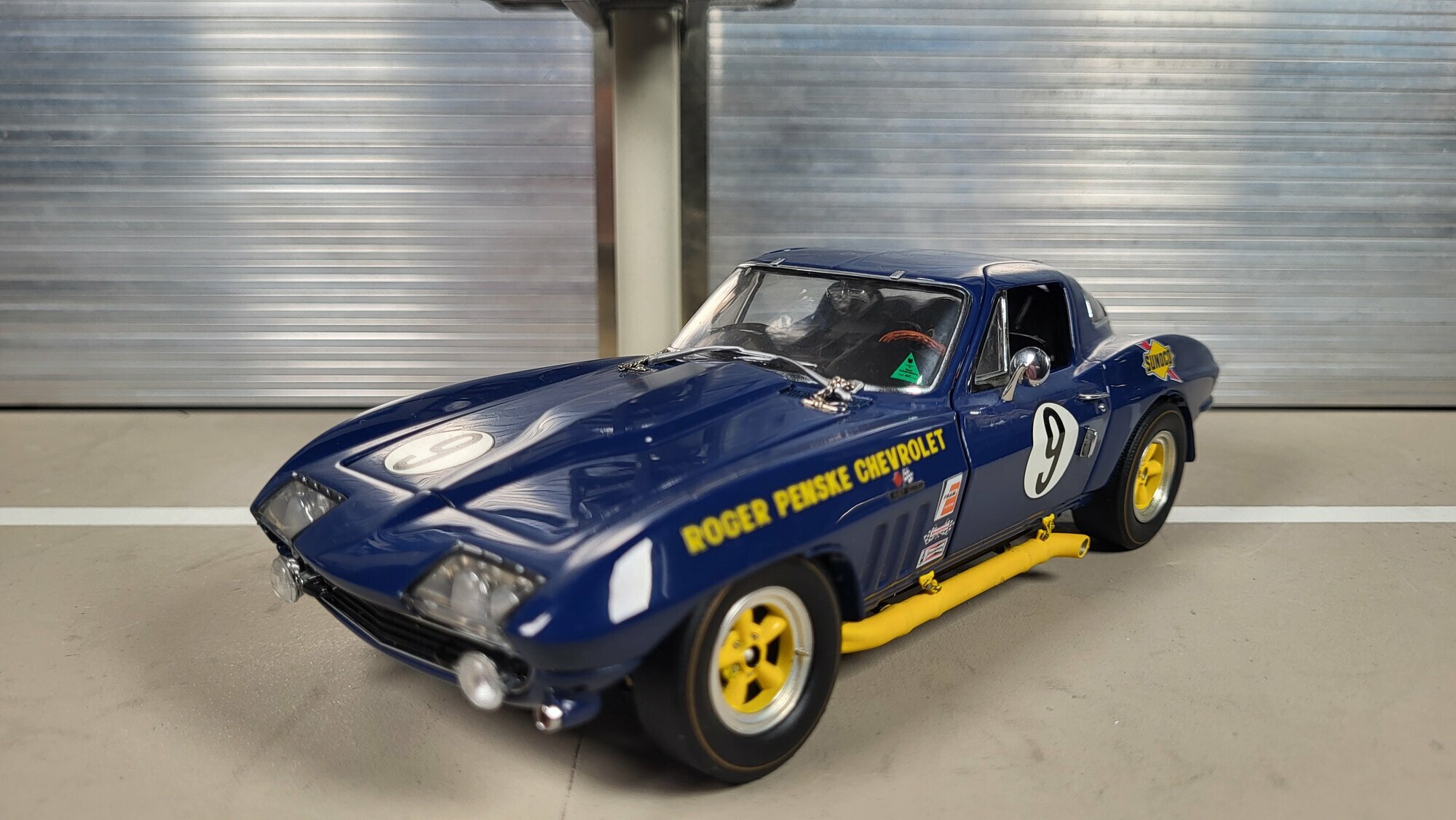 Das Modellauto ist ein bemerkenswertes Beispiel für Detailgenauigkeit und Handwerkskunst im 1:24 Maßstab von Danbury Mint. Besonders auffällig sind die Sponsorenaufkleber von Sunoco und Roger Penske Chevrolet, die dem Fahrzeug einen authentischen Rennsport-Look verleihen. Die gelben Akzente an den Felgen und Seitenschwellern ergänzen die blaue Grundlackierung und lassen das Modellauto lebendig und dynamisch wirken. Die genauen Details des Innenraums, wie das Lenkrad, die Instrumente und die Rennsitze, sind sorgfältig nachgebildet und spiegeln die Qualität und Sorgfalt bei der Herstellung dieses Diecast-Modells wider. Diese Miniatur, die Teil der Sammlung von Modelly-Mitglied „Phat-T“ ist, bietet Sammlern eine wertvolle Ergänzung und ein Erinnerungsstück an die glorreiche Ära der Chevrolet Corvette C2 Sting Ray im Motorsport.