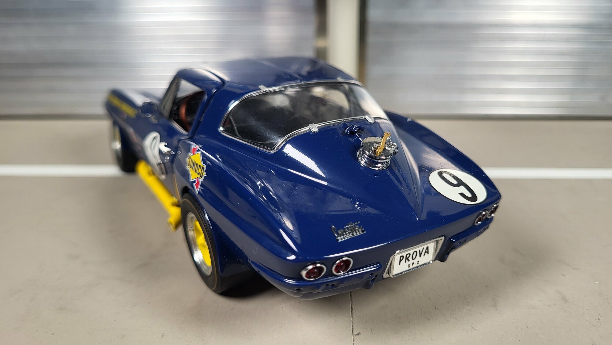 Das hier vorgestellte Modellauto in 1:24 Maßstab, hergestellt von Danbury Mint, basiert auf einer der erfolgreichsten Rennversionen der Chevrolet Corvette C2 Sting Ray. Es ist aus hochwertigem Diecast-Material gefertigt und zeigt viele Details des Originals. Das Modellauto besticht durch seine exakte Nachbildung der Karosserie, der Form und der Farben. Auf den Fotos ist das Fahrzeug in einem auffälligen Blau mit gelben Felgen und Seitenschwellern zu sehen, was dem Original entspricht, das unter anderem von Sunoco und Roger Penske Chevrolet gesponsert wurde. Die Lackierung und die Beschriftungen sind präzise und realitätsgetreu umgesetzt, wodurch das Modell zu einem bemerkenswerten Sammlerstück für Modell- und Autofans wird.