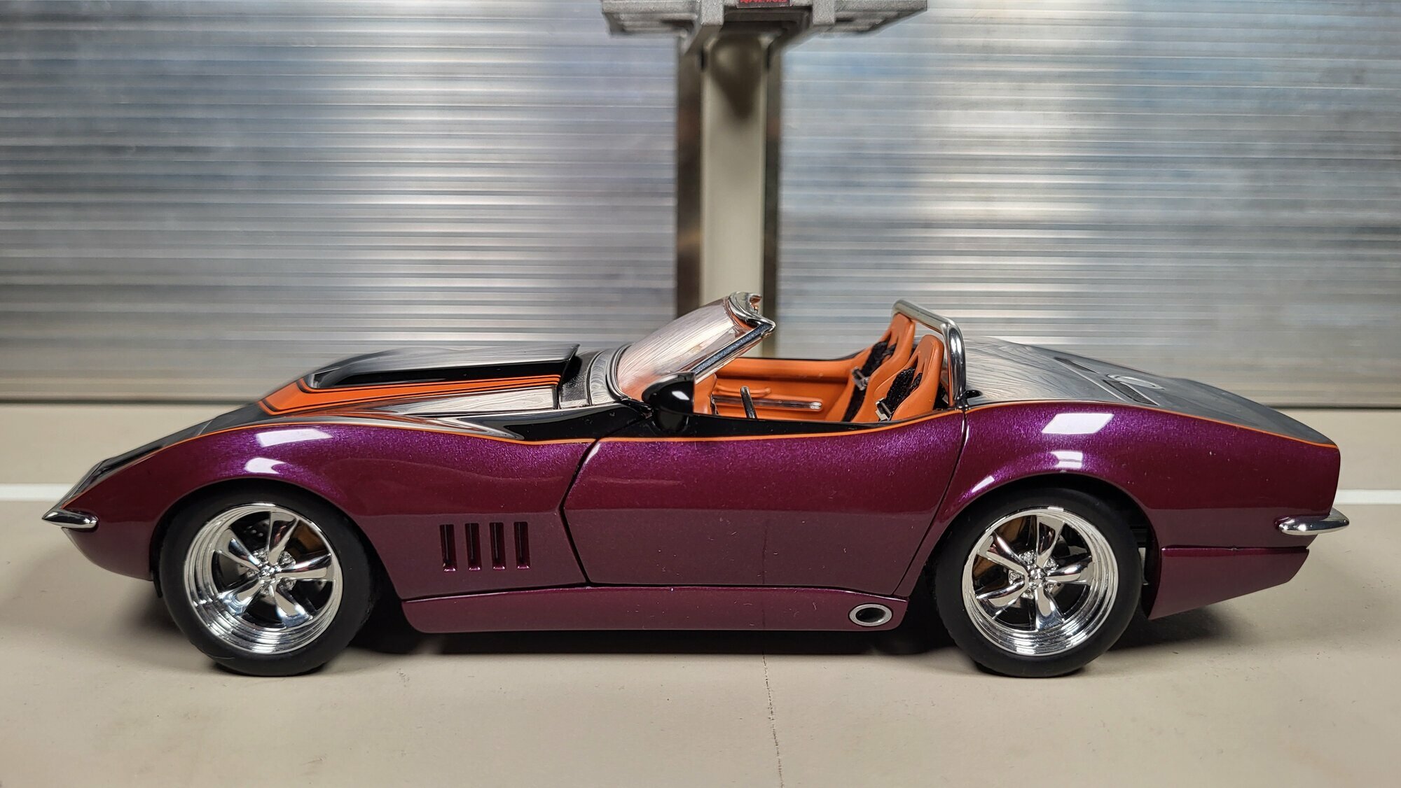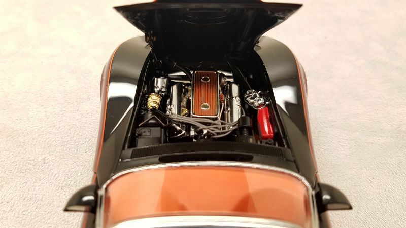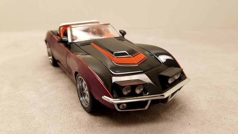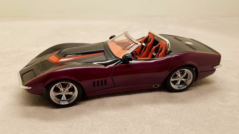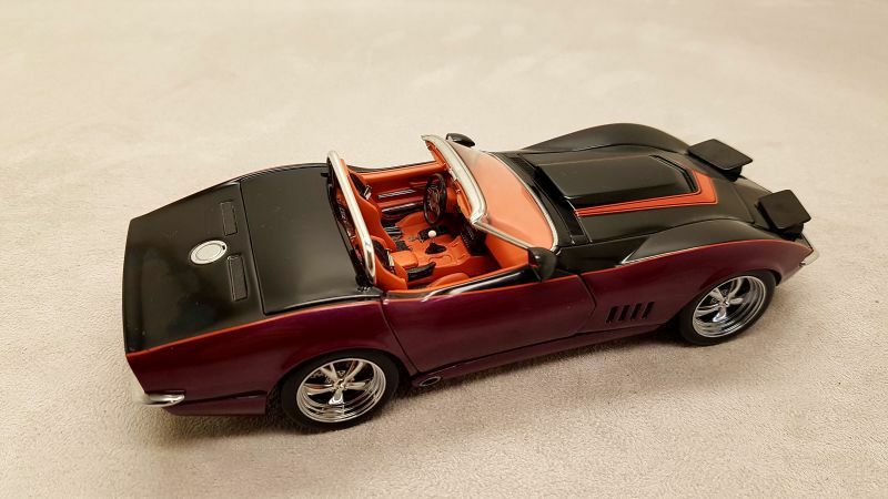 Das maßstabsgetreue Modell im 1:24 Format von Danbury Mint, das in der Sammlung von Modelly-Mitglied "Phat-T" zu finden ist, ist aus hochwertigem Diecast-Material gefertigt. Dieses Miniaturmodell fängt die Essenz der Chevrolet Corvette C3 Convertible Pro Touring perfekt ein. Auffällig ist die Zweifarbenlackierung in Schwarz und Purpur mit Akzenten in Orange, die der Karosserie eine dynamische und zugleich klassische Optik verleiht. Die Felgen dieses Modells sind gut erkennbar als Werke von American Racing, die durch ihr markantes und sportliches Design ein Highlight darstellen.