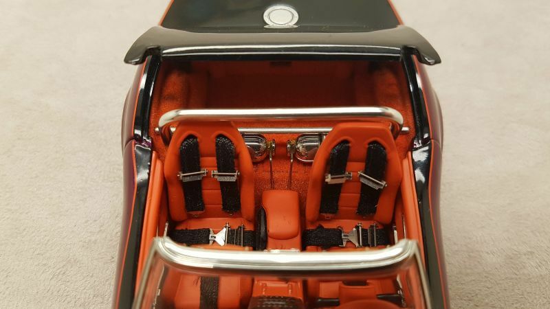 Das Modellauto zeichnet sich durch seine detaillierten Elemente wie die abnehmbaren Scheinwerferabdeckungen und den verchromten Überrollbügel hinter den Sportsitzen aus. Diese feinen Details entsprechen genau den Merkmalen des Originals. Das Interieur des Modells ist mit orangen Sitzpolstern ausgestattet, die mit schwarzen Akzenten abgesetzt sind – eine Hommage an die Performance-Ambitionen dieses besonderen Fahrzeugtyps. Das Modell ist ein Muss für jeden Sammler hochwertiger Automobilminiaturen und bietet eine authentische Wiedergabe der Chevrolet Corvette C3 Convertible Pro Touring. Es repräsentiert nicht nur ein Stück Automobilgeschichte, sondern auch das handwerkliche Können von Danbury Mint im Bereich der Miniaturfahrzeuge.