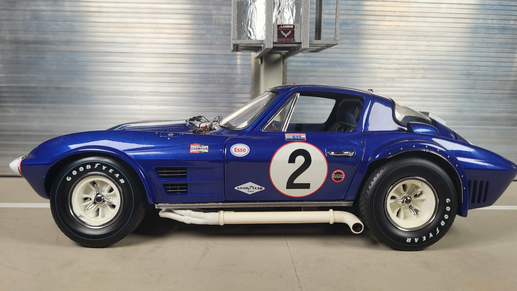 Das vorliegende Modellauto im 1:18 Maßstab, hergestellt von Exoto Racing Legends, ist ein präzise gefertigter Nachbau des Chevrolet Corvette C2 Grand Sport. Dieses Modell aus hochwertigem Die-Cast-Material zeichnet sich durch seine detaillierte Verarbeitung und realistische Nachbildung der Originaldetails aus. Auf den Bildern, die von dem Modelly-Mitglied "Phat-T" bereitgestellt wurden, sind die detaillierte Lackierung und die angebrachte Fahrtstreifennummer "2" deutlich zu sehen. Die sorgfältige Verarbeitung zeigt sich auch an den Sponsorenaufklebern wie Esso und Champion, die stolz auf der Karosserie platziert sind. Der Blauton des Wagens wird durch weiße Rennstreifen kontrastreich ergänzt, was das Modell zu einem Blickfang macht.