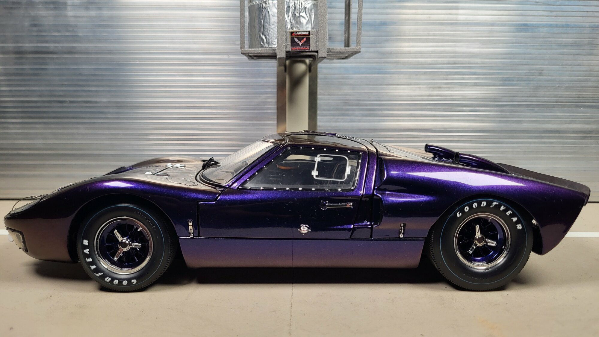 Das Miniaturmodell des Ford GT40 MK II von Exoto Racing Legends im 1:18 Maßstab ist eine sorgfältig gefertigte Nachbildung des legendären Rennwagens. Dieses Modellauto, das auf den Fotos der Sammlung von Modelly-Mitglied "Phat-T" zu sehen ist, besteht aus dem Material Diecast, das für seine Langlebigkeit und Detailgenauigkeit bekannt ist. Auffällig ist die präzise Nachbildung aller Details des Originals, einschließlich der Lackierung, der Motorhaubenverschlüsse und der Belüftungsschlitze. Für Modellautoliebhaber stellt dies eine wertvolle Ergänzung ihrer Sammlung dar, da es die ursprüngliche Eleganz und das Design des echten Rennwagens einfängt. Besonders ins Auge fällt die Lackierung in einem tiefen metallischen Blauton, die dem Modell ein hochwertiges Finish verleiht. Bemerkenswert ist auch die darauf angebrachte Reproduktion der Unterschrift von Carroll Shelby, die dem Modell eine zusätzliche historische Authentizität verleiht.