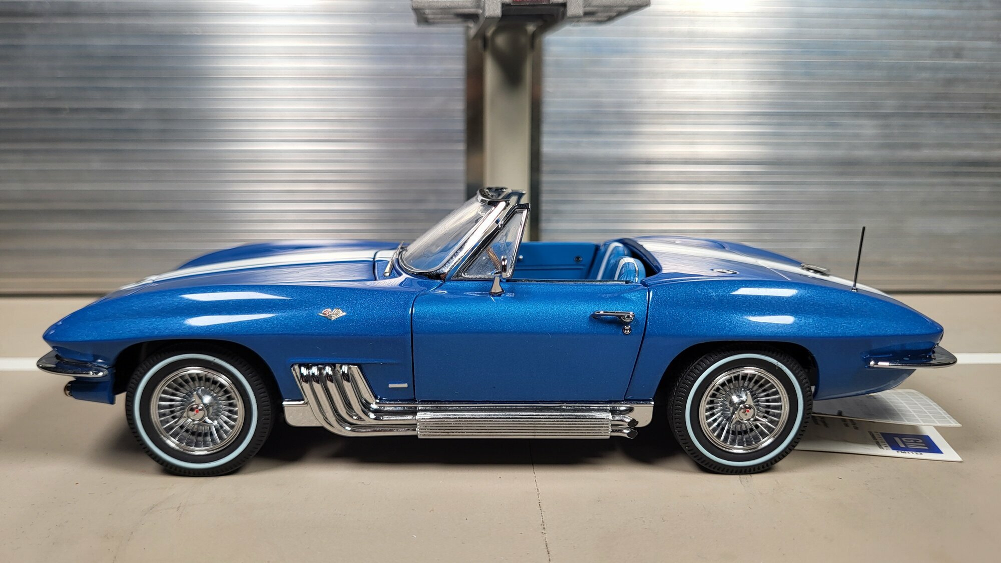 Der hier gezeigte Modellwagen ist ein detailgetreues Abbild des originalen Chevrolet Corvette C2 Convertible von 1963. Dieser Miniaturwagen wurde im 1:24-Maßstab von Franklin Mint gefertigt und besteht hauptsächlich aus Plastikmaterial. Besonderes Augenmerk wurde auf die authentische Wiedergabe der verschiedenen Design-Elemente gelegt, wie zum Beispiel die weißen Rennstreifen, die sich von der Motorhaube bis zum Heck erstrecken, und das auffällige Blau der Karosserie. Dieses Modell ist Teil der Sammlung des Modellbau-Enthusiasten "Phat-T" auf Modelly. Auf den Fotos erkennt man die filigrane Arbeit, die in die Nachbildung des Motors und der Abgasanlage investiert wurde. Selbst kleinste Details wie die Türgriffe, Spiegel und die Innenausstattung sind perfekt nachgebildet.