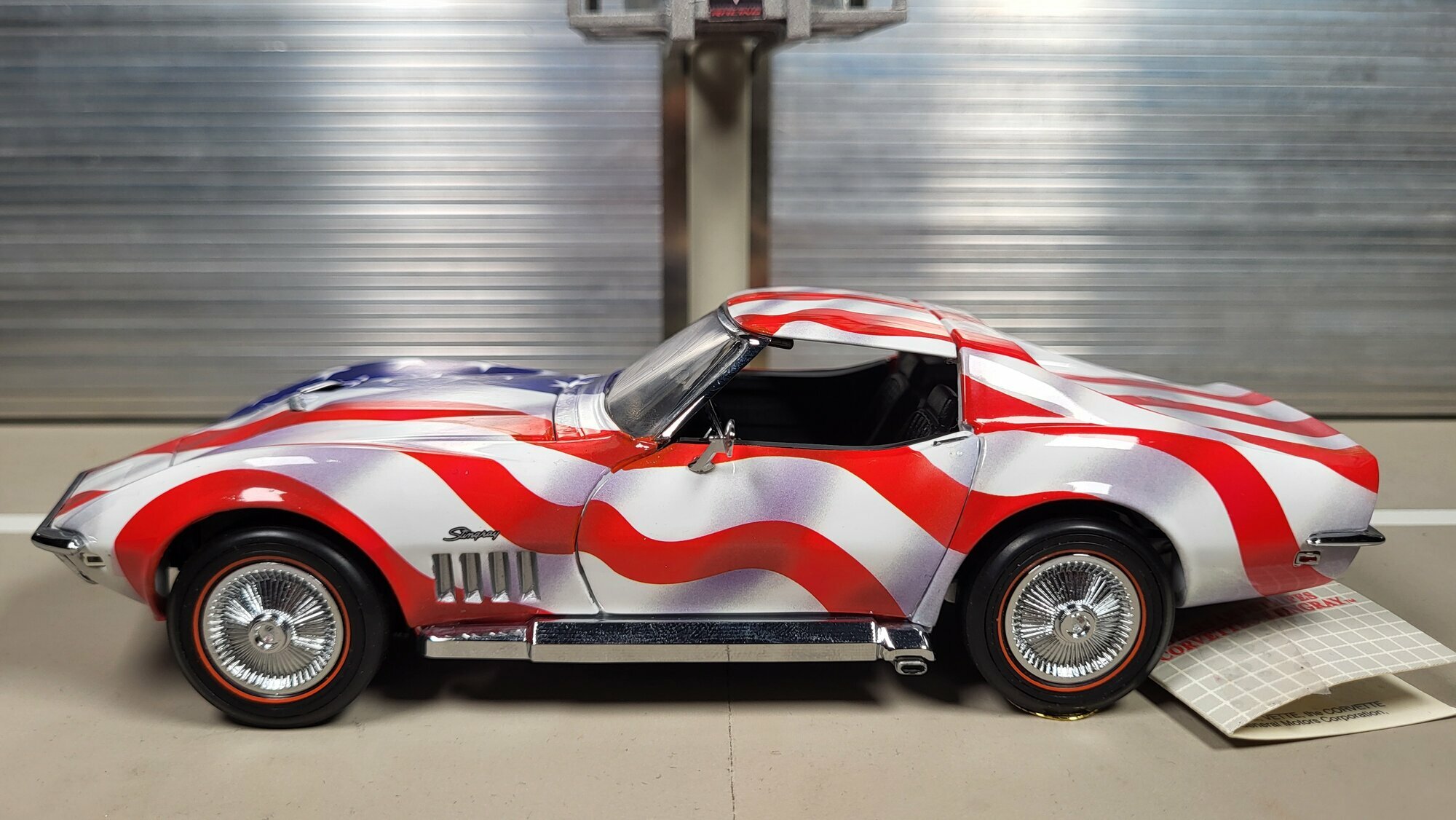 Das hier vorgestellte Modellauto in 1:24-Maßstab stellt die berühmte Chevrolet Corvette C3 in einer einzigartigen Lackierung dar: Die Karosserie ist mit dem Design der amerikanischen Flagge versehen. Diese Nachbildung wird von Franklin Mint hergestellt, einem renommierten Hersteller von maßstabsgetreuen Sammlermodellen, und besteht aus hochwertigem Diecast-Material. Die Lackierung zeigt die charakteristischen roten, weißen und blauen Farben der USA, ergänzt durch weiße Sterne auf dem blauen Hintergrund. Auffällig sind auch die verchromten Akzente und die klassischen Speichenfelgen. Das Modell reproduziert die realistische Linienführung und die ikonische Form der Chevrolet Corvette C3 mit großer Präzision.